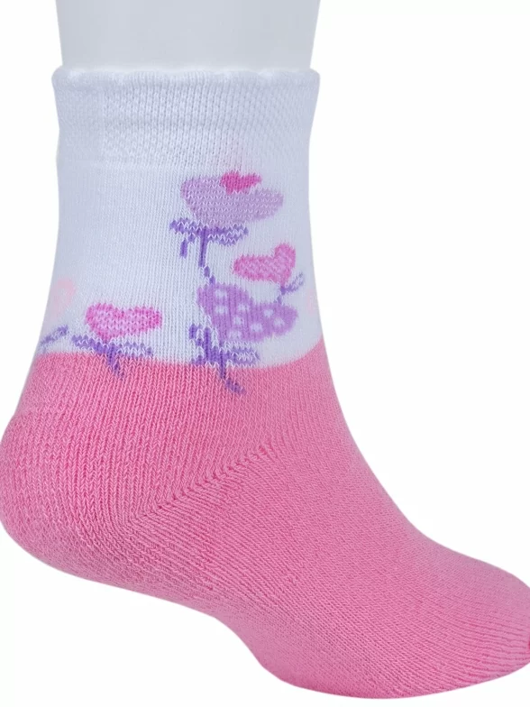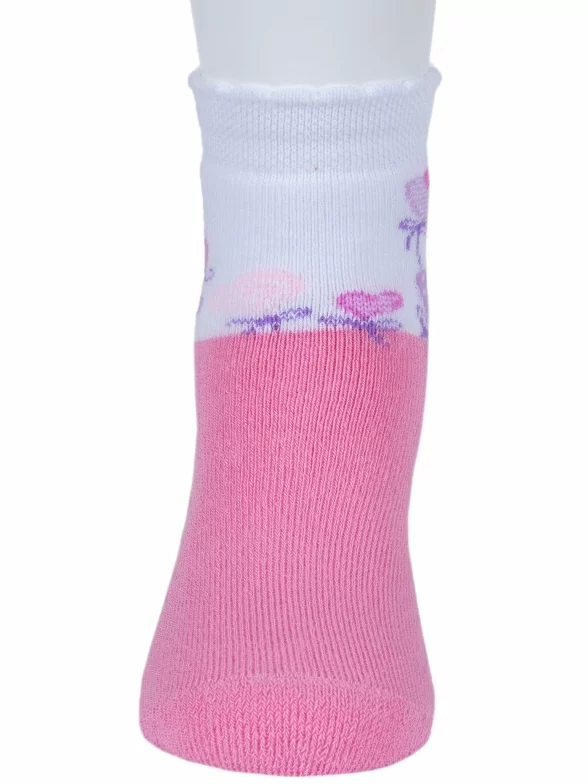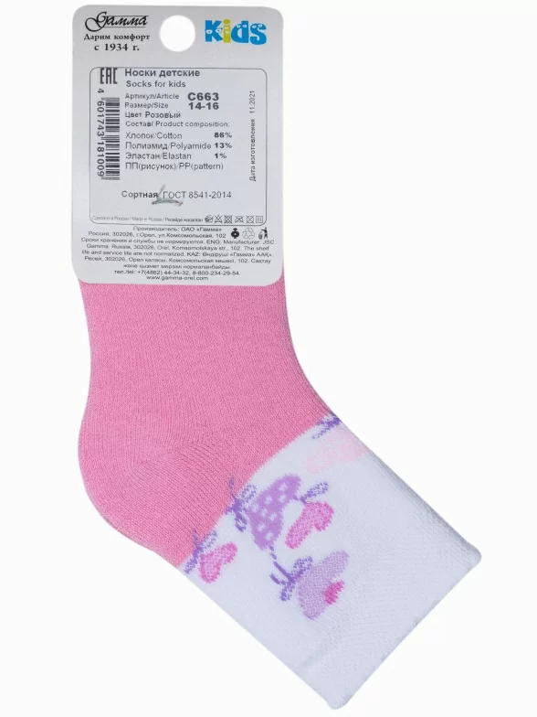 Зимние укороченные детские носки, цвет розовый, теплые, махровые, повседневные, шов обычный (не бесшовные), принт (рисунок): цветы / растения, с узором, состав: 86% хлопок, 13% полиамид, 1% эластан, арт. С663. Производитель «ГАММА» Россия под брендом «Гамма».