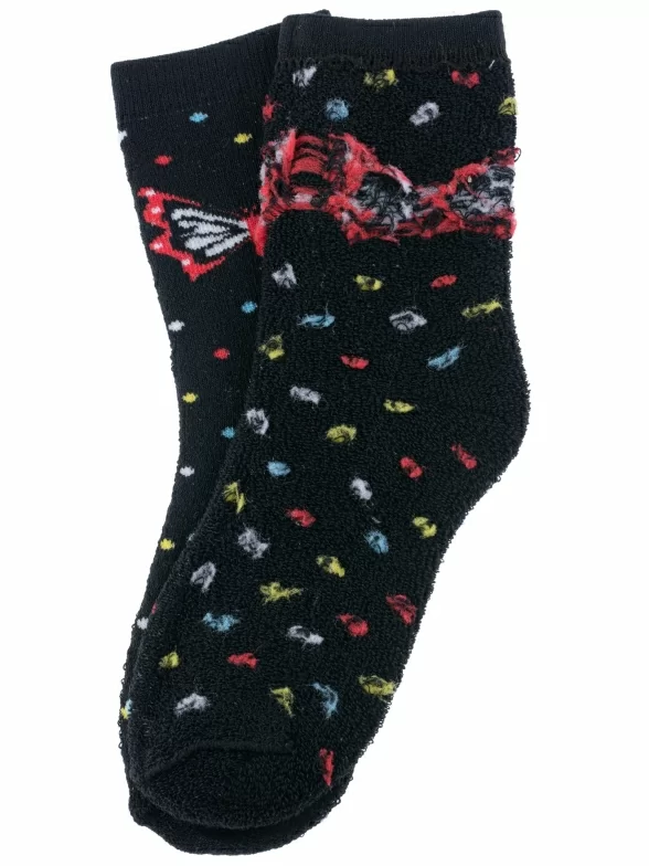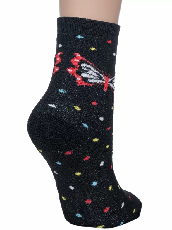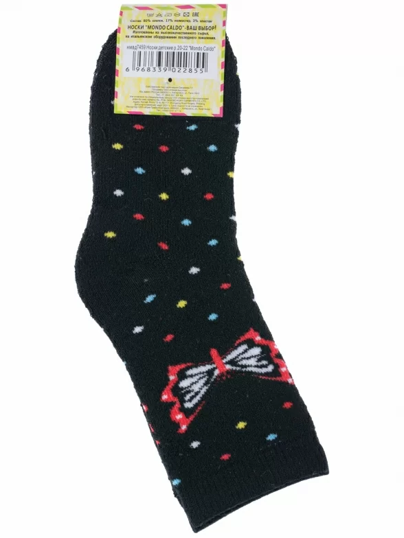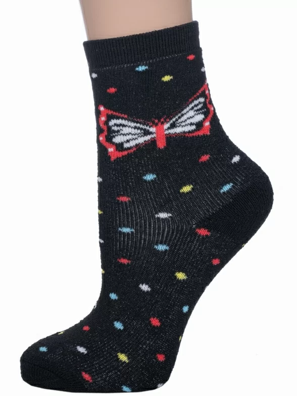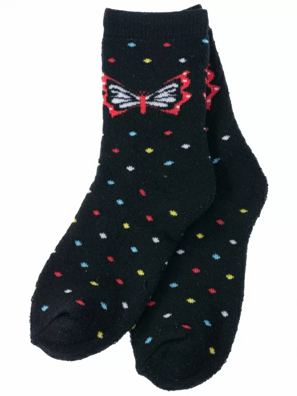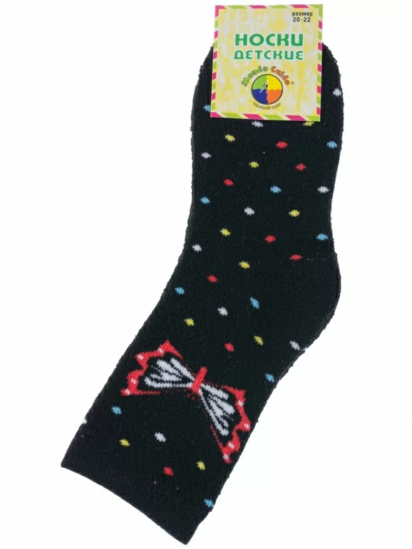 Зимние укороченные детские носки, цвет черный, теплые, махровые, повседневные, шов обычный (не бесшовные), принт (рисунок): бабочки / бантики, с узором, состав: 75% хлопок, 23% полиамид, 2% эластан, арт. 7459. Производитель «Китай, страна бренда - Россия» под брендом «Hobby line».