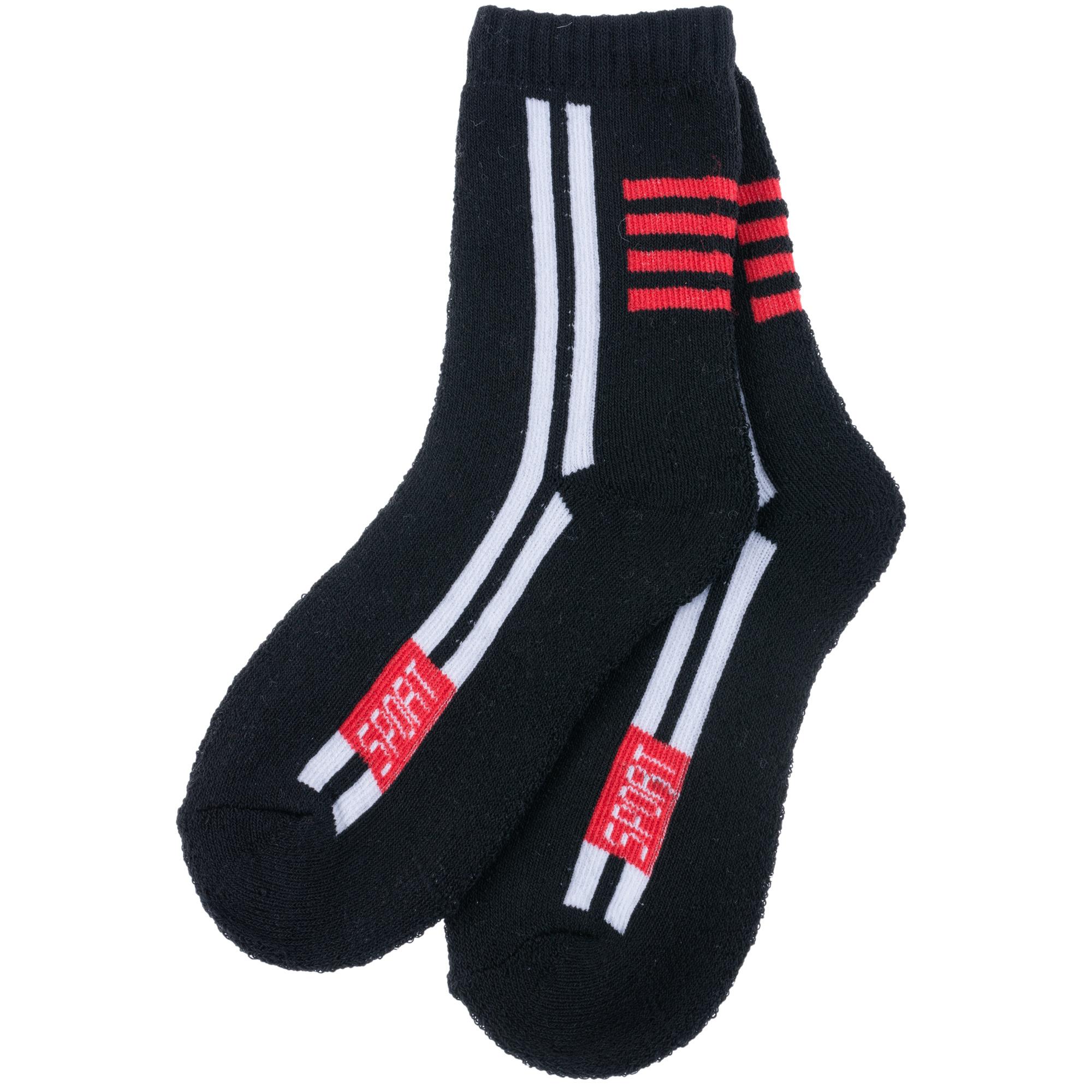 Круглогодичные или зимние средней длины детские носки, цвет черный, теплые, спортивные, махровые, шов обычный (не бесшовные), принт (рисунок): полоски, надписи, однотонный, состав: 80% хлопок, 17% полиэстер, 3% эластан, арт. 7480. Производитель «Китай, страна бренда - Россия» под брендом «Hobby line».