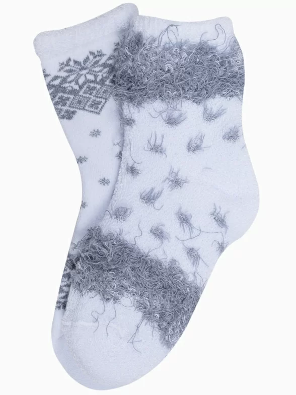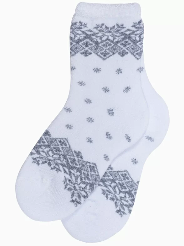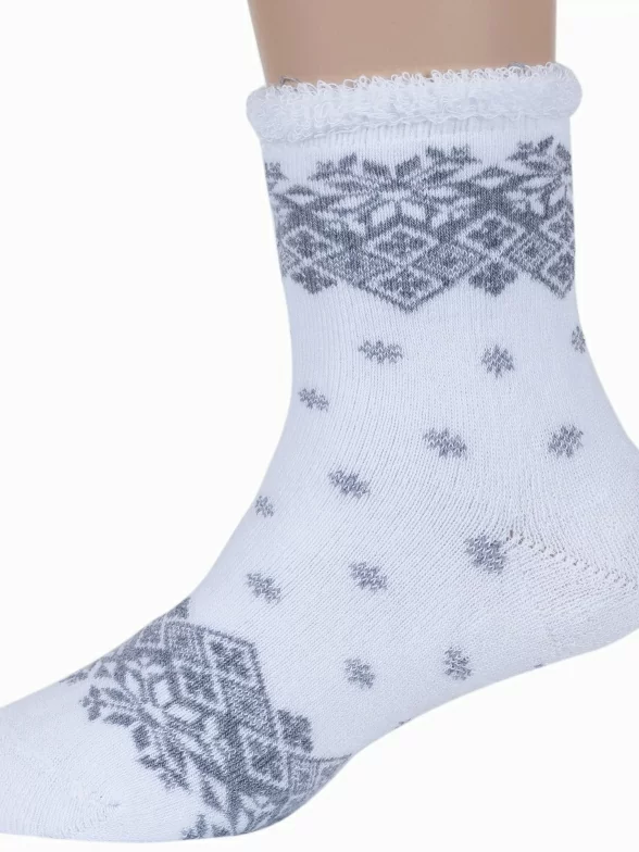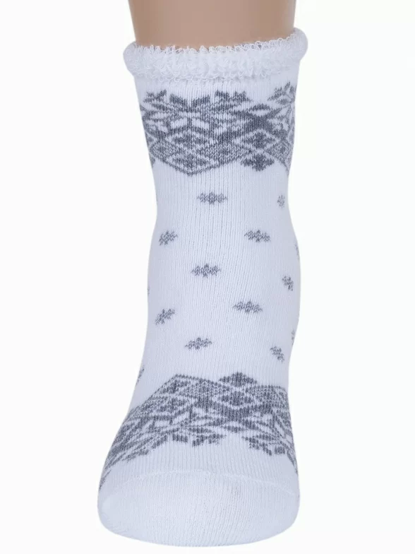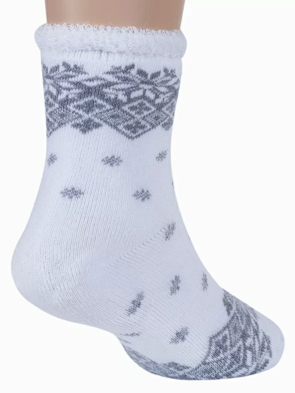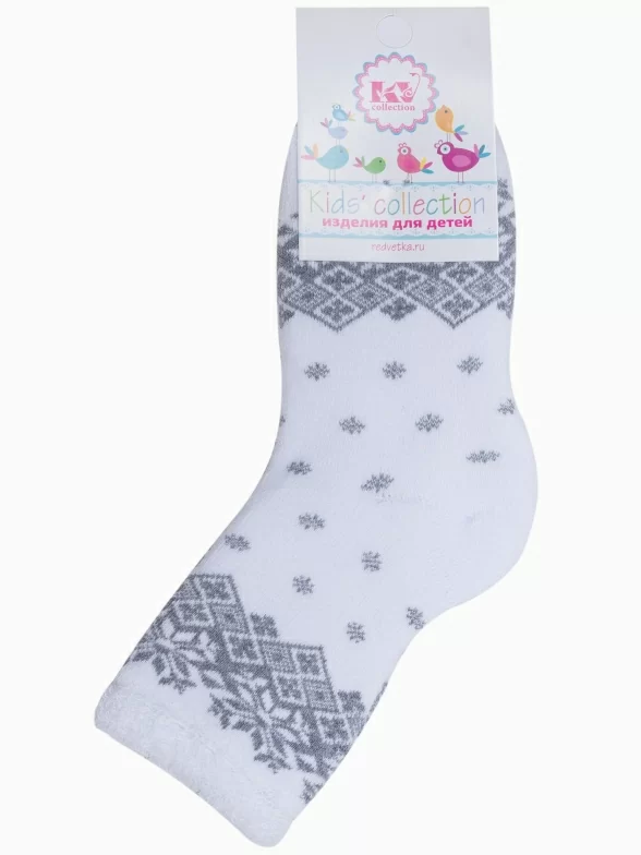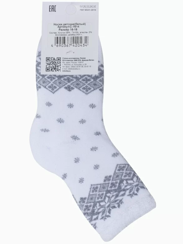 Зимние средней длины детские носки, цвет белый, теплые, махровые, повседневные, возможно бесшовные, принт (рисунок): орнамент, норвежский жаккард, новый год, с узором, состав: 88% хлопок, 9% полиамид, 3% эластан, арт. С-1614. Производитель «КРАСНАЯ ВЕТКА» Россия под брендом «Красная ветка».