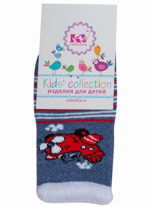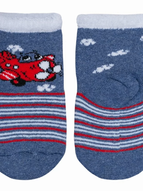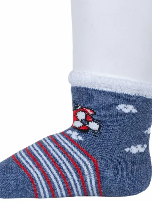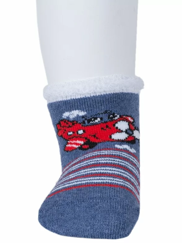Зимние укороченные детские носки, цвет синий-джинс, теплые, махровые, повседневные, возможно бесшовные, принт (рисунок): транспорт, с узором, крупные контрастные рисунки, состав: 61% хлопок, 24% полипропилен, 12% полиамид, 3% эластан, арт. М-650. Производитель «КРАСНАЯ ВЕТКА» Россия под брендом «Красная ветка».