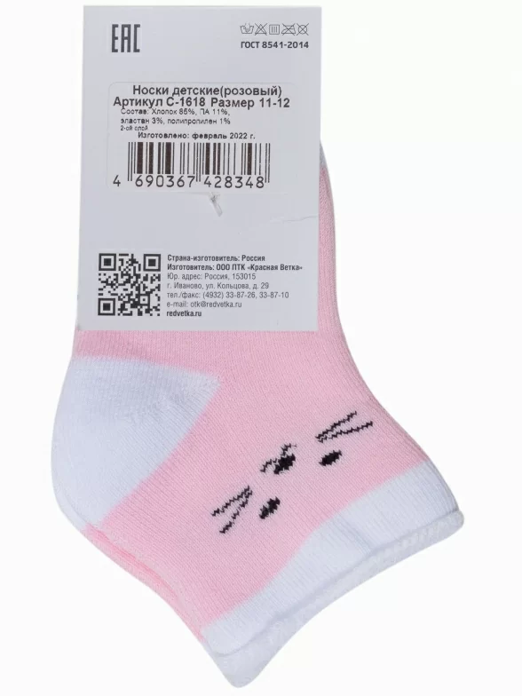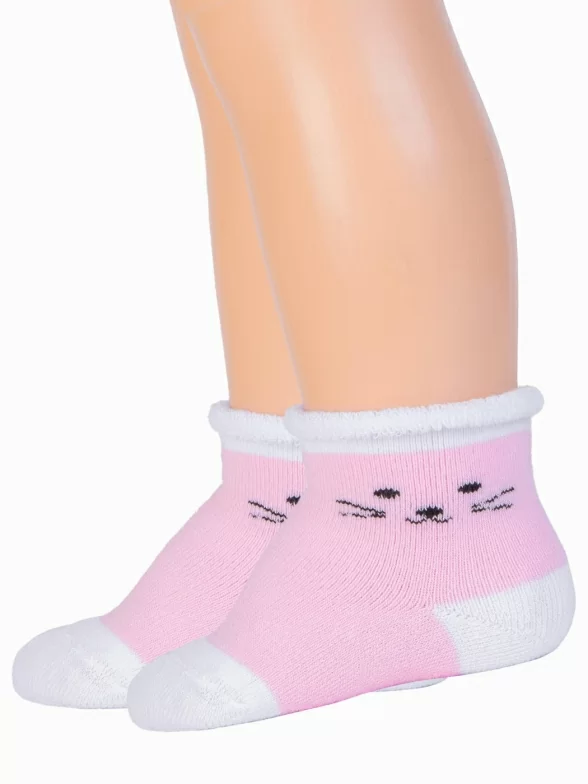 Зимние укороченные детские носки, цвет розовый, теплые, махровые, возможно бесшовные, принт (рисунок): животные, состав: 85% хлопок, 11% полиамид, 3% эластан, 1% полипропилен, арт. С-1618. Производитель «КРАСНАЯ ВЕТКА» Россия под брендом «Красная ветка».