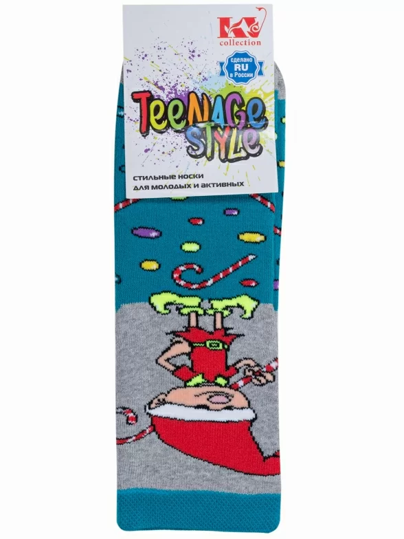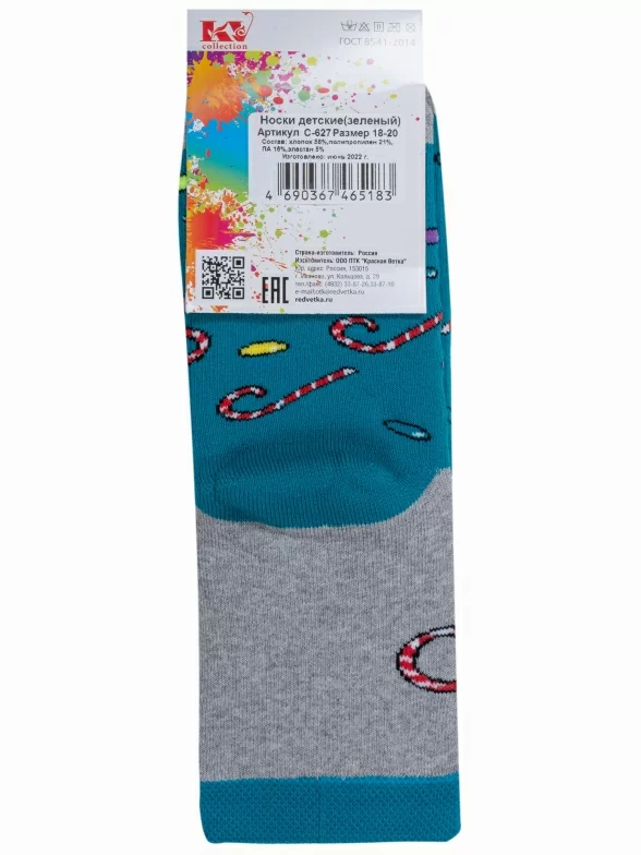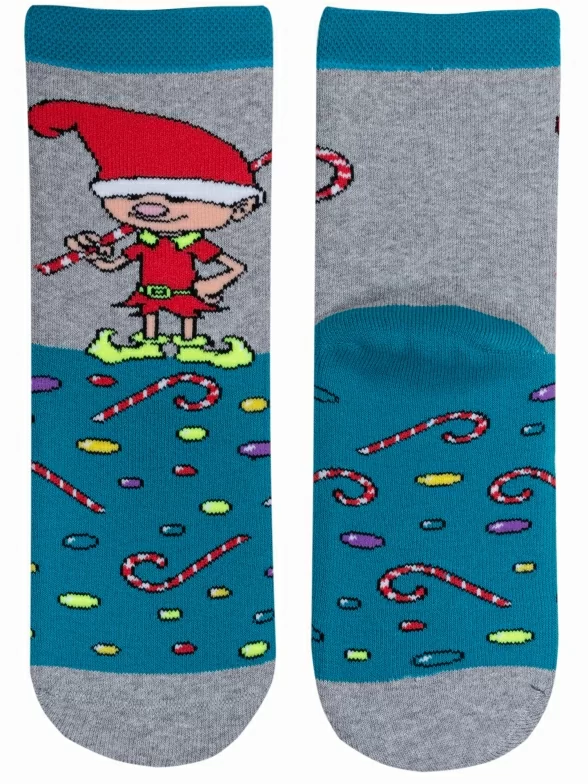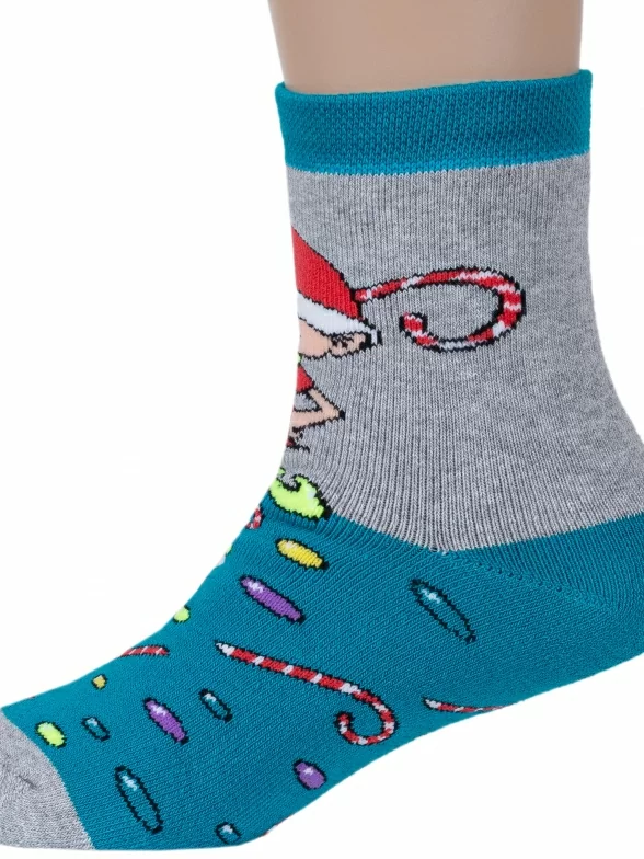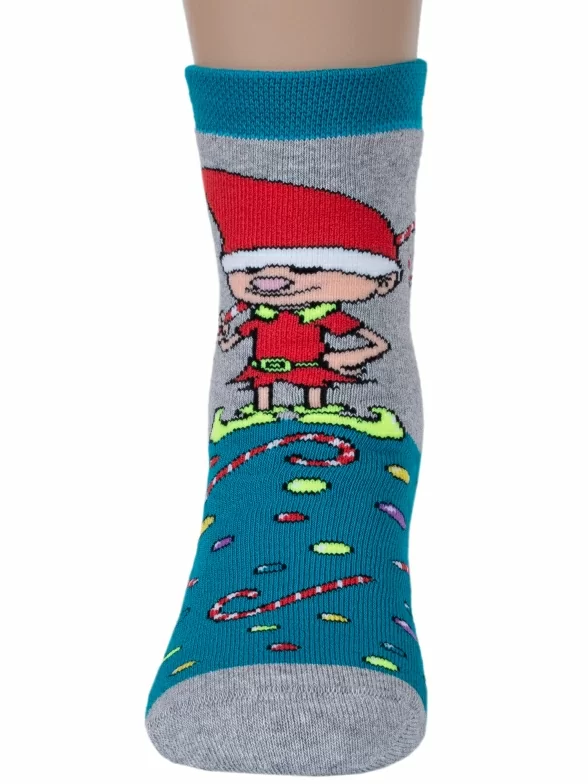 Зимние укороченные детские носки, цвет бирюзовый, теплые, махровые, повседневные, возможно бесшовные, принт (рисунок): новый год, с узором, крупные контрастные рисунки, состав: 58% хлопок, 16% полиамид, 21% полипропилен, 5% эластан, арт. С-627. Производитель «КРАСНАЯ ВЕТКА» Россия под брендом «Красная ветка».