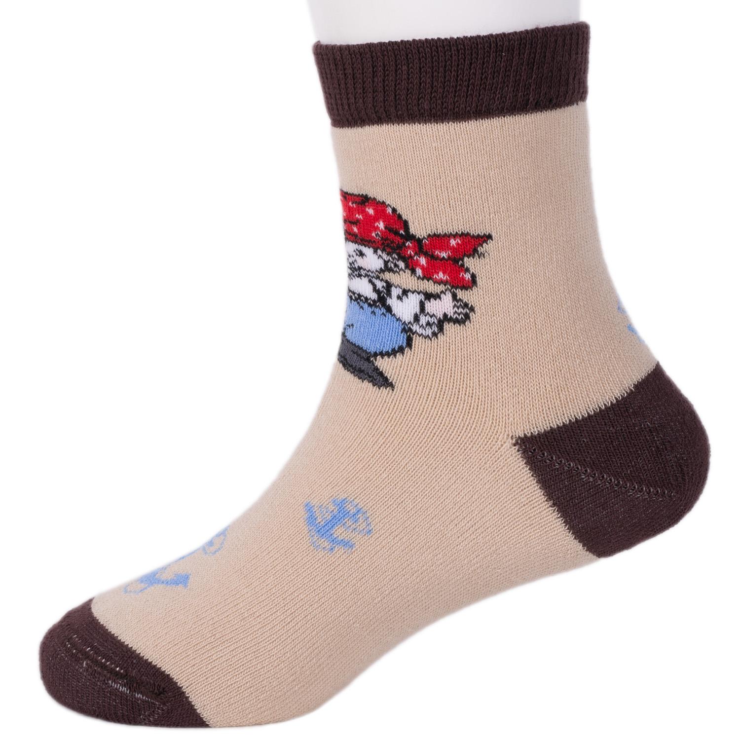Красивые носки для детей бежево-коричневого цвета. Производитель LORENZLine. Изготовлены в России на современном оборудовании, с использованием высококачественного хлопкового сырья. Состоят на 90% из хлопка. Модель с забавным пиратским принтом, который понравится каждому ребенку.