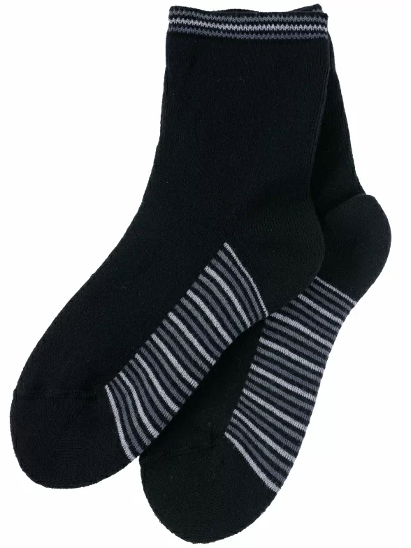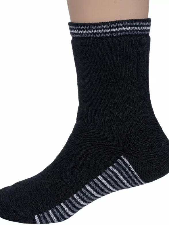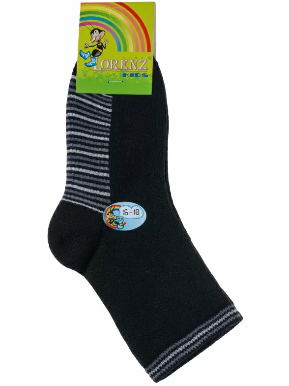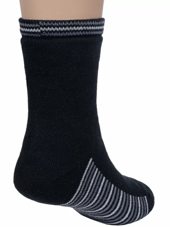 Зимние укороченные детские носки, цвет черный, теплые, махровые, классические, шов обычный (не бесшовные), принт (рисунок): контрастные пятка / мысок / резинка, с узором, состав: 90% хлопок, 7% полиамид, 3% эластан (лайкра), арт. Л37М. Производитель «ИП Мурзаков В.А., Ставропольский край, Россия» под брендом «Lorenzline».