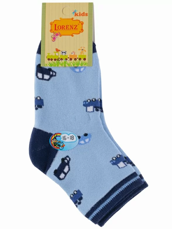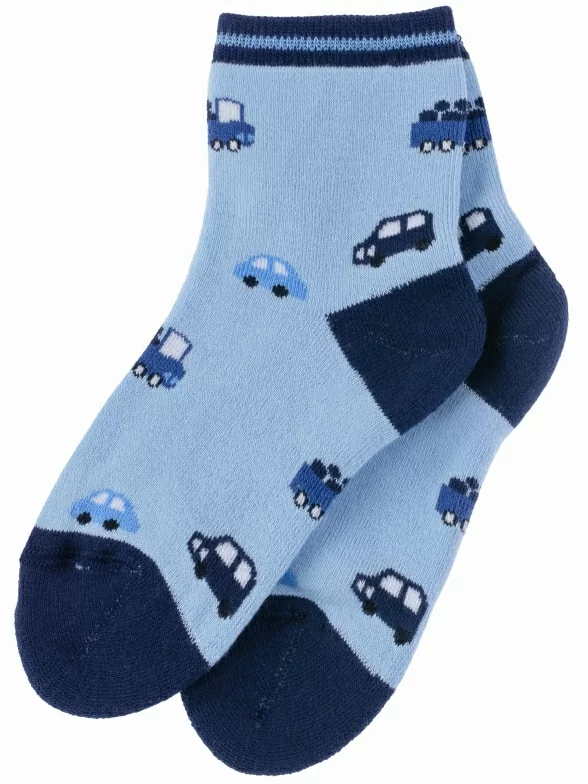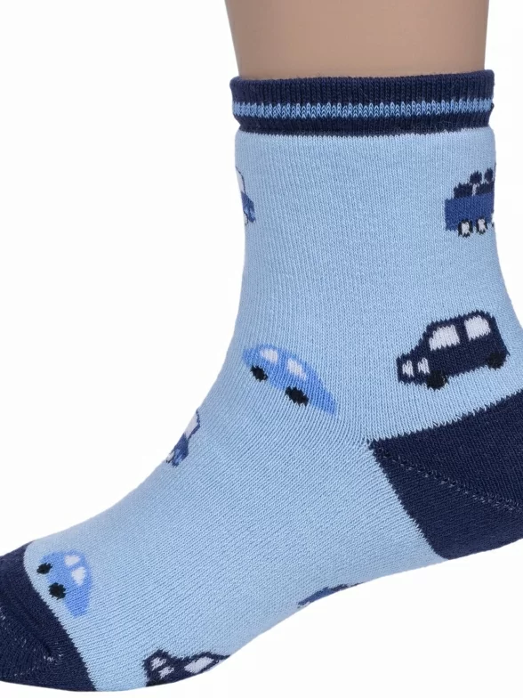 Зимние укороченные детские носки, цвет голубой, теплые, махровые, повседневные, шов обычный (не бесшовные), принт (рисунок): транспорт, с узором, состав: 90% хлопок, 7% полиамид, 3% эластан (лайкра), арт. Л6. Производитель «ИП Мурзаков В.А., Ставропольский край, Россия» под брендом «Lorenzline».