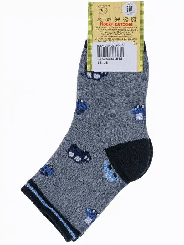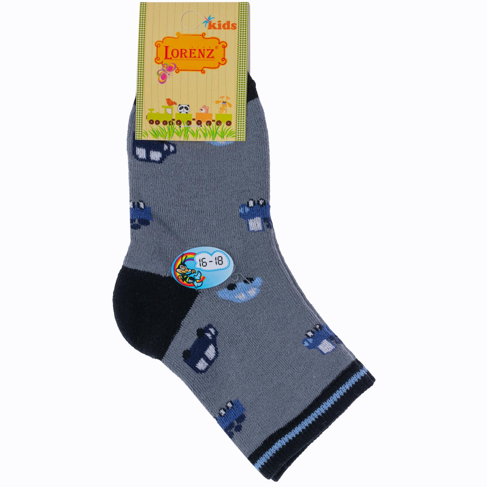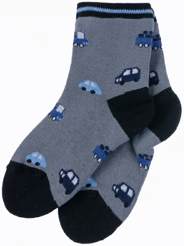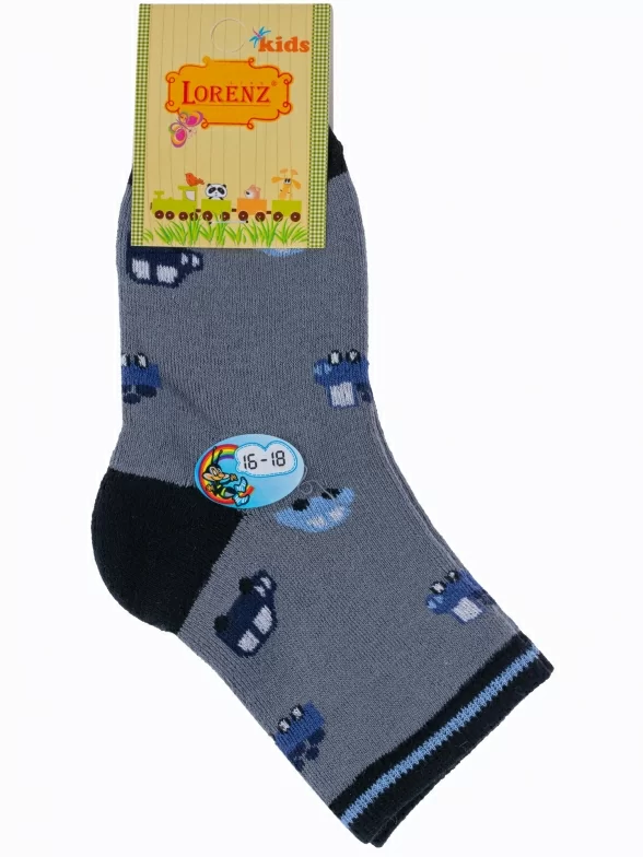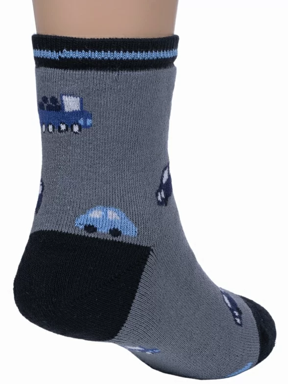 Зимние укороченные детские носки, цвет серый, теплые, махровые, повседневные, шов обычный (не бесшовные), принт (рисунок): транспорт, с узором, состав: 90% хлопок, 7% полиамид, 3% эластан (лайкра), арт. Л6. Производитель «ИП Мурзаков В.А., Ставропольский край, Россия» под брендом «Lorenzline».