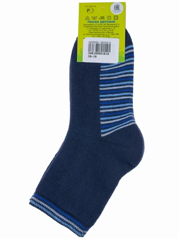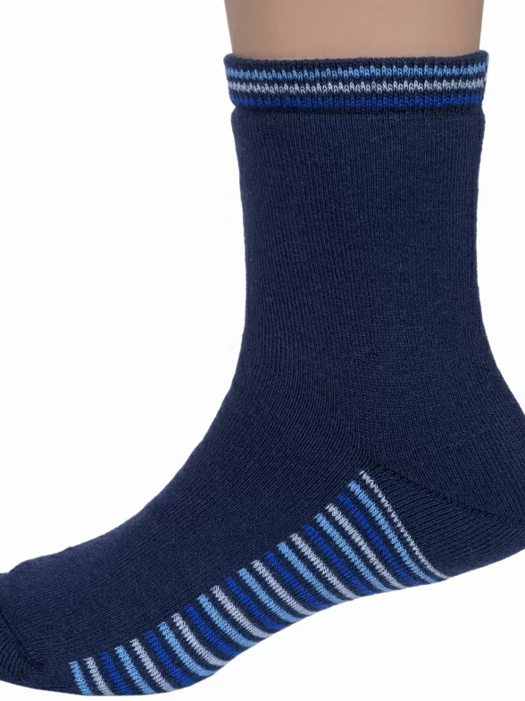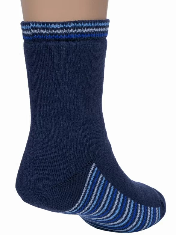 Зимние укороченные детские носки, цвет темно-синий, теплые, махровые, классические, шов обычный (не бесшовные), принт (рисунок): контрастные пятка / мысок / резинка, с узором, состав: 90% хлопок, 7% полиамид, 3% эластан (лайкра), арт. Л37М. Производитель «ИП Мурзаков В.А., Ставропольский край, Россия» под брендом «Lorenzline».