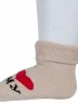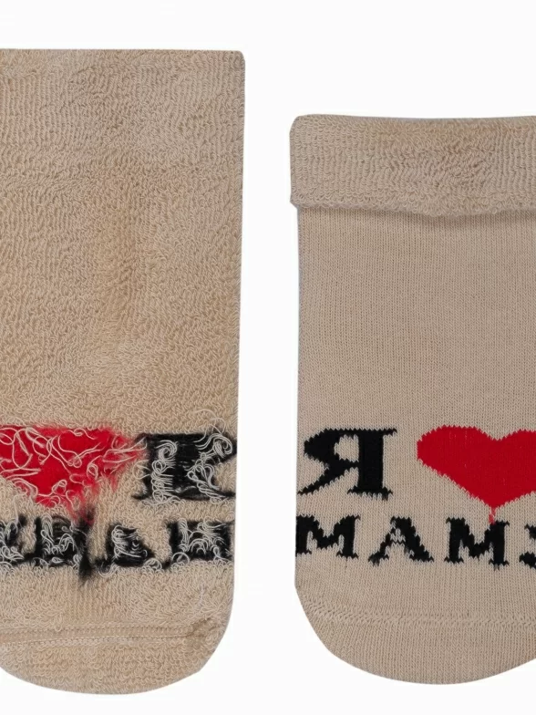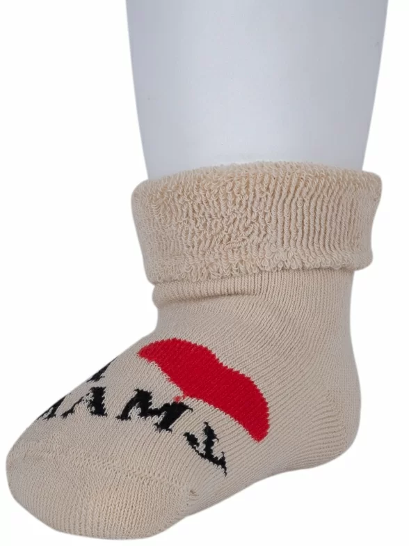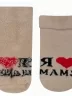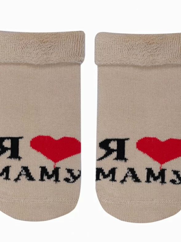 Круглогодичные или зимние укороченные детские носки, цвет бежевый, теплые, повседневные, с отворотом, махровые, шов кеттельный (бесшовная технология), принт (рисунок): сердечки / поцелуи / любовь, надписи, с узором, крупные контрастные рисунки, состав: 88% хлопок, 10% полиамид, 2% эластан, арт. Д-111-01. Производитель «ООО Орудьевский трикотаж, Россия» под брендом «Rusocks (орудьевский трикотаж)».