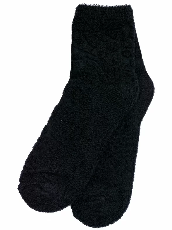 Зимние средней длины детские носки, цвет черный, махровые, теплые, классические, шов обычный (не бесшовные), принт (рисунок): цветы / растения, с узором, однотонный, состав: 88% хлопок, 10% полиамид, 2% эластан, арт. Д-33301. Производитель «ООО Орудьевский трикотаж, Россия» под брендом «Rusocks (орудьевский трикотаж)».