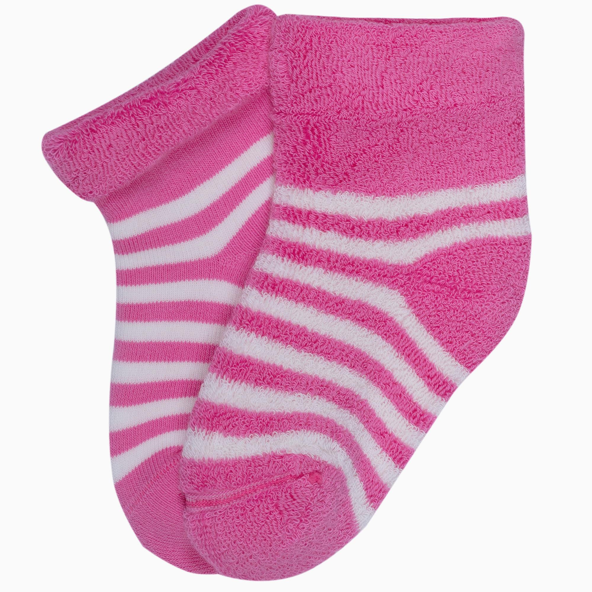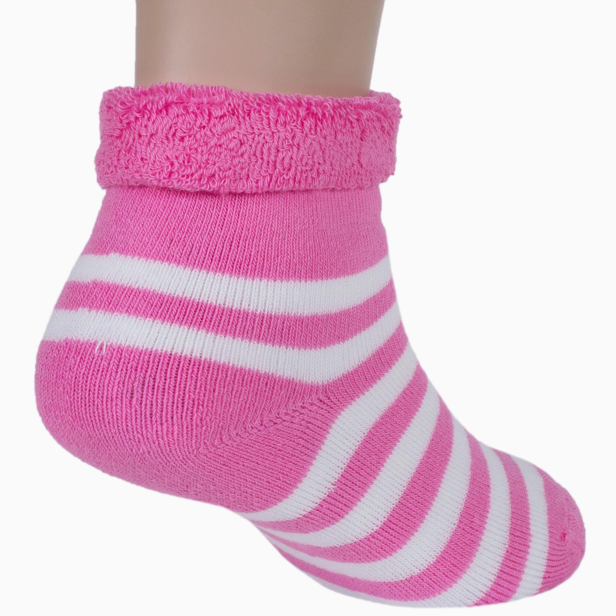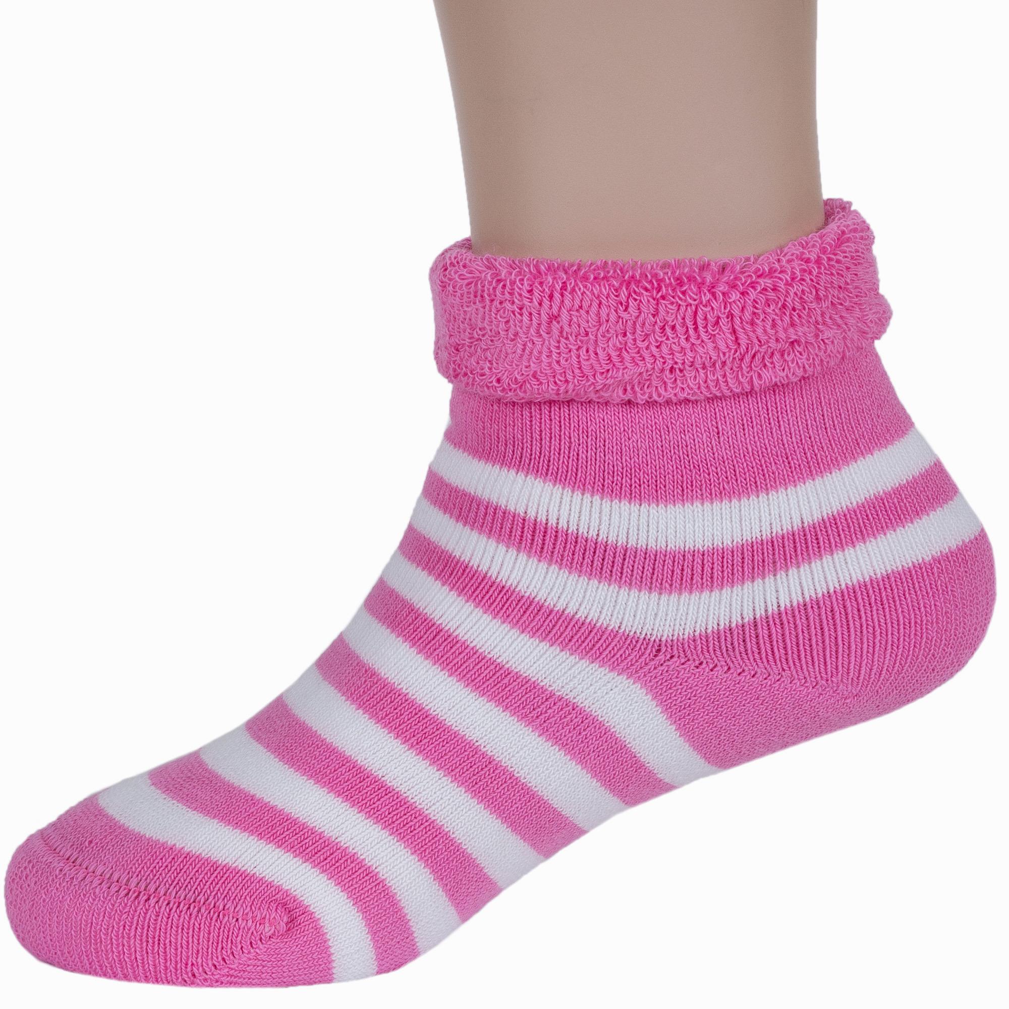 Круглогодичные укороченные детские носки, цвет фуксия-розовый, классические, махровые, с отворотом, теплые, шов кеттельный (бесшовная технология), принт (рисунок): полоски, с узором, состав: 88% хлопок, 10% полиамид, 2% эластан, арт. Д-109. Производитель «ООО Орудьевский трикотаж, Россия» под брендом «Rusocks (орудьевский трикотаж)».