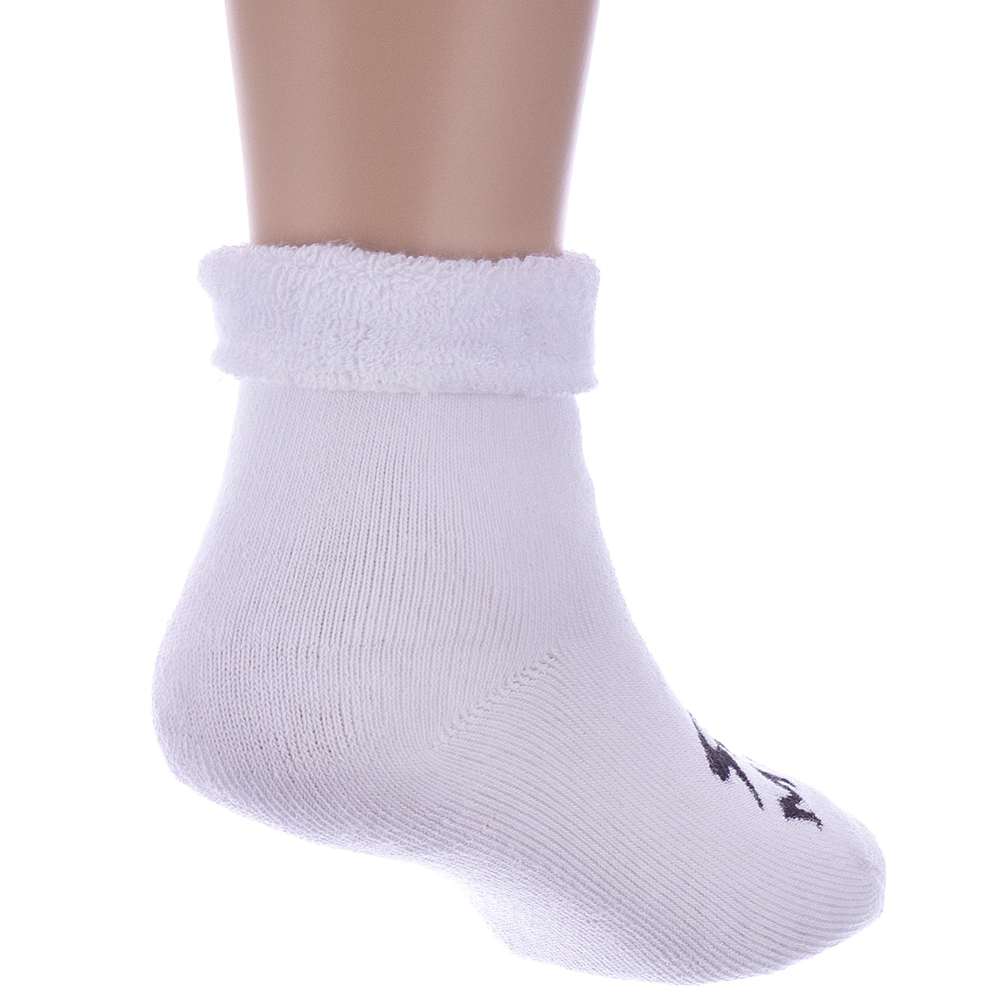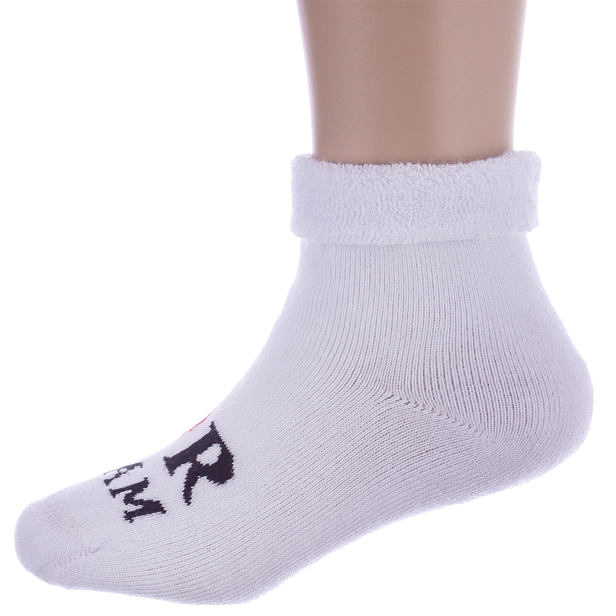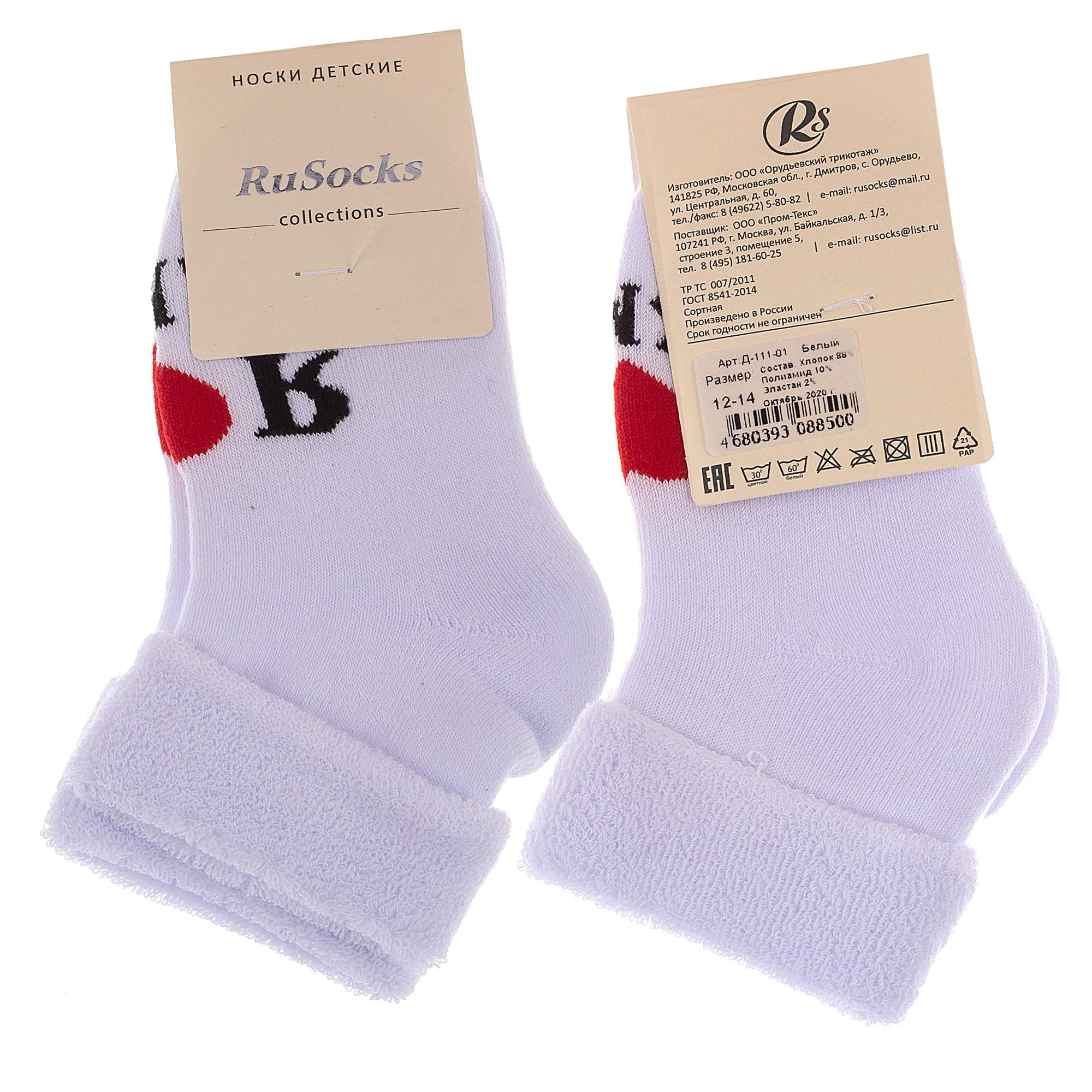 Зимние или межсезонные укороченные детские носки, цвет белый, махровые, с отворотом, с принтом, теплые, состав: 88% хлопок, 10% полиамид, 2% эластан, арт. Д-111-01. Производитель «ООО Орудьевский трикотаж, Россия» под брендом «Rusocks (орудьевский трикотаж)».
