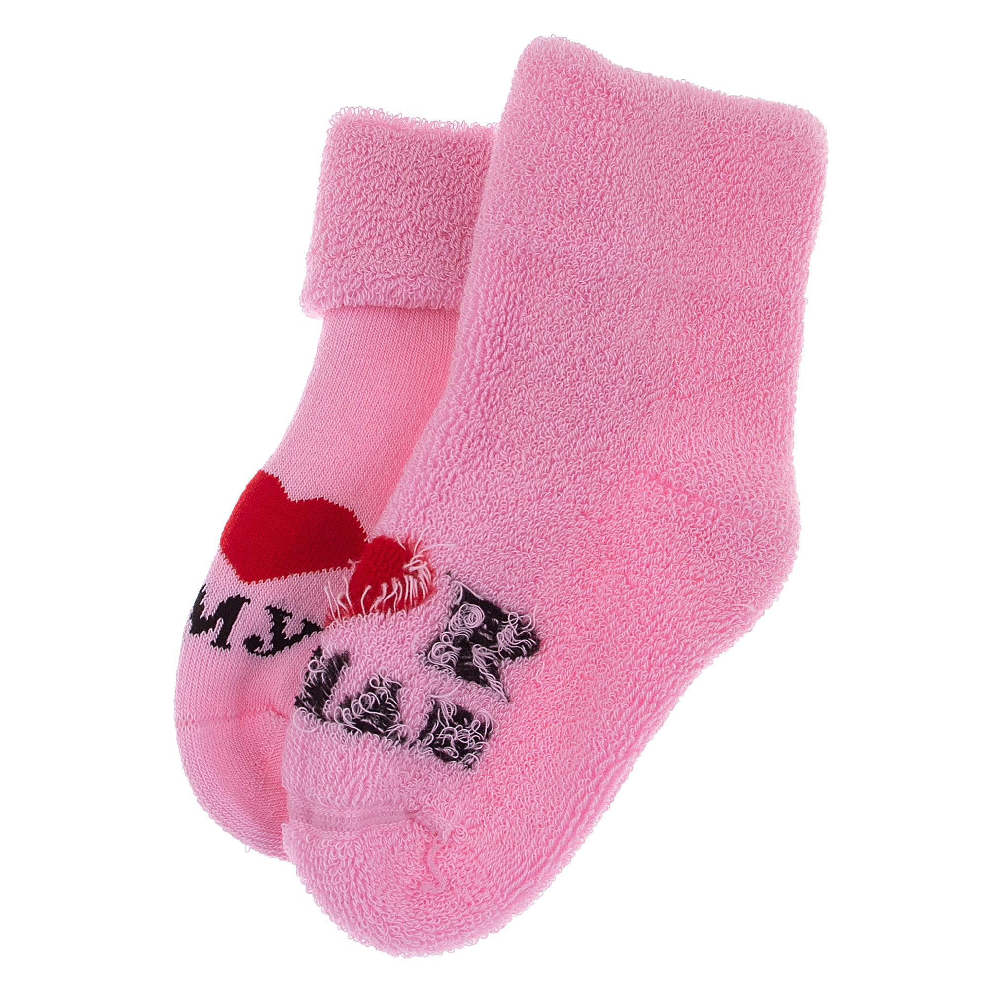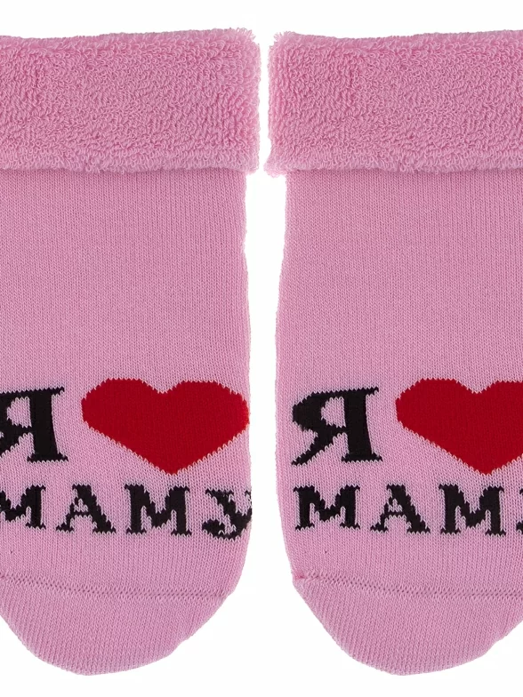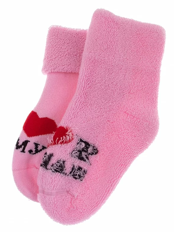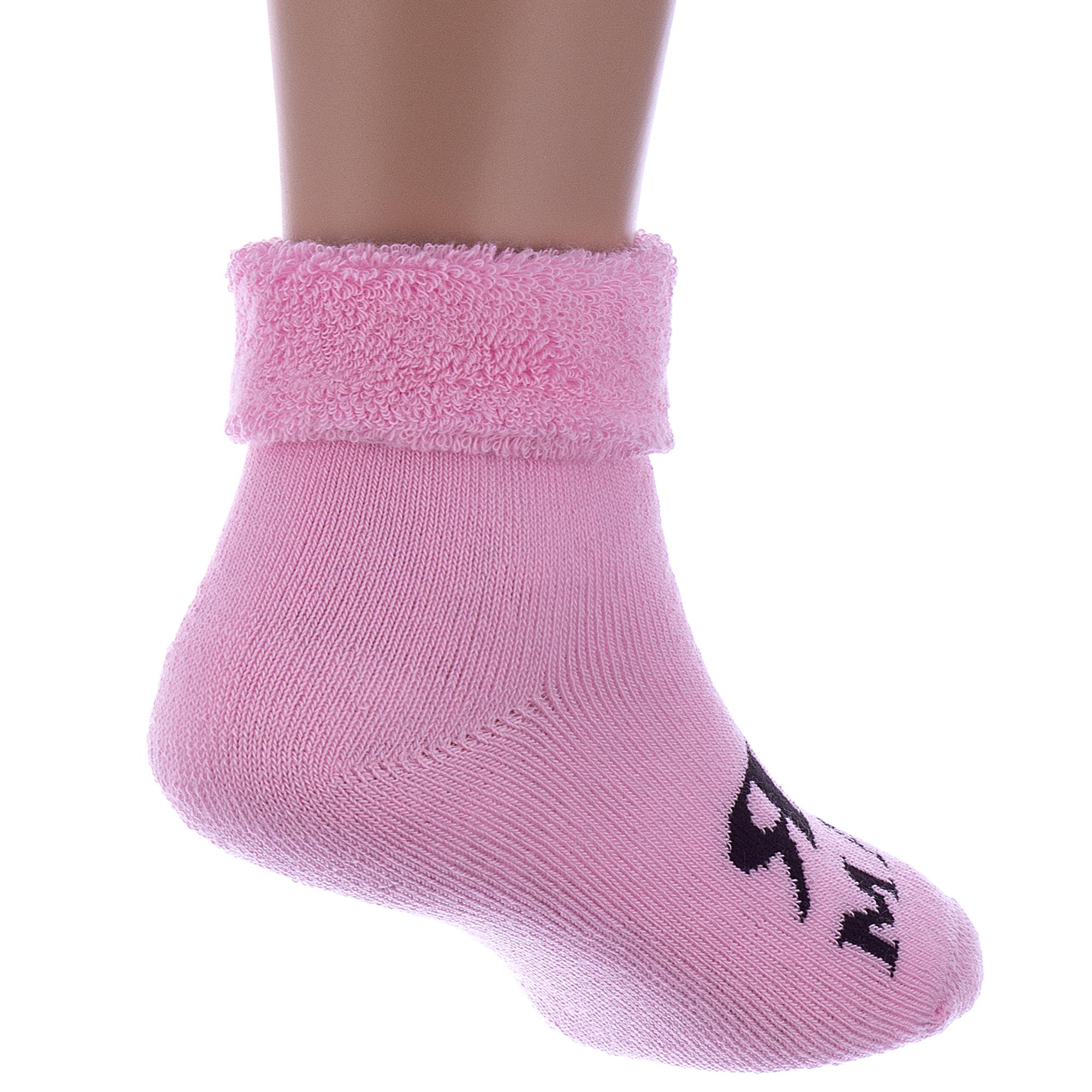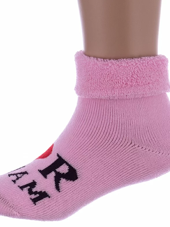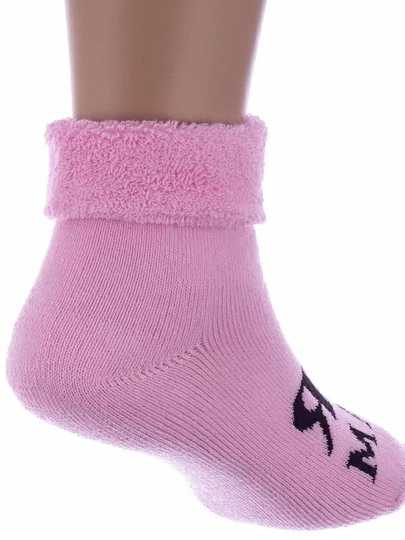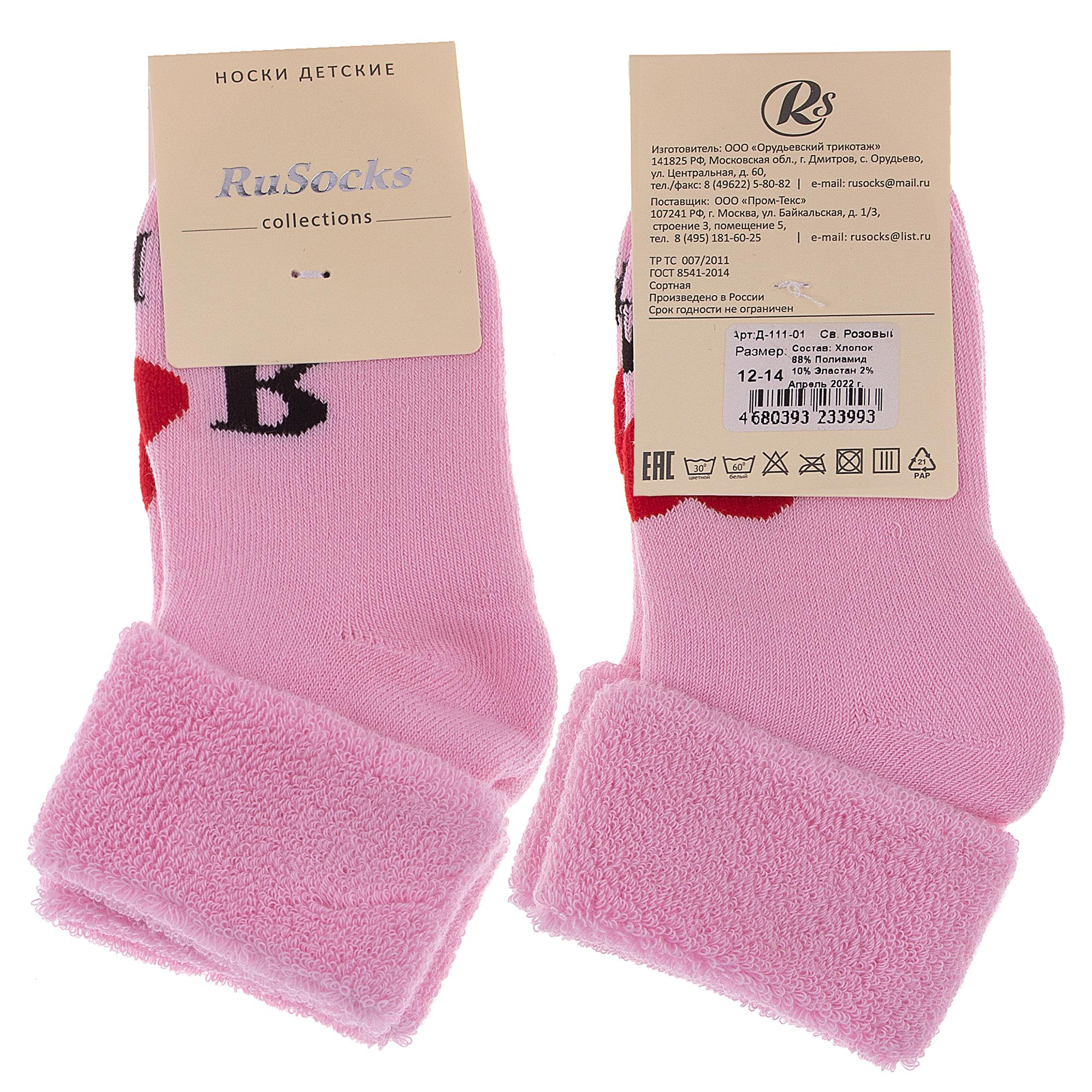 Зимние или межсезонные укороченные детские носки, цвет розовый, махровые, с отворотом, с принтом, теплые, состав: 88% хлопок, 10% полиамид, 2% эластан, арт. Д-111-01. Производитель «ООО Орудьевский трикотаж, Россия» под брендом «Rusocks (орудьевский трикотаж)».
