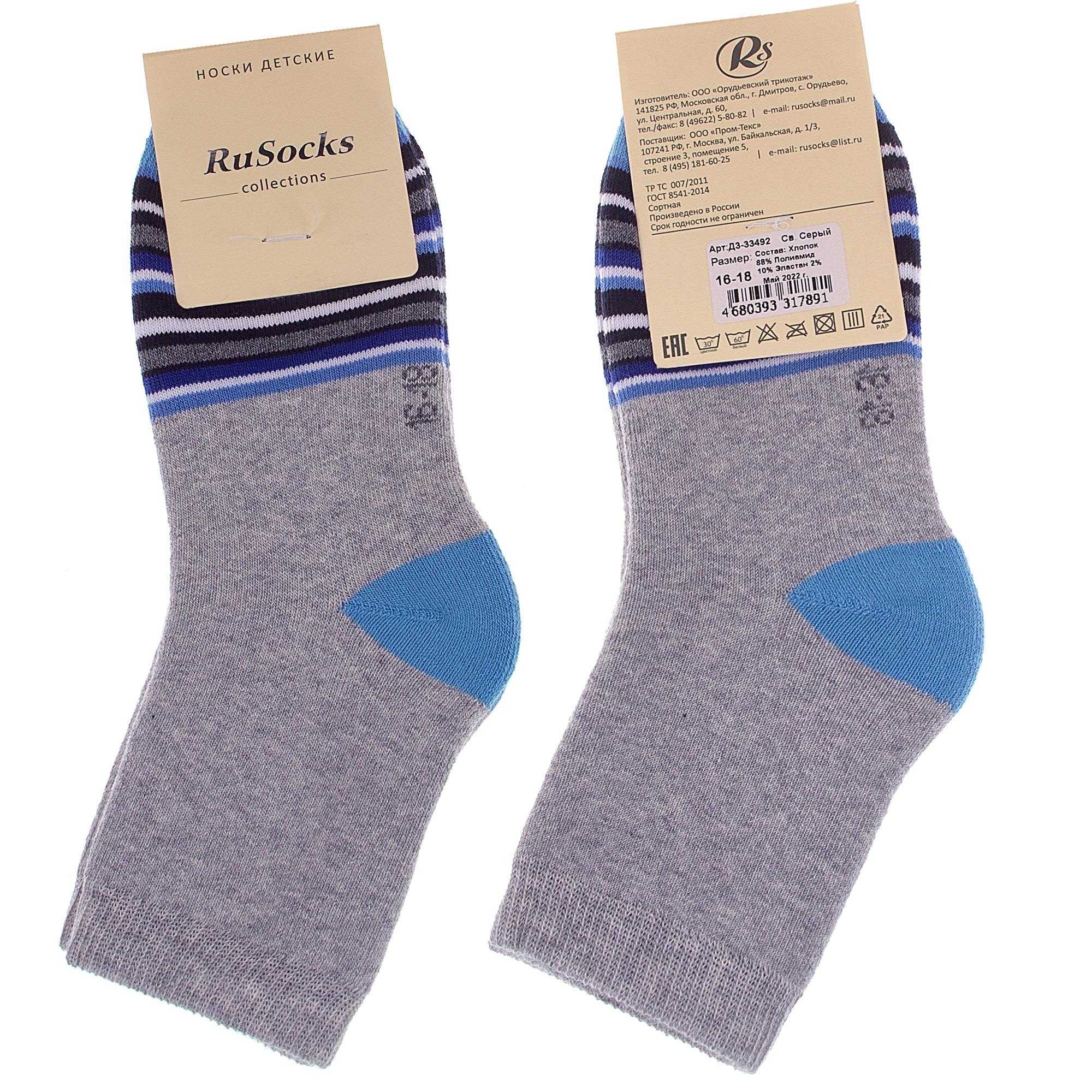 Межсезонные или зимние укороченные детские носки, цвет светло-серый, теплые, с принтом, махровые, состав: 88% хлопок, 10% полиамид, 2% эластан, арт. Д3-33492. Производитель «ООО Орудьевский трикотаж, Россия» под брендом «Rusocks (орудьевский трикотаж)».