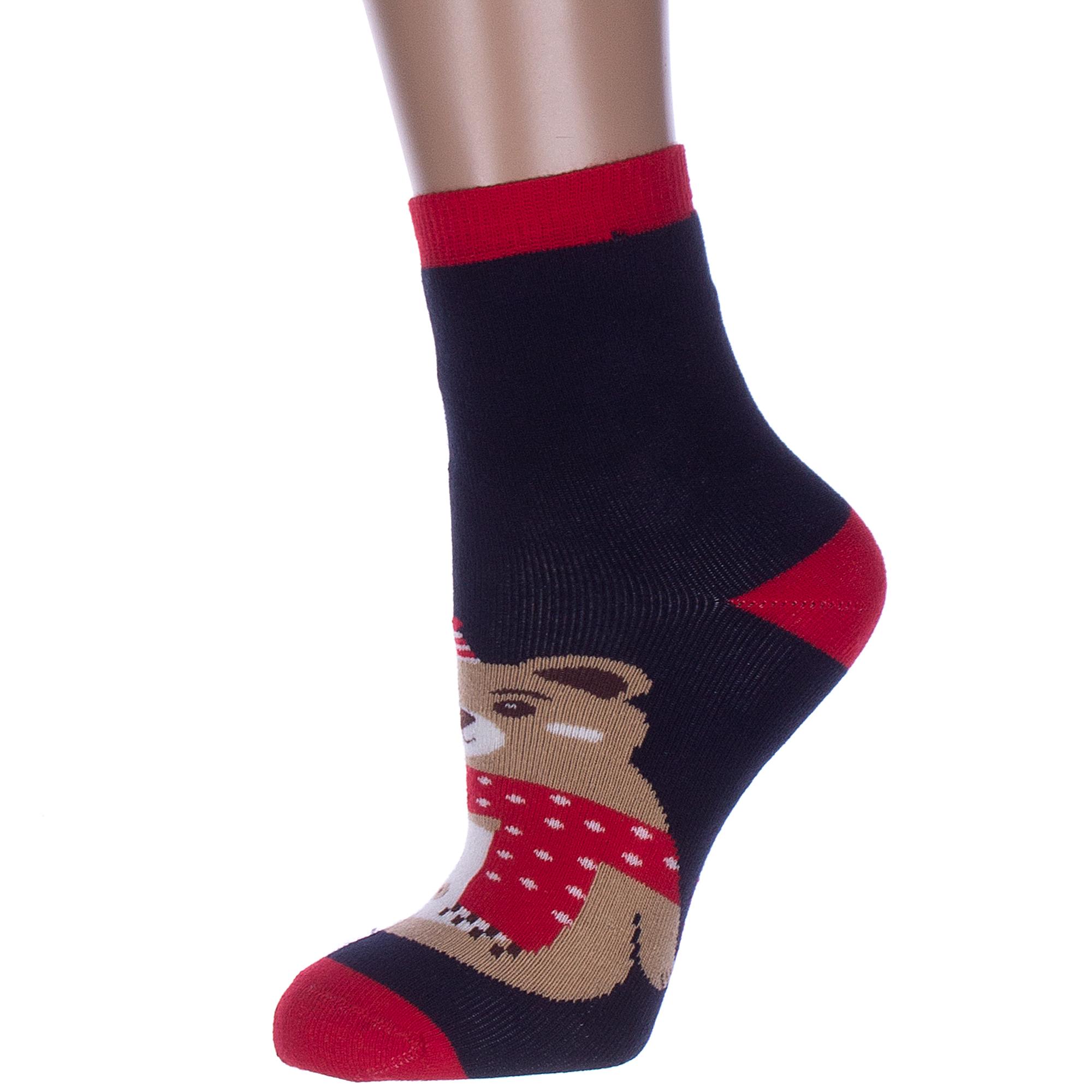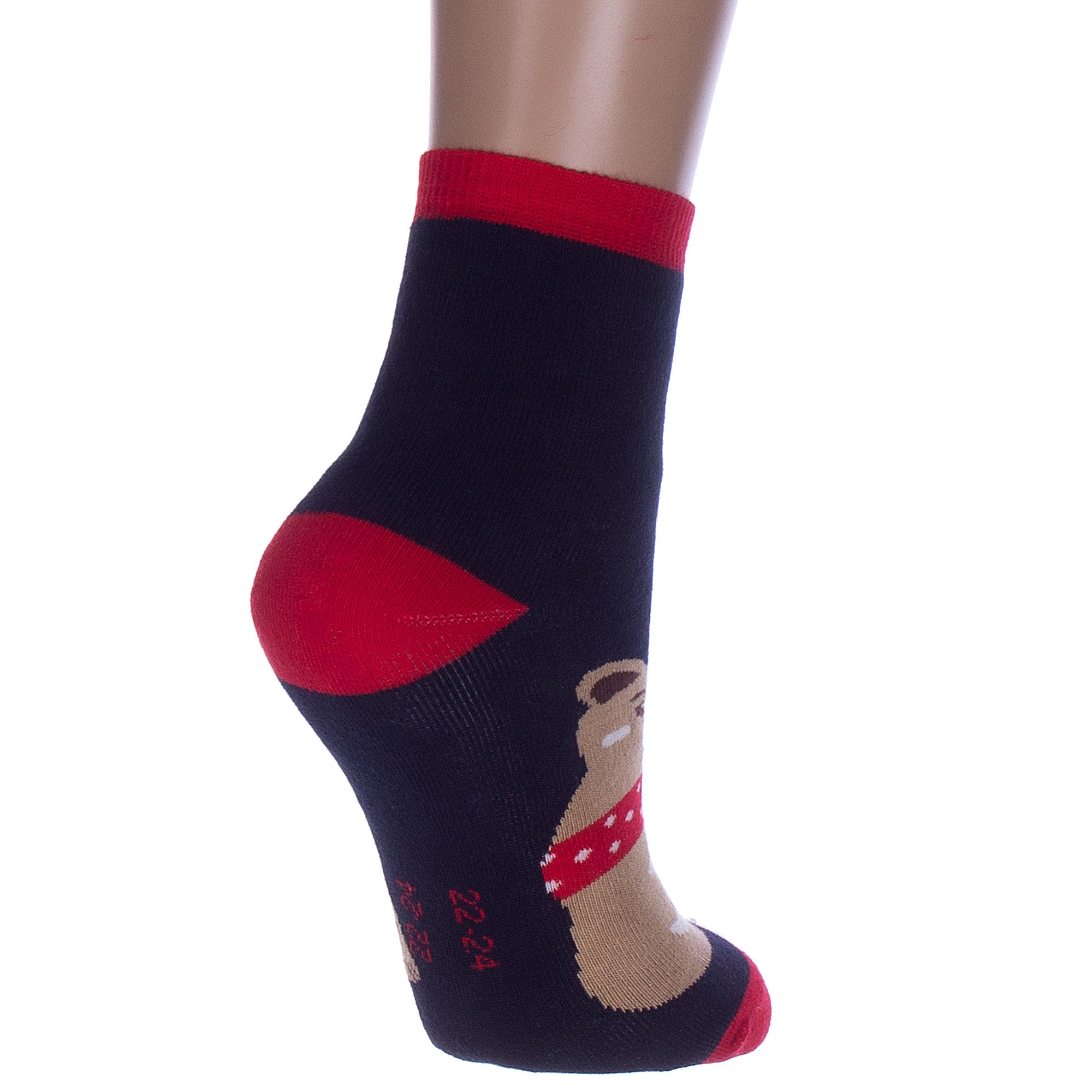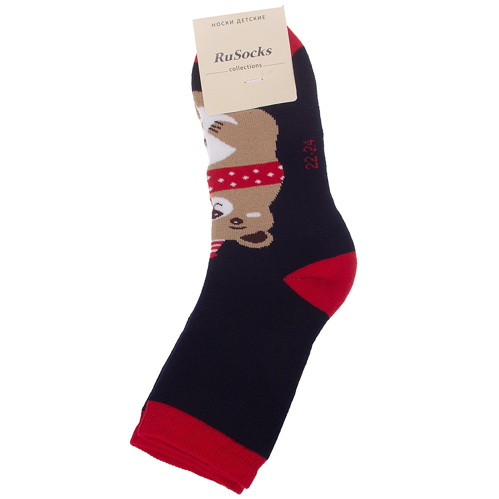 Межсезонные или зимние укороченные детские носки, цвет темно-синий, теплые, повседневные, махровые, шов кеттельный (бесшовная технология), принт (рисунок): новый год, контрастные пятка / мысок / резинка, зимний, животные, с узором, крупные контрастные рисунки, состав: 88% хлопок, 10% полиамид, 2% эластан, арт. Д3-33494. Производитель «ООО Орудьевский трикотаж, Россия» под брендом «Rusocks (орудьевский трикотаж)».