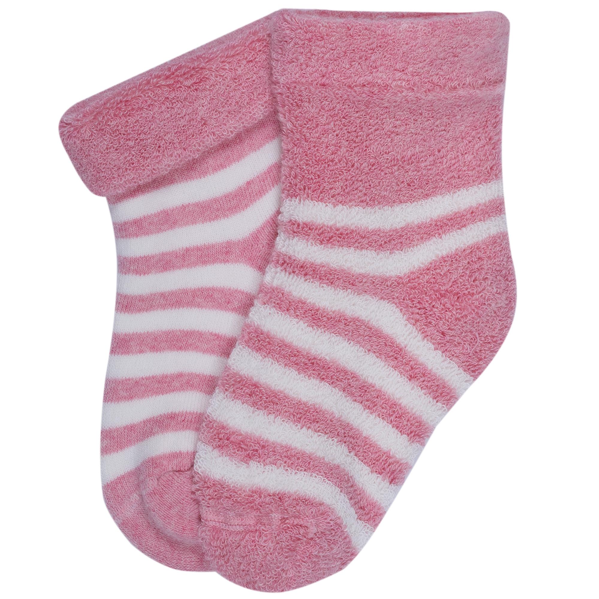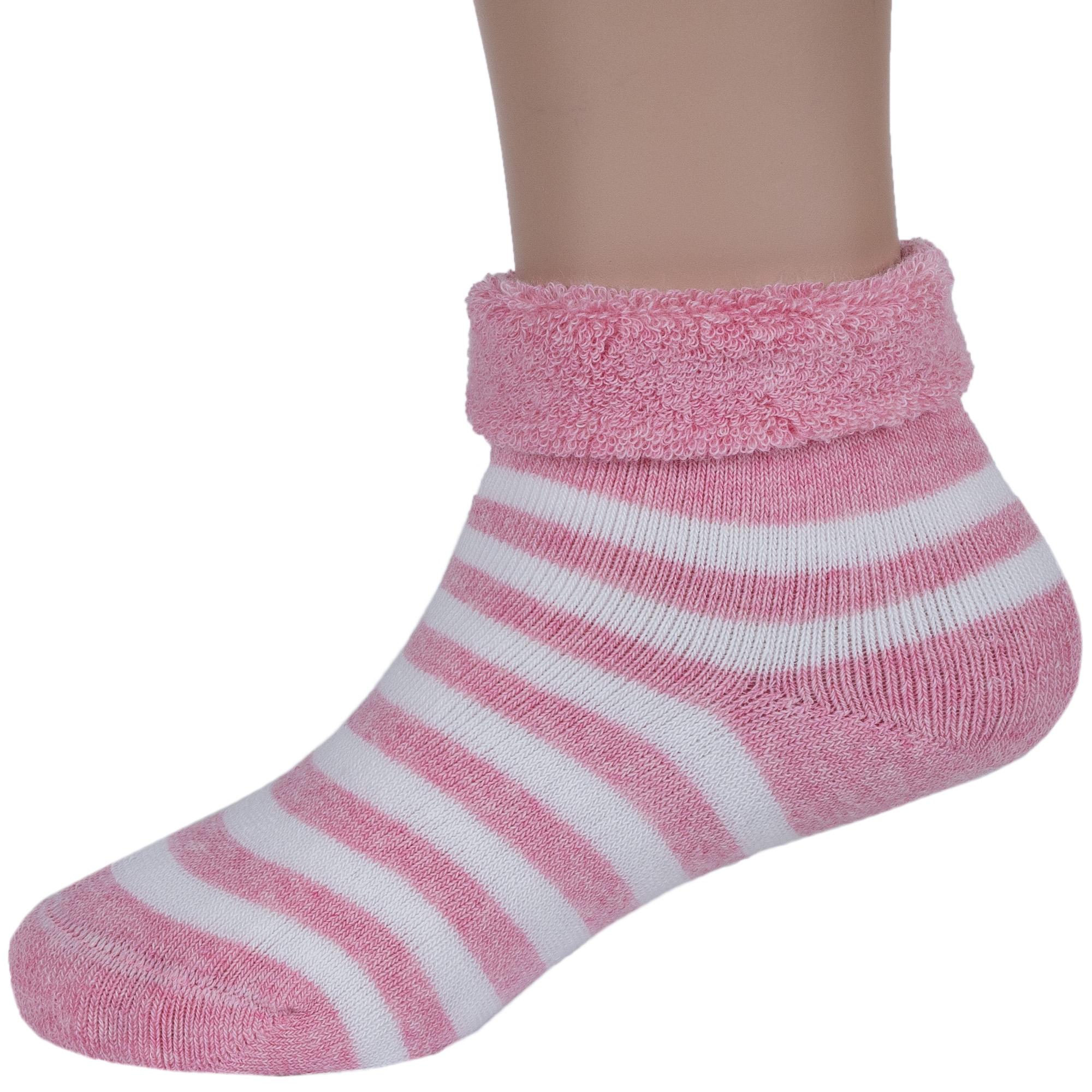 Круглогодичные укороченные детские носки, цвет розовый, классические, махровые, с отворотом, теплые, шов кеттельный (бесшовная технология), принт (рисунок): полоски, с узором, состав: 88% хлопок, 10% полиамид, 2% эластан, арт. Д-109. Производитель «ООО Орудьевский трикотаж, Россия» под брендом «Rusocks (орудьевский трикотаж)».