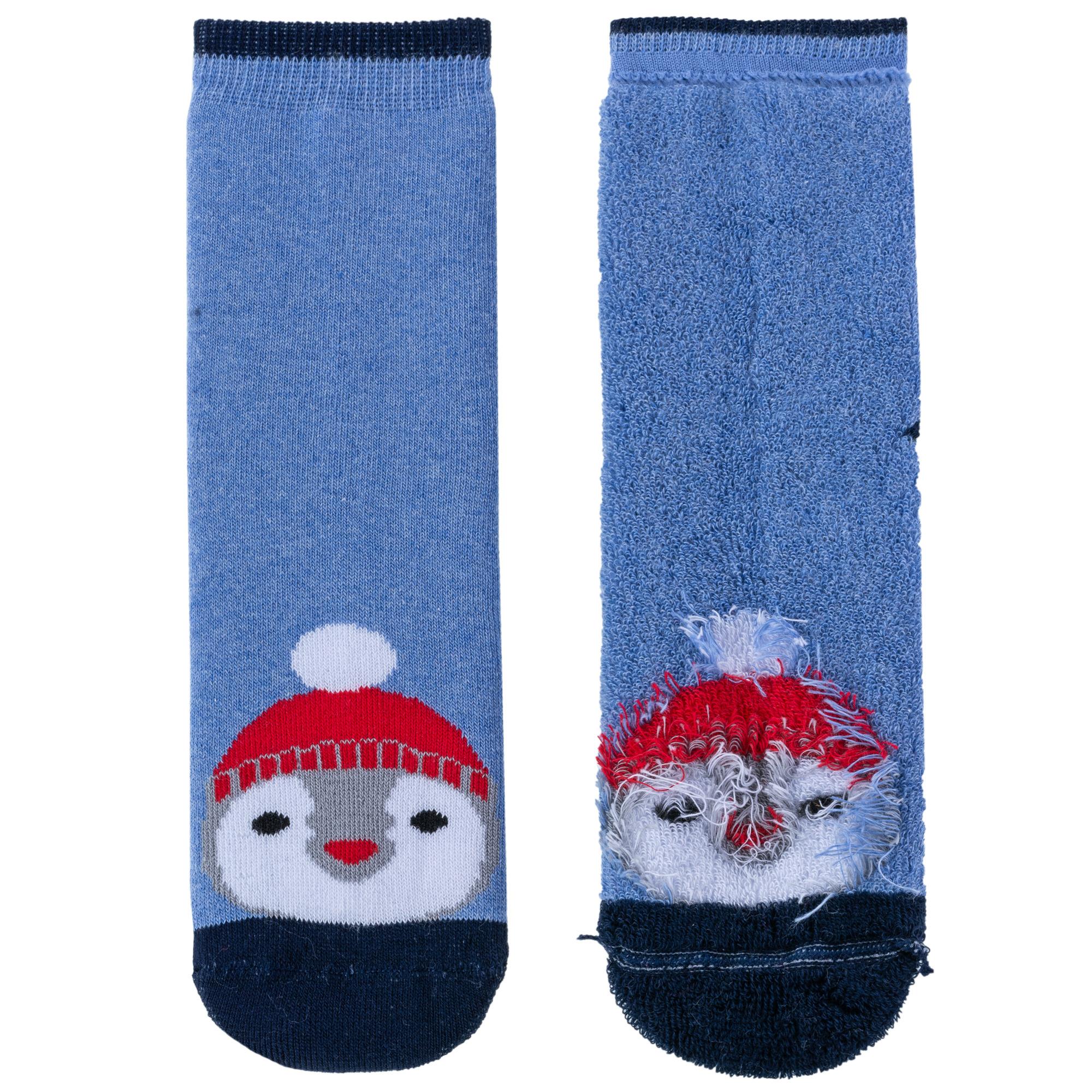 Зимние средней длины детские носки, цвет синий-джинс, теплые, махровые, шов кеттельный (бесшовная технология), принт (рисунок): новый год, животные, с узором, состав: 88% хлопок, 10% полиамид, 2% эластан, арт. Д3-33039. Производитель «ООО Орудьевский трикотаж, Россия» под брендом «Rusocks (орудьевский трикотаж)».