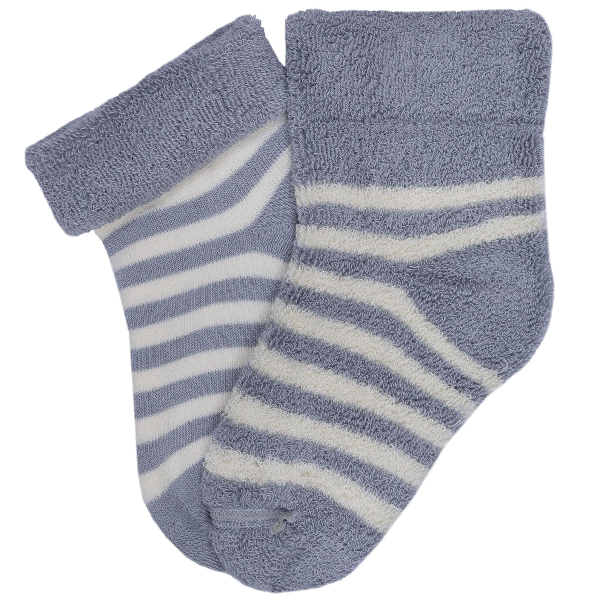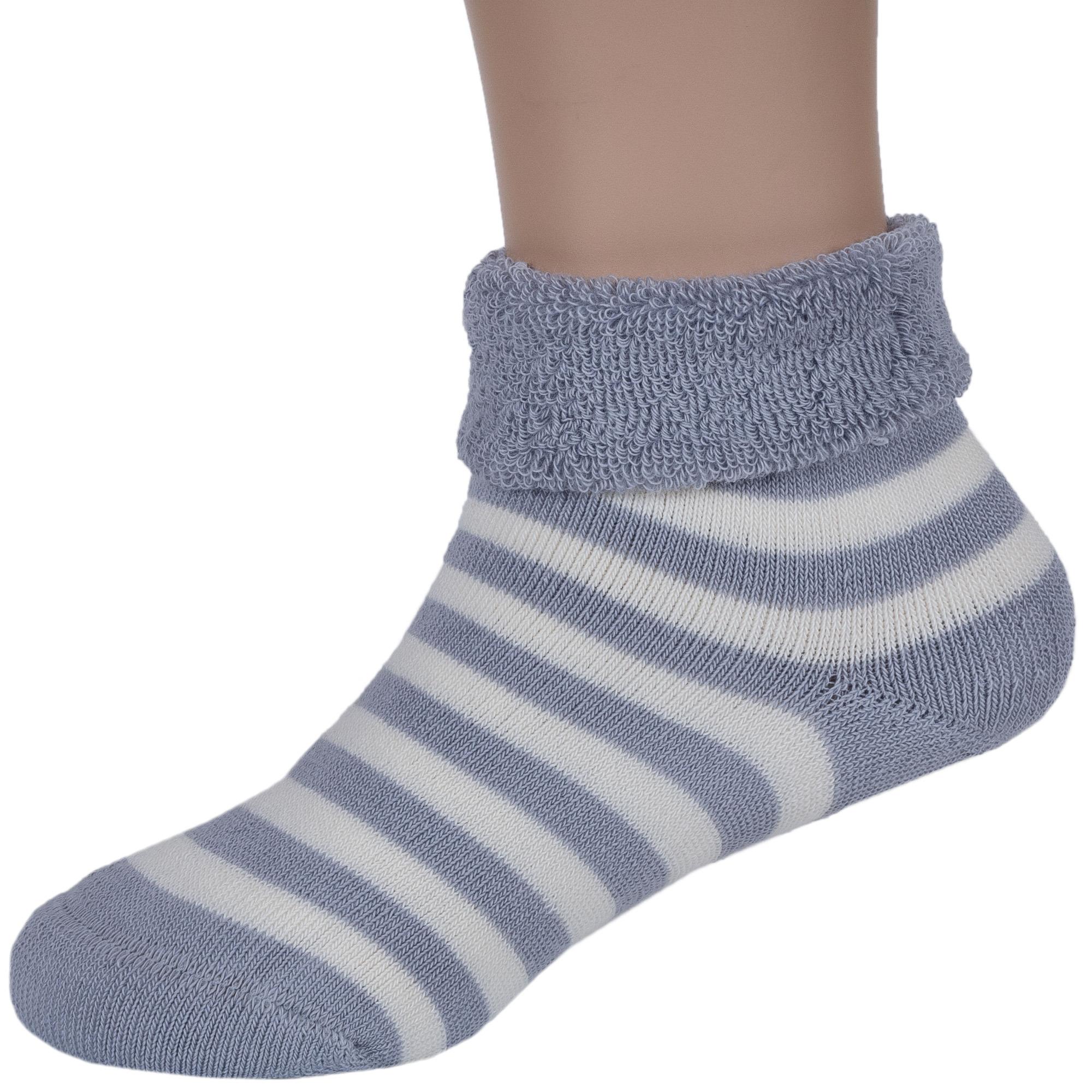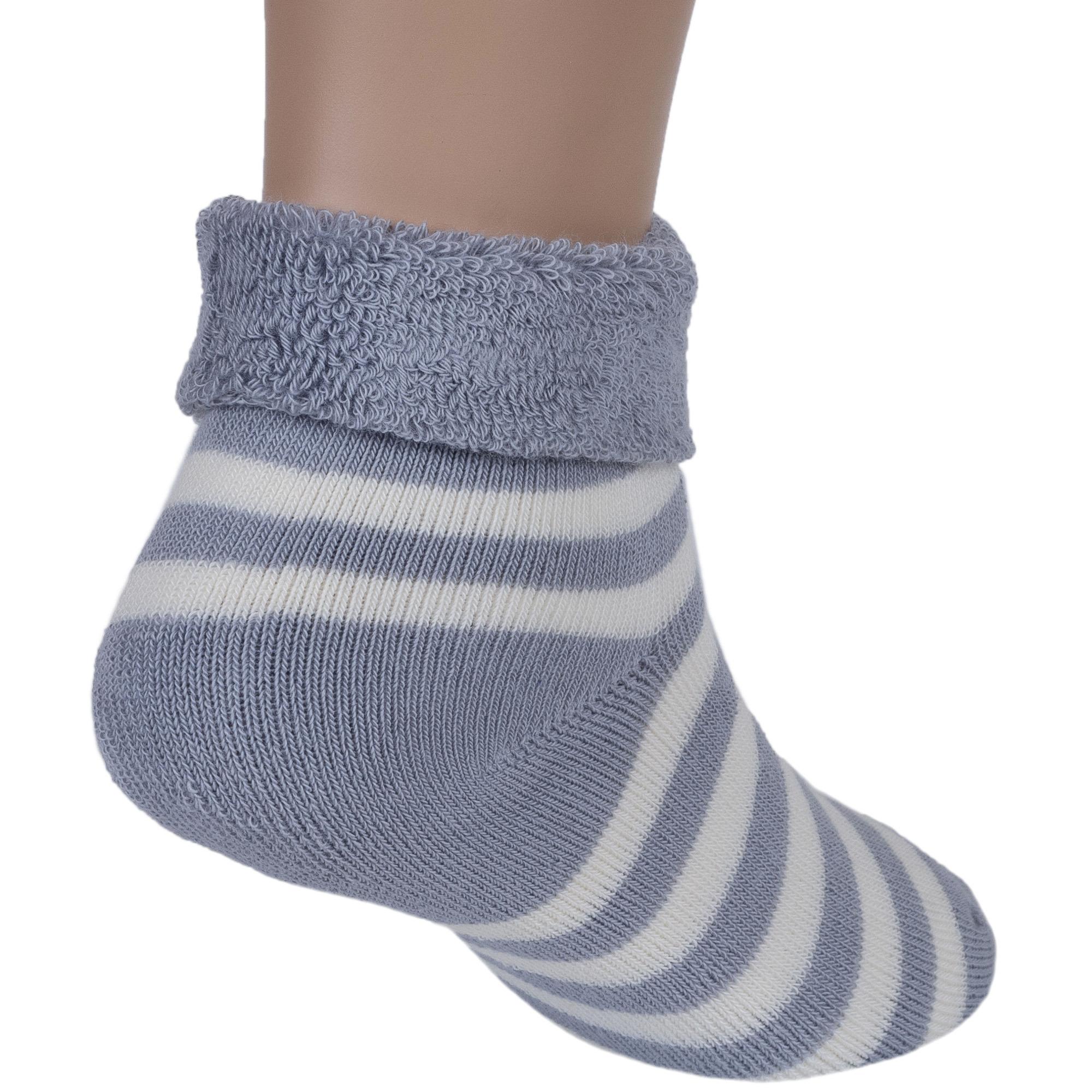 Круглогодичные укороченные детские носки, цвет светло-серый, классические, махровые, с отворотом, теплые, шов кеттельный (бесшовная технология), принт (рисунок): полоски, с узором, состав: 88% хлопок, 10% полиамид, 2% эластан, арт. Д-109. Производитель «ООО Орудьевский трикотаж, Россия» под брендом «Rusocks (орудьевский трикотаж)».