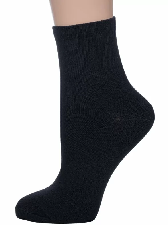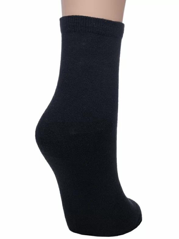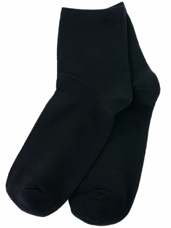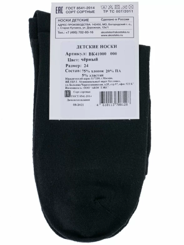 Круглогодичные укороченные детские носки, цвет черный, классические, шов обычный (не бесшовные), принт (рисунок): однотонный, без рисунков/узоров, состав: 75% хлопок, 20% полиамид, 5% эластан, арт. ВК41000 000. Производитель «ООО «АКОС ТЭКС», Московская область, Россия» под брендом «Akos».