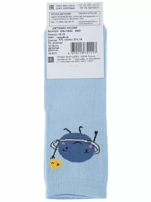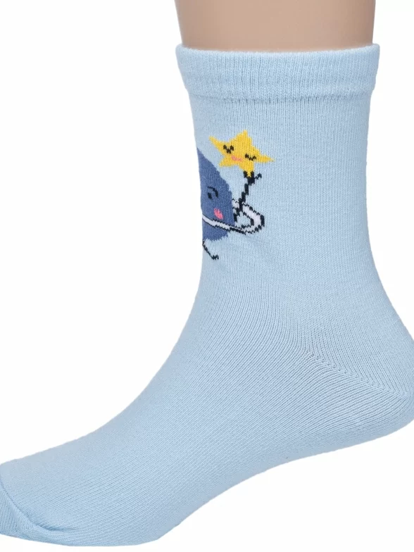 Круглогодичные укороченные детские носки, цвет многоцветные (мультиколор)-голубой, повседневные, шов обычный (не бесшовные), принт (рисунок): космос, с узором, крупные контрастные рисунки, состав: 70% хлопок, 27% полиамид, 3% эластан, арт. CK41800 049. Производитель «ООО «АКОС ТЭКС», Московская область, Россия» под брендом «Akos».