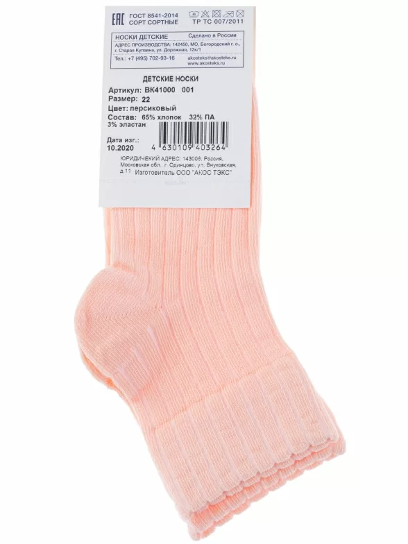 Круглогодичные укороченные детские носки, цвет розовый-оранжевый, с отворотом, классические, шов обычный (не бесшовные), принт (рисунок): полоски, в рубчик, с узором, состав: 65% хлопок, 32% полиамид, 3% эластан, арт. ВК41000 001. Производитель «ООО «АКОС ТЭКС», Московская область, Россия» под брендом «Akos».