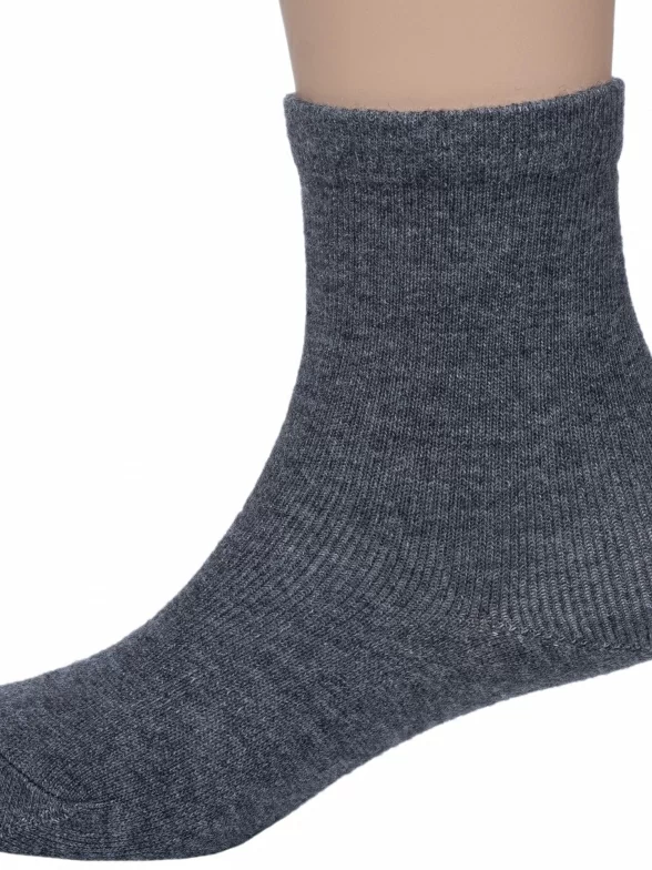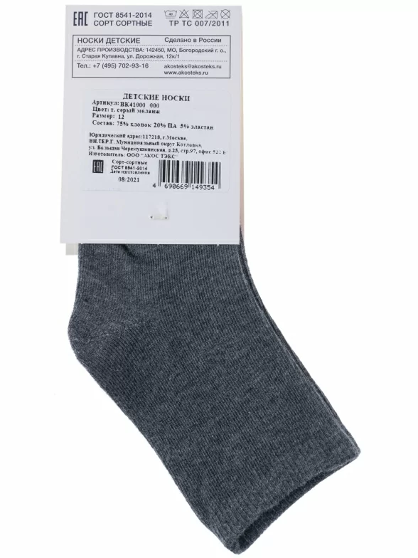 Круглогодичные укороченные детские носки, цвет темно-серый, классические, шов обычный (не бесшовные), принт (рисунок): однотонный, без рисунков/узоров, состав: 75% хлопок, 20% полиамид, 5% эластан, арт. ВК41000 000. Производитель «ООО «АКОС ТЭКС», Московская область, Россия» под брендом «Akos».