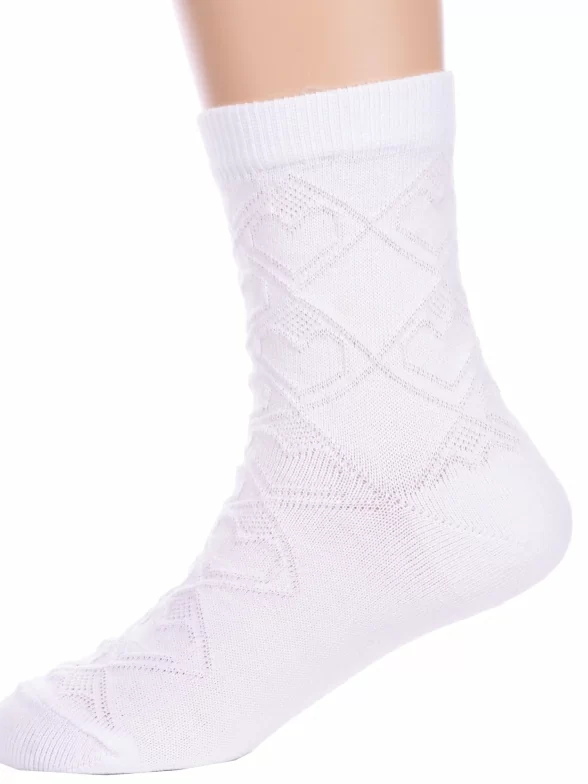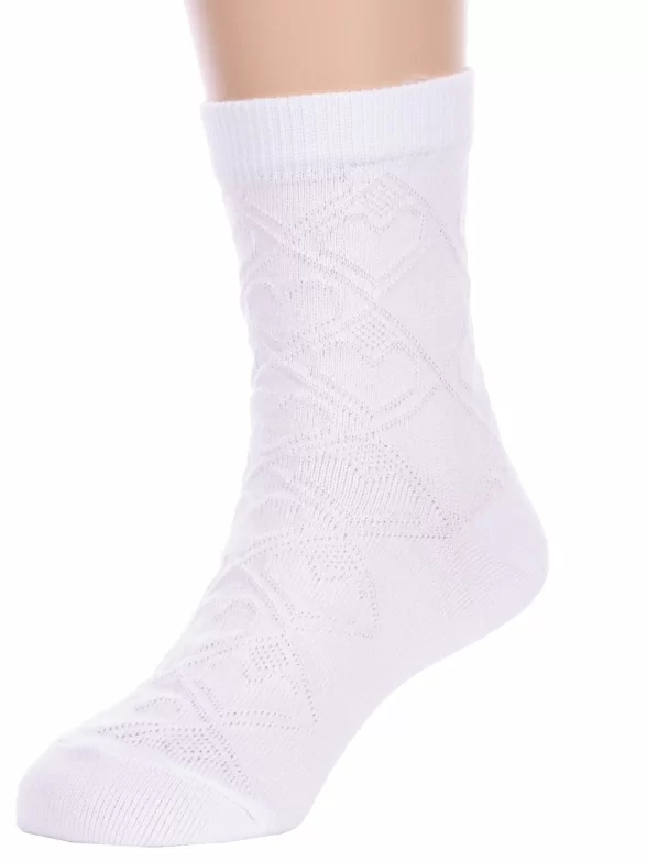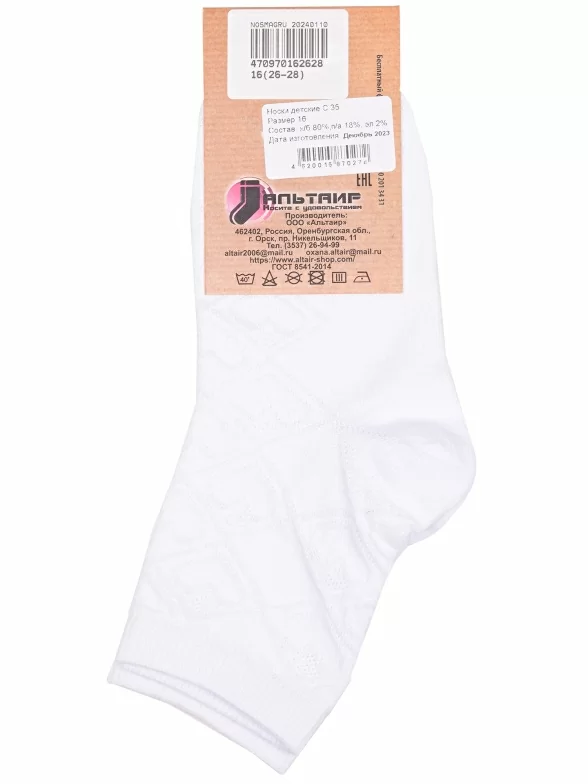 Летние укороченные детские носки, цвет белый, ажурные, шов обычный (не бесшовные), принт (рисунок): сердечки / поцелуи / любовь, клетка, аргайл, с узором, однотонный, состав: 80% хлопок, 18% полиамид, 2% эластан, арт. С35. Производитель «ООО Альтаир, г. Орск, Оренбургская обл, Россия» под брендом «Альтаир».