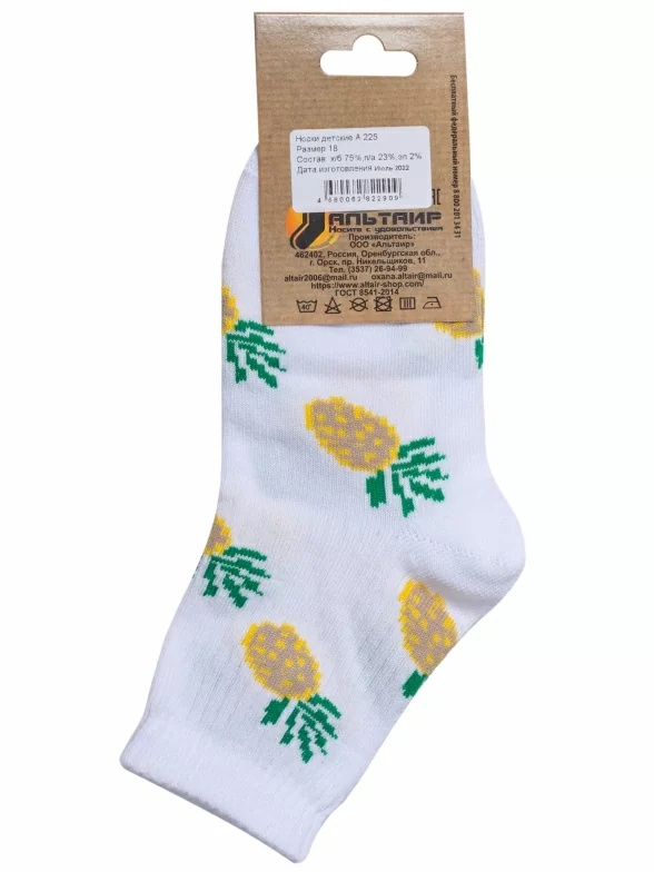 Круглогодичные укороченные детские носки, цвет белый, повседневные, шов обычный (не бесшовные), принт (рисунок): овощи / фрукты / ягоды, еда и напитки, с узором, состав: 80% хлопок, 18% полиамид, 2% эластан, арт. А225. Производитель «ООО Альтаир, г. Орск, Оренбургская обл, Россия» под брендом «Альтаир».