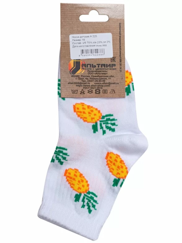 Круглогодичные укороченные детские носки, цвет белый, повседневные, шов обычный (не бесшовные), принт (рисунок): овощи / фрукты / ягоды, еда и напитки, с узором, состав: 80% хлопок, 18% полиамид, 2% эластан, арт. А225. Производитель «ООО Альтаир, г. Орск, Оренбургская обл, Россия» под брендом «Альтаир».