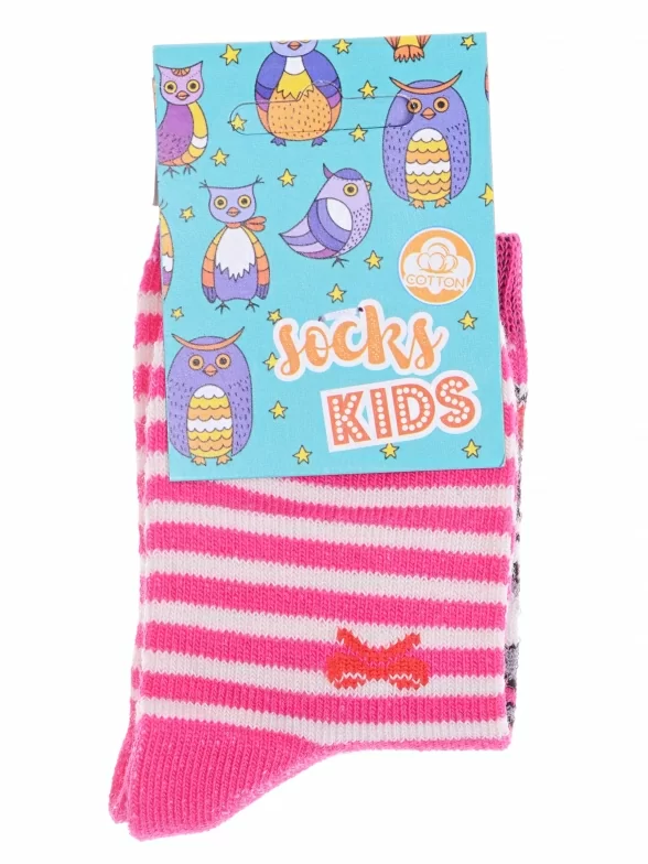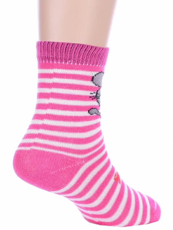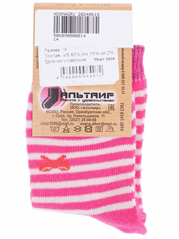 Круглогодичные укороченные детские носки, цвет фуксия, повседневные, возможно бесшовные, принт (рисунок): полоски, животные, бабочки / бантики, с узором, крупные контрастные рисунки, состав: 82% хлопок, 16% полиамид, 2% эластан, арт. С143. Производитель «ООО Альтаир, г. Орск, Оренбургская обл, Россия» под брендом «Альтаир».