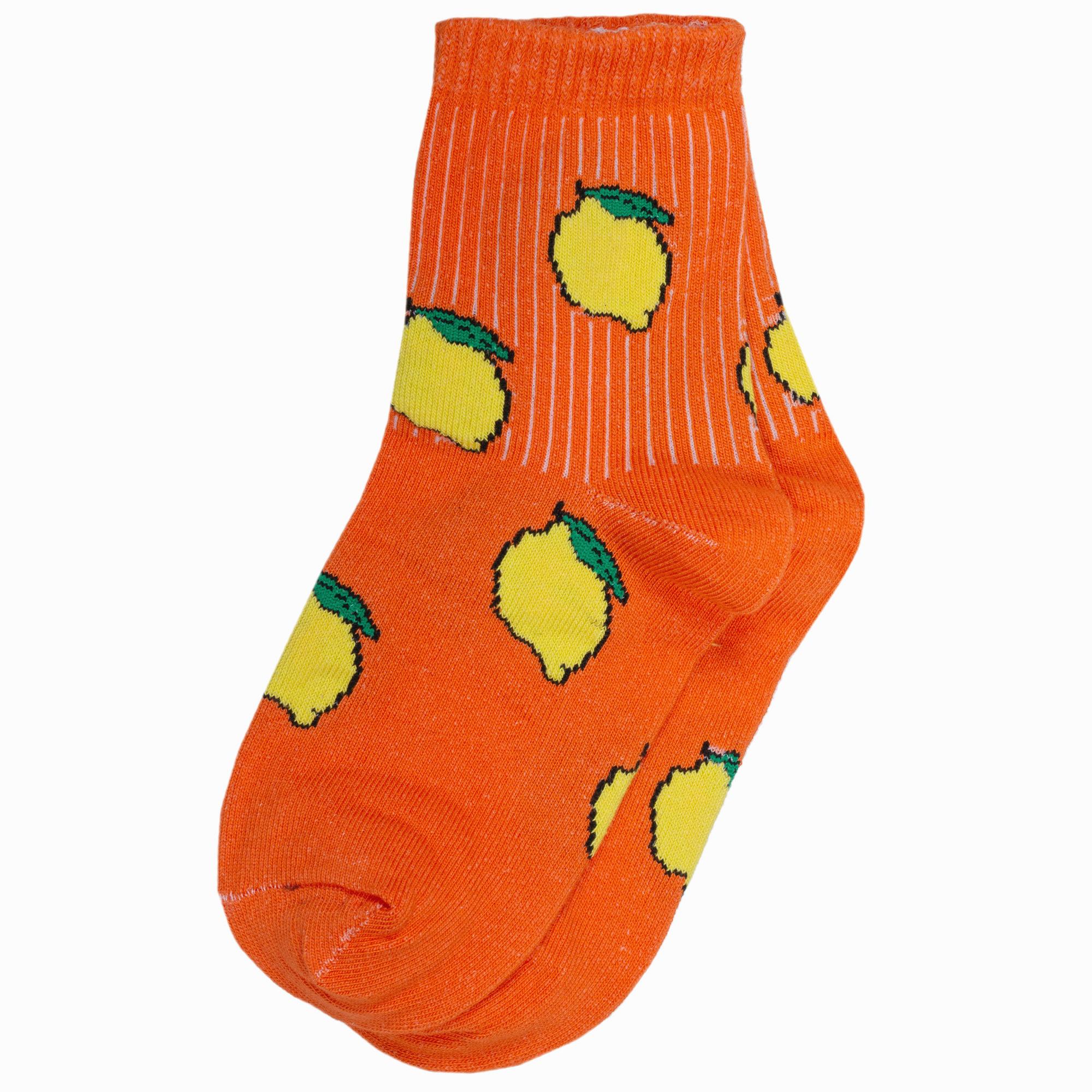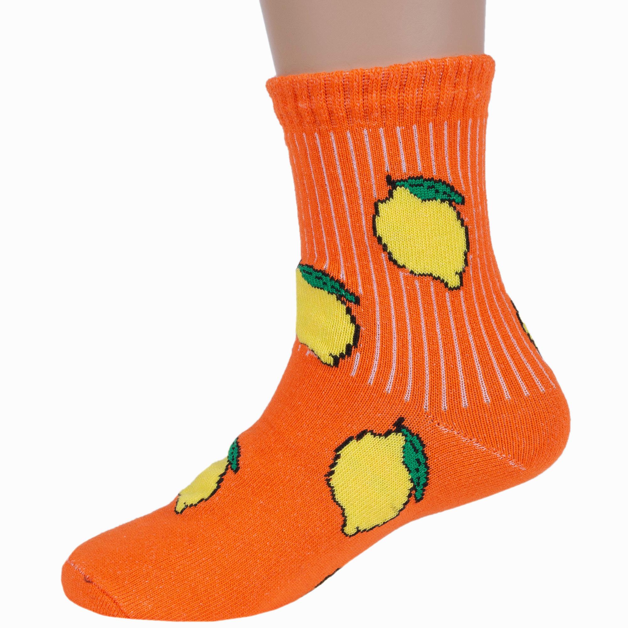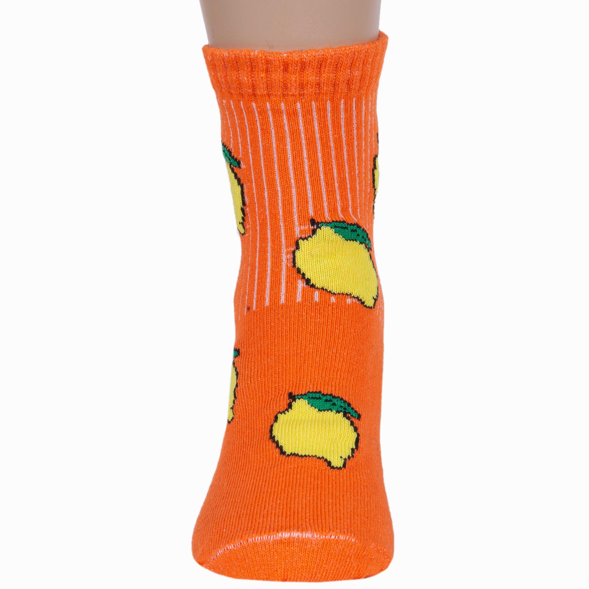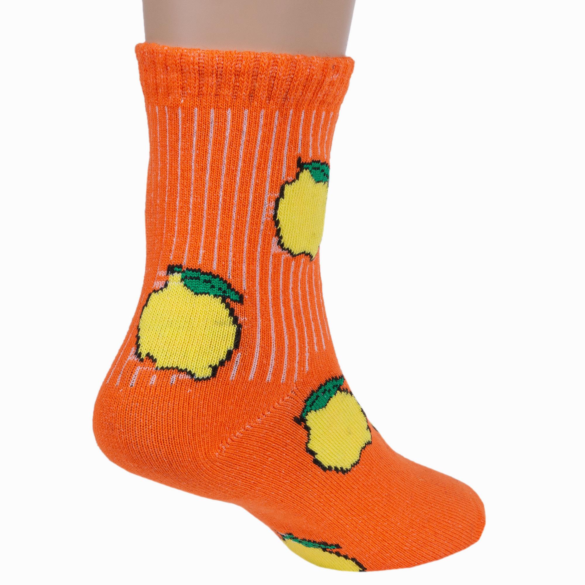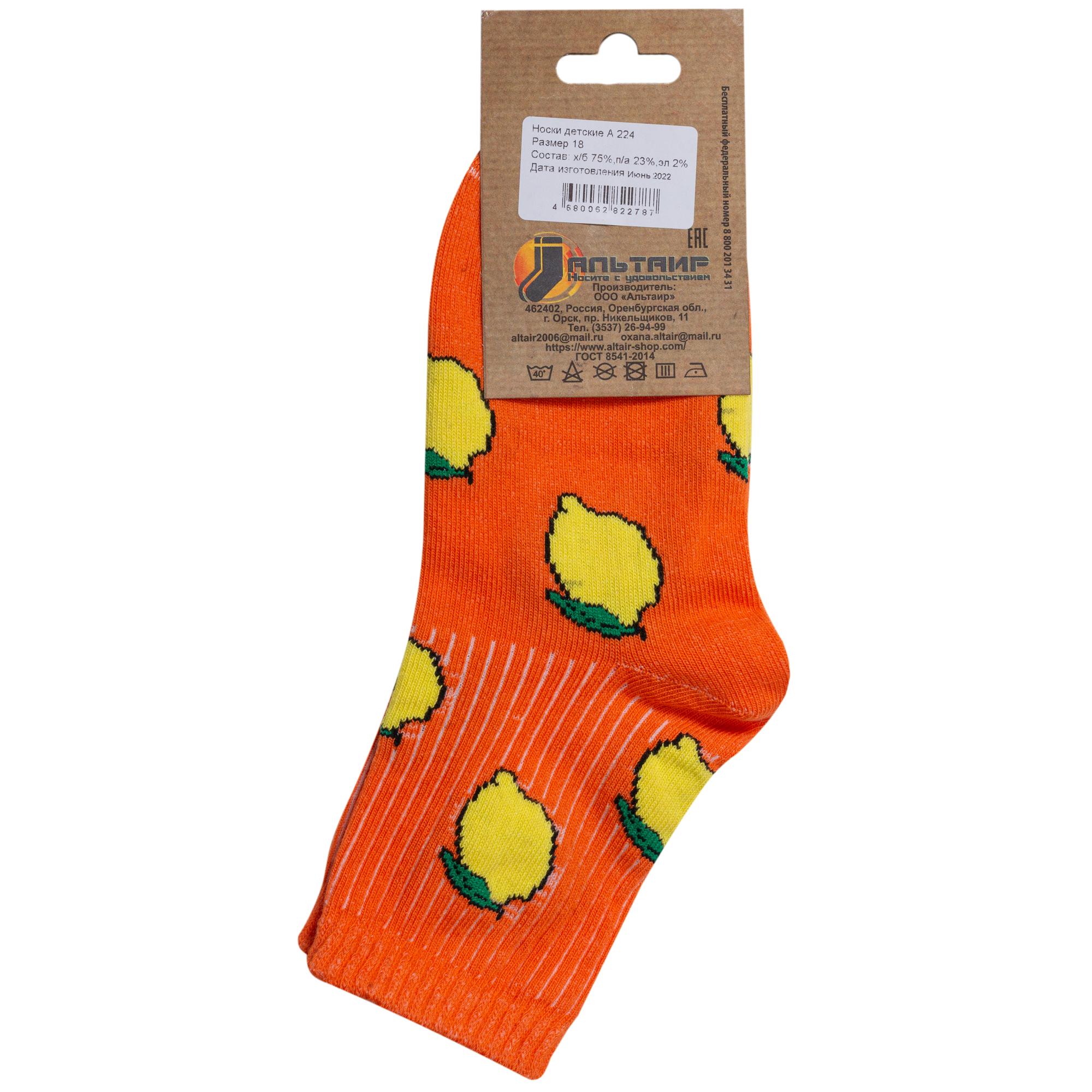 Круглогодичные укороченные детские носки, цвет оранжевый, повседневные, шов обычный (не бесшовные), принт (рисунок): овощи / фрукты / ягоды, еда и напитки, с узором, состав: 80% хлопок, 18% полиамид, 2% эластан, арт. А224. Производитель «ООО Альтаир, г. Орск, Оренбургская обл, Россия» под брендом «Альтаир».