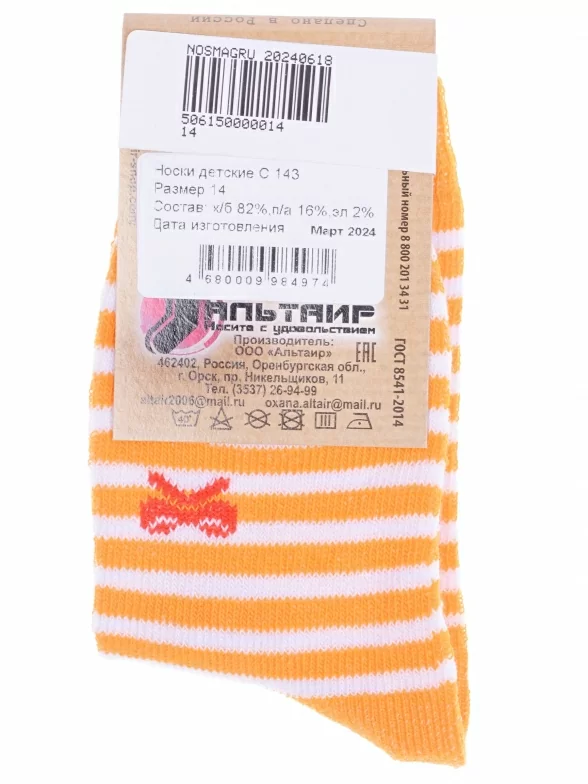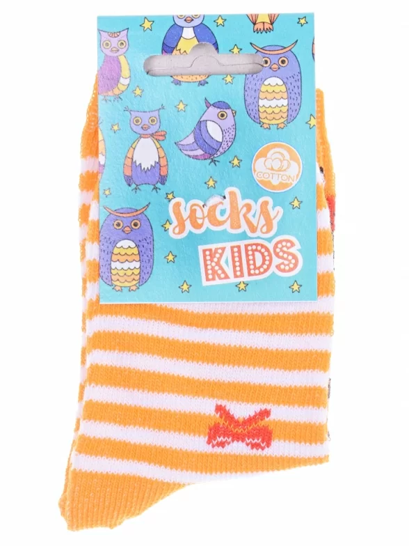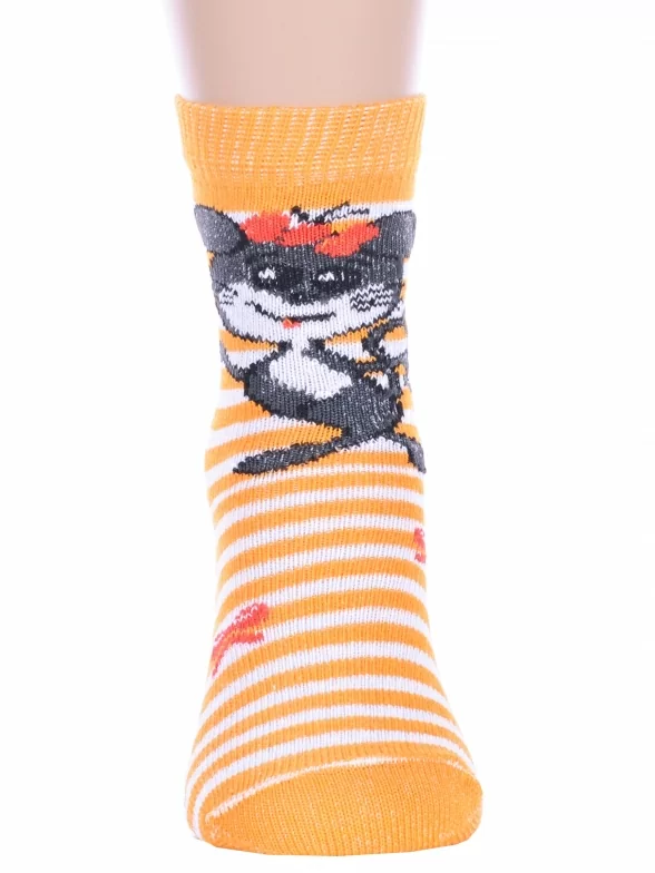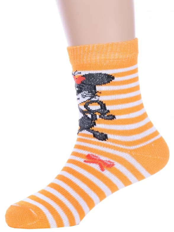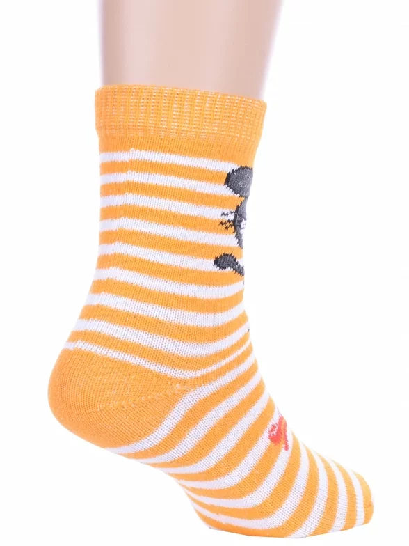 Круглогодичные укороченные детские носки, цвет оранжевый, повседневные, возможно бесшовные, принт (рисунок): полоски, животные, бабочки / бантики, с узором, крупные контрастные рисунки, состав: 82% хлопок, 16% полиамид, 2% эластан, арт. С143. Производитель «ООО Альтаир, г. Орск, Оренбургская обл, Россия» под брендом «Альтаир».