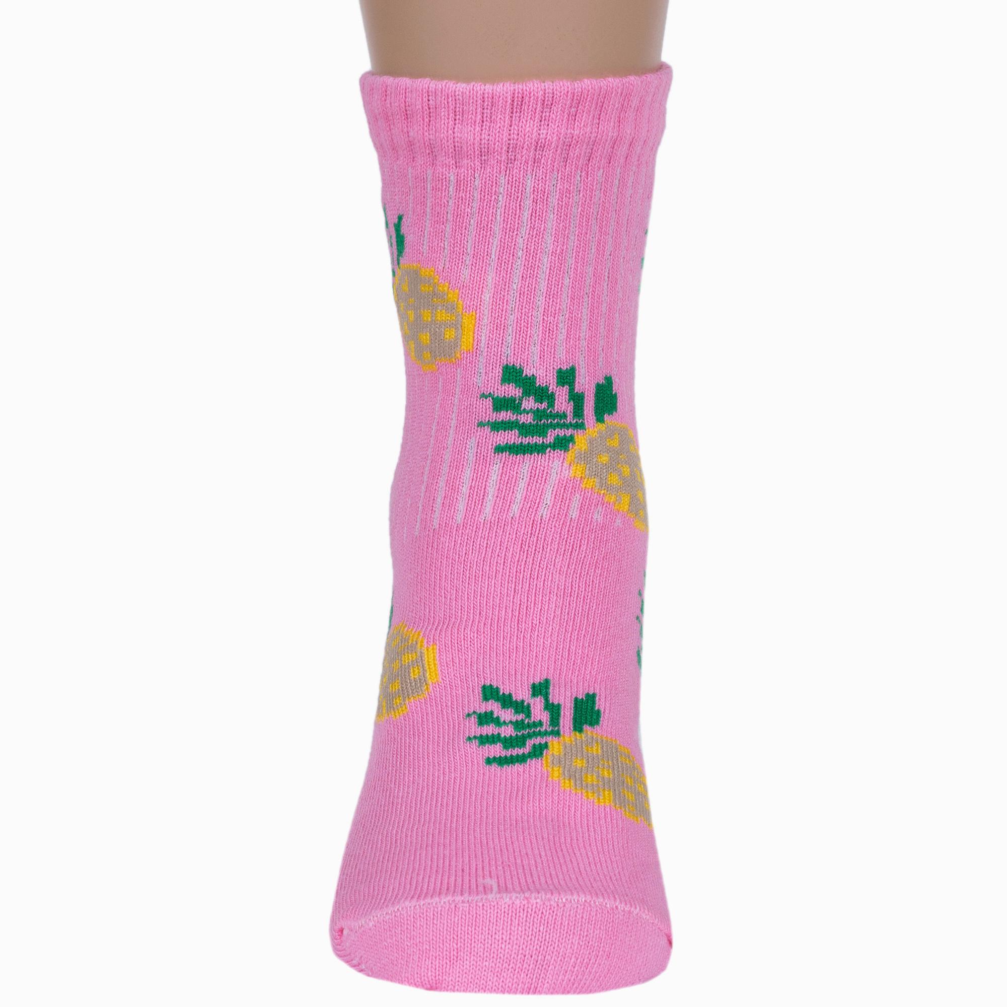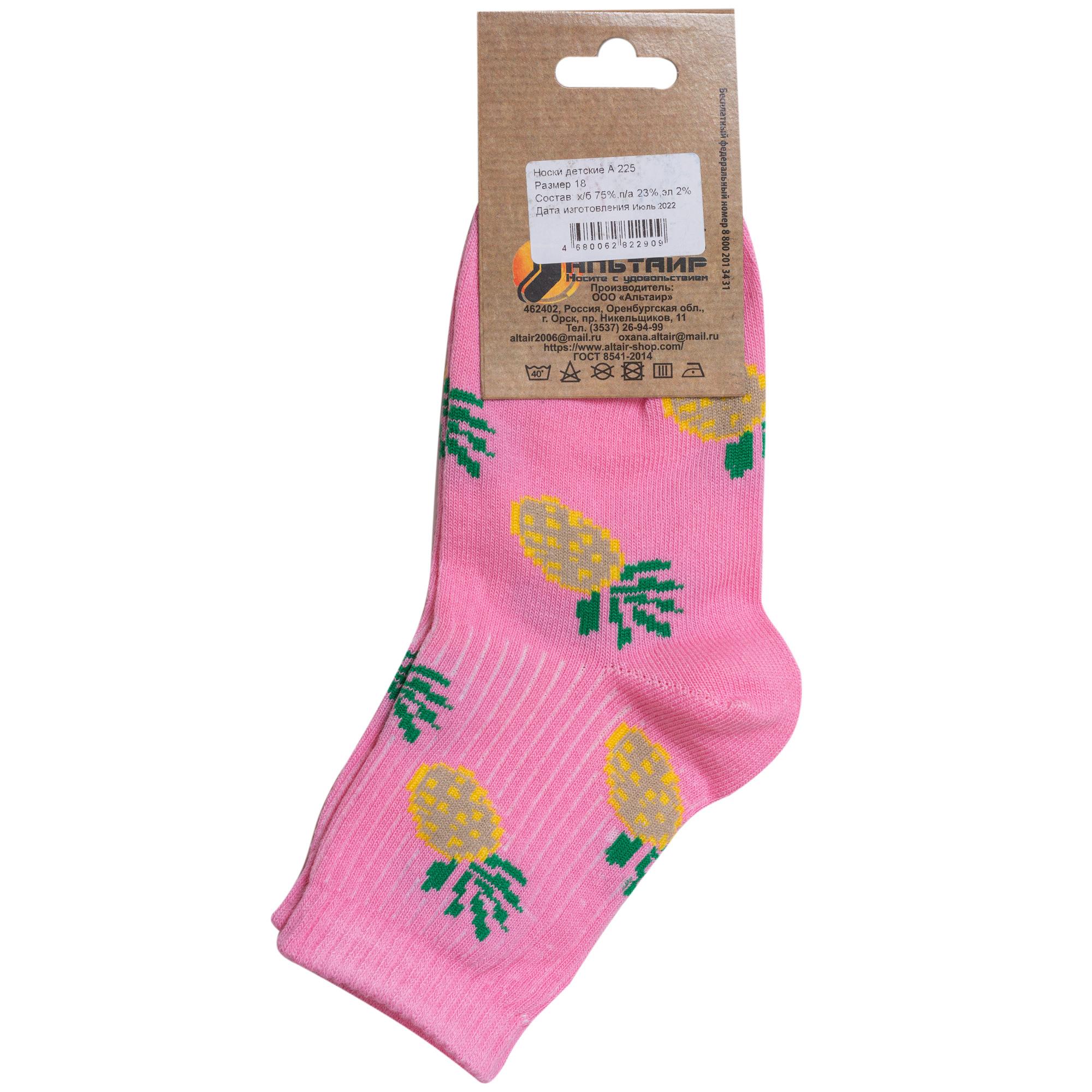 Круглогодичные укороченные детские носки, цвет розовый, повседневные, шов обычный (не бесшовные), принт (рисунок): овощи / фрукты / ягоды, еда и напитки, с узором, состав: 80% хлопок, 18% полиамид, 2% эластан, арт. А225. Производитель «ООО Альтаир, г. Орск, Оренбургская обл, Россия» под брендом «Альтаир».