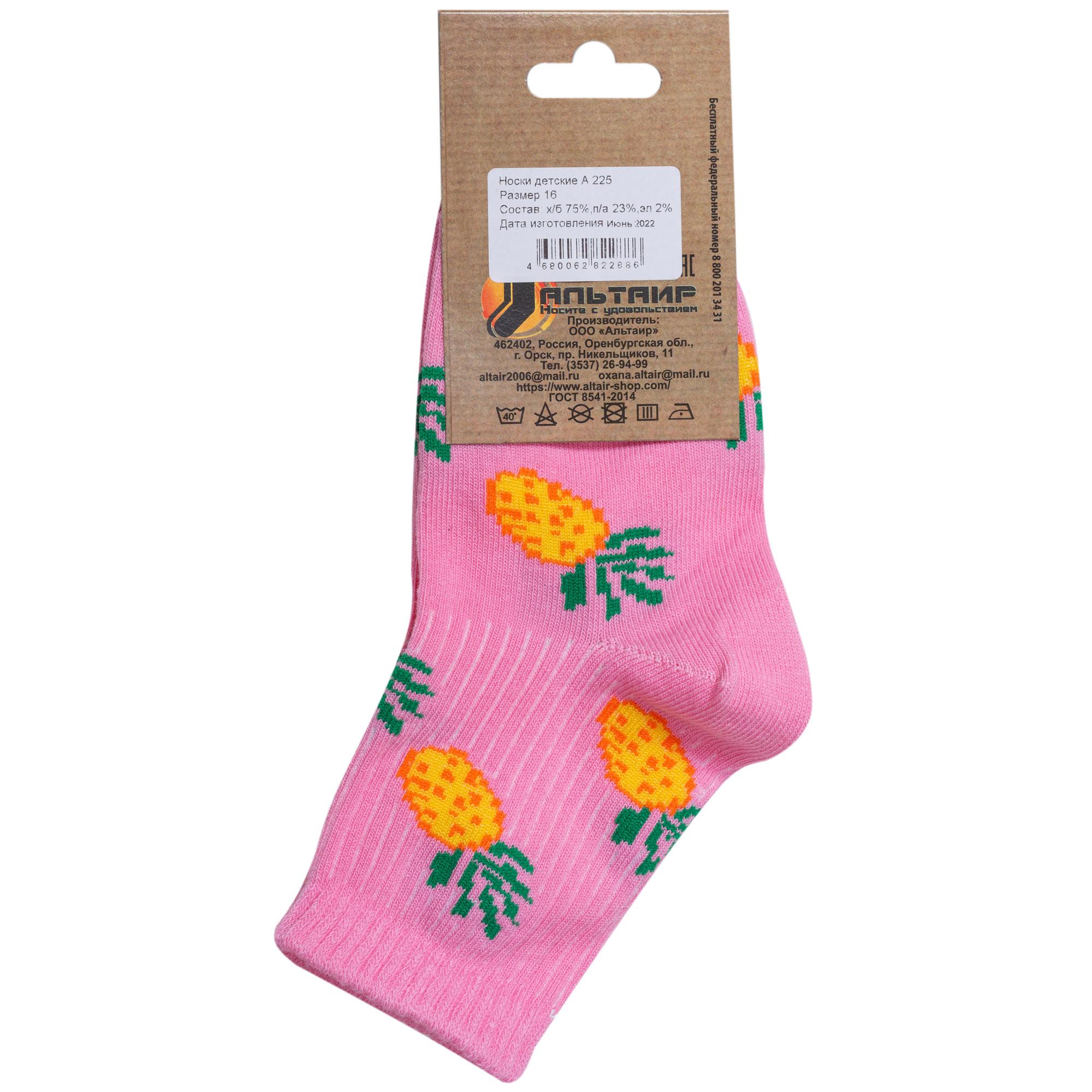 Круглогодичные укороченные детские носки, цвет розовый, повседневные, шов обычный (не бесшовные), принт (рисунок): овощи / фрукты / ягоды, еда и напитки, с узором, состав: 80% хлопок, 18% полиамид, 2% эластан, арт. А225. Производитель «ООО Альтаир, г. Орск, Оренбургская обл, Россия» под брендом «Альтаир».