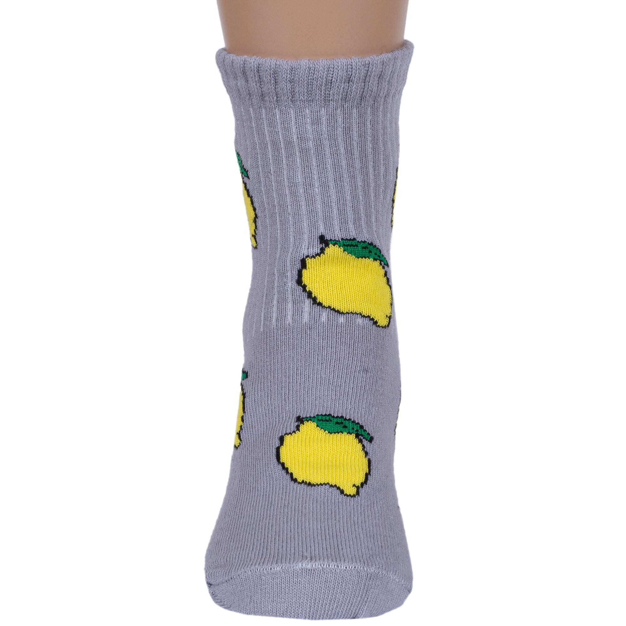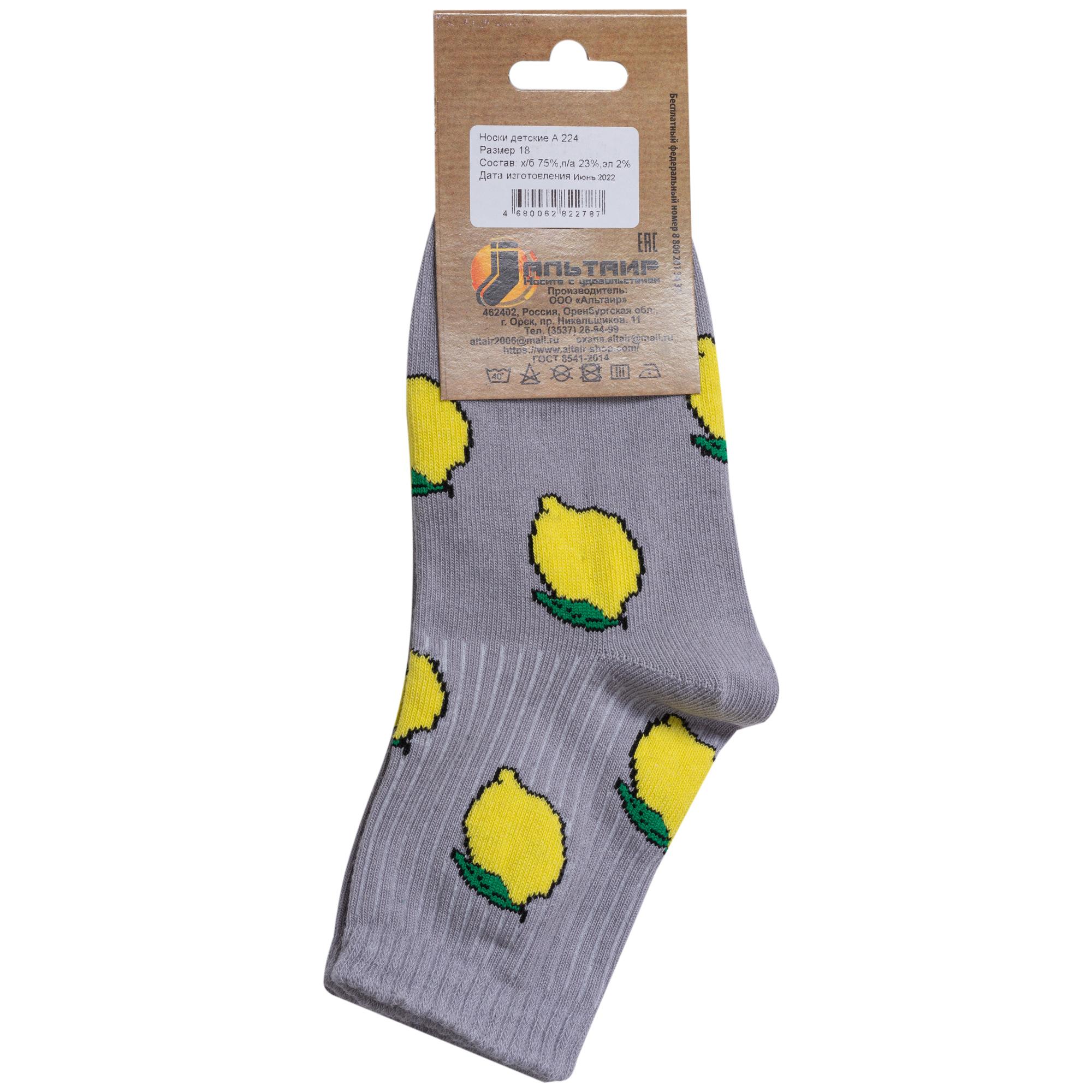 Круглогодичные укороченные детские носки, цвет серый, повседневные, шов обычный (не бесшовные), принт (рисунок): овощи / фрукты / ягоды, еда и напитки, с узором, состав: 80% хлопок, 18% полиамид, 2% эластан, арт. А224. Производитель «ООО Альтаир, г. Орск, Оренбургская обл, Россия» под брендом «Альтаир».