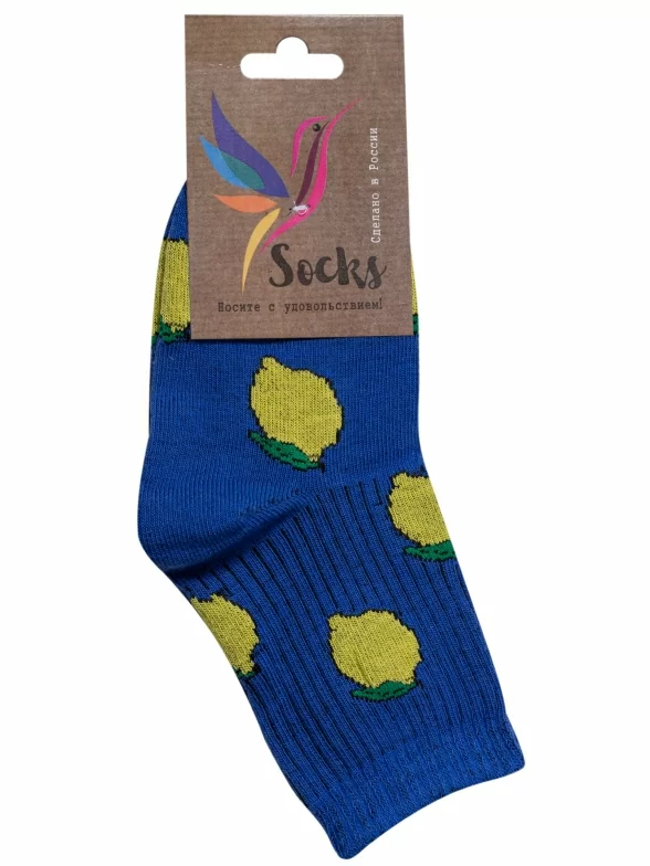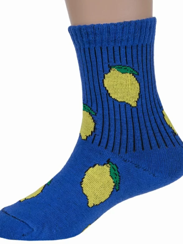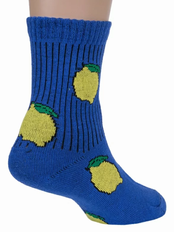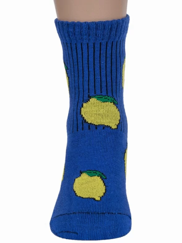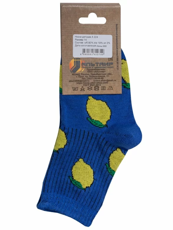 Круглогодичные укороченные детские носки, цвет синий, повседневные, шов обычный (не бесшовные), принт (рисунок): овощи / фрукты / ягоды, еда и напитки, с узором, состав: 80% хлопок, 18% полиамид, 2% эластан, арт. А224. Производитель «ООО Альтаир, г. Орск, Оренбургская обл, Россия» под брендом «Альтаир».