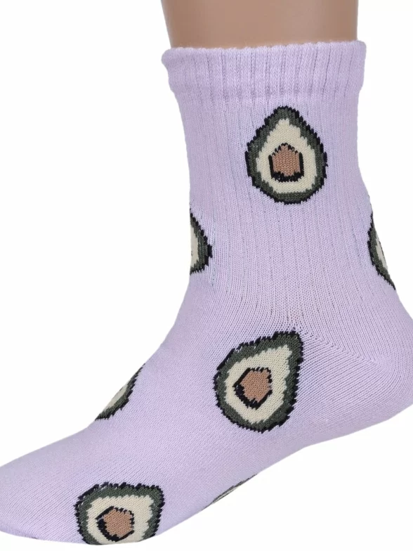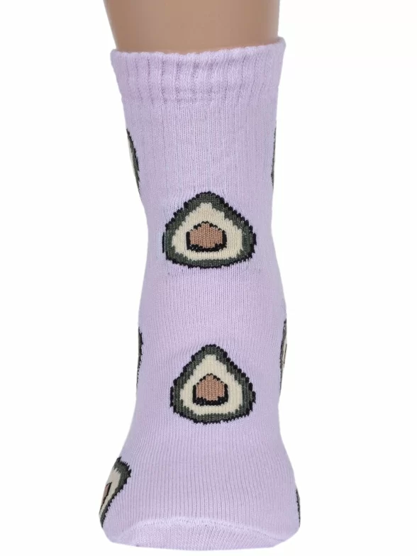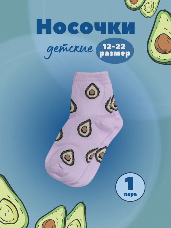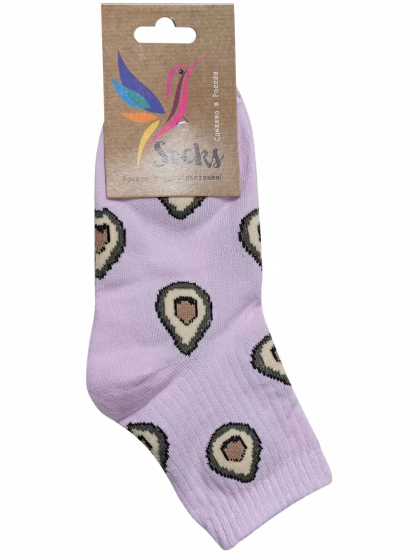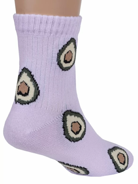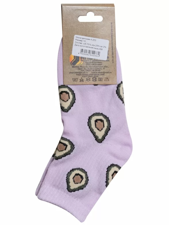 Круглогодичные укороченные детские носки, цвет сиреневый, повседневные, шов обычный (не бесшовные), принт (рисунок): овощи / фрукты / ягоды, еда и напитки, с узором, состав: 80% хлопок, 18% полиамид, 2% эластан, арт. А223. Производитель «ООО Альтаир, г. Орск, Оренбургская обл, Россия» под брендом «Альтаир».