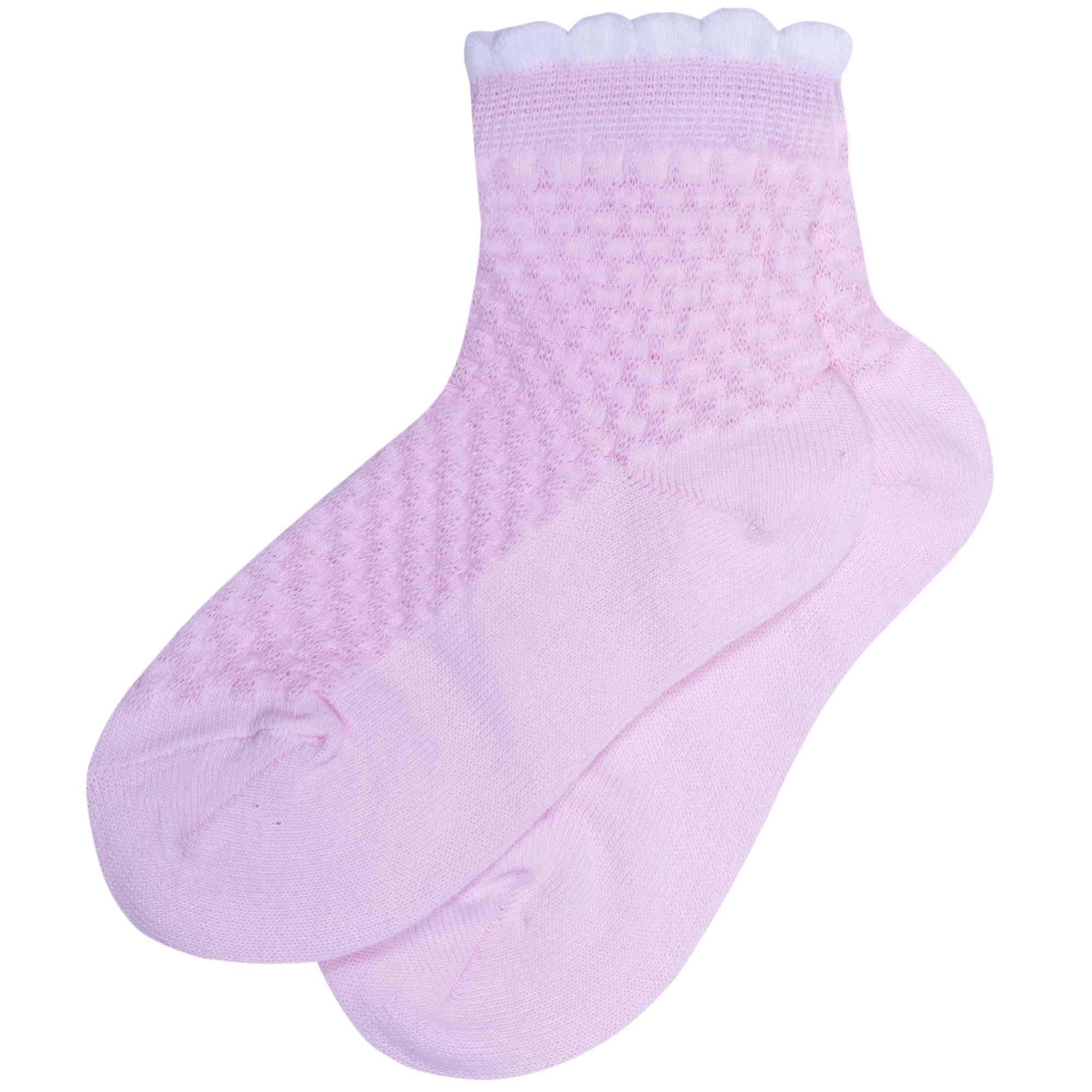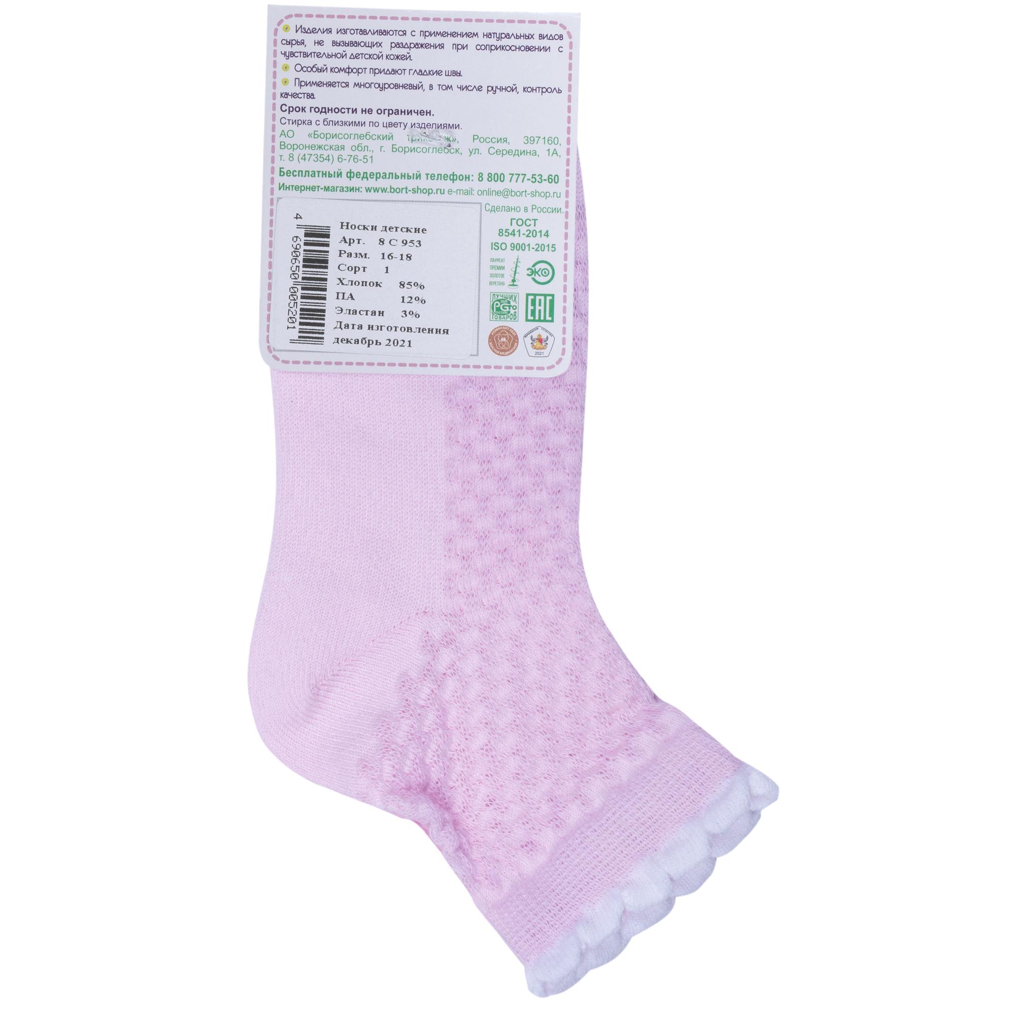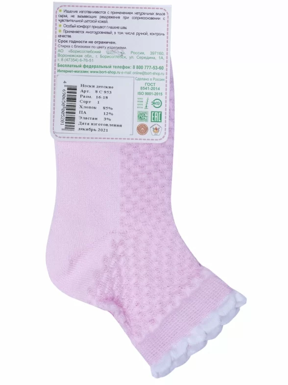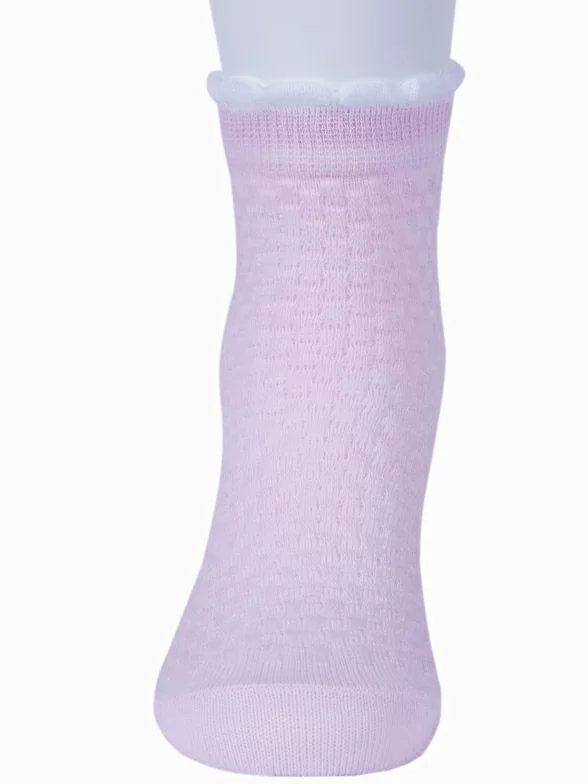 Летние укороченные детские носки, цвет сиреневый, в сеточку, классические, шов обычный (не бесшовные), принт (рисунок): с узором, состав: 85% хлопок, 12% полиамид, 3% эластан, арт. 8С953. Производитель «АО Борисоглебский трикотаж, Воронежская обл, Россия» под брендом «Борисоглебский трикотаж».