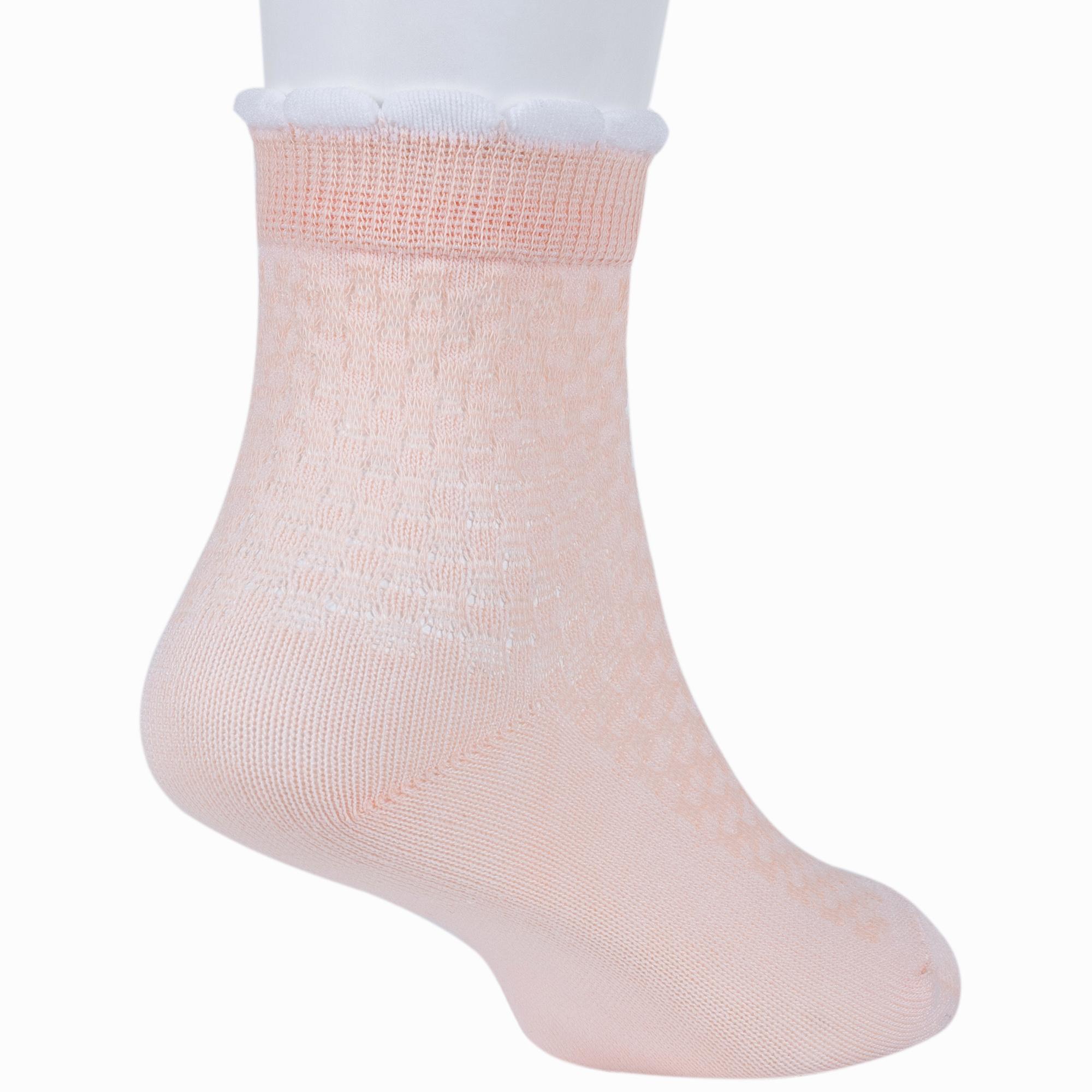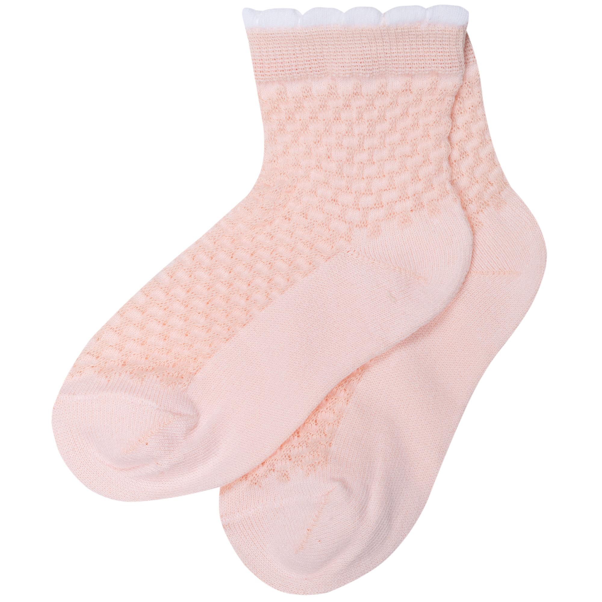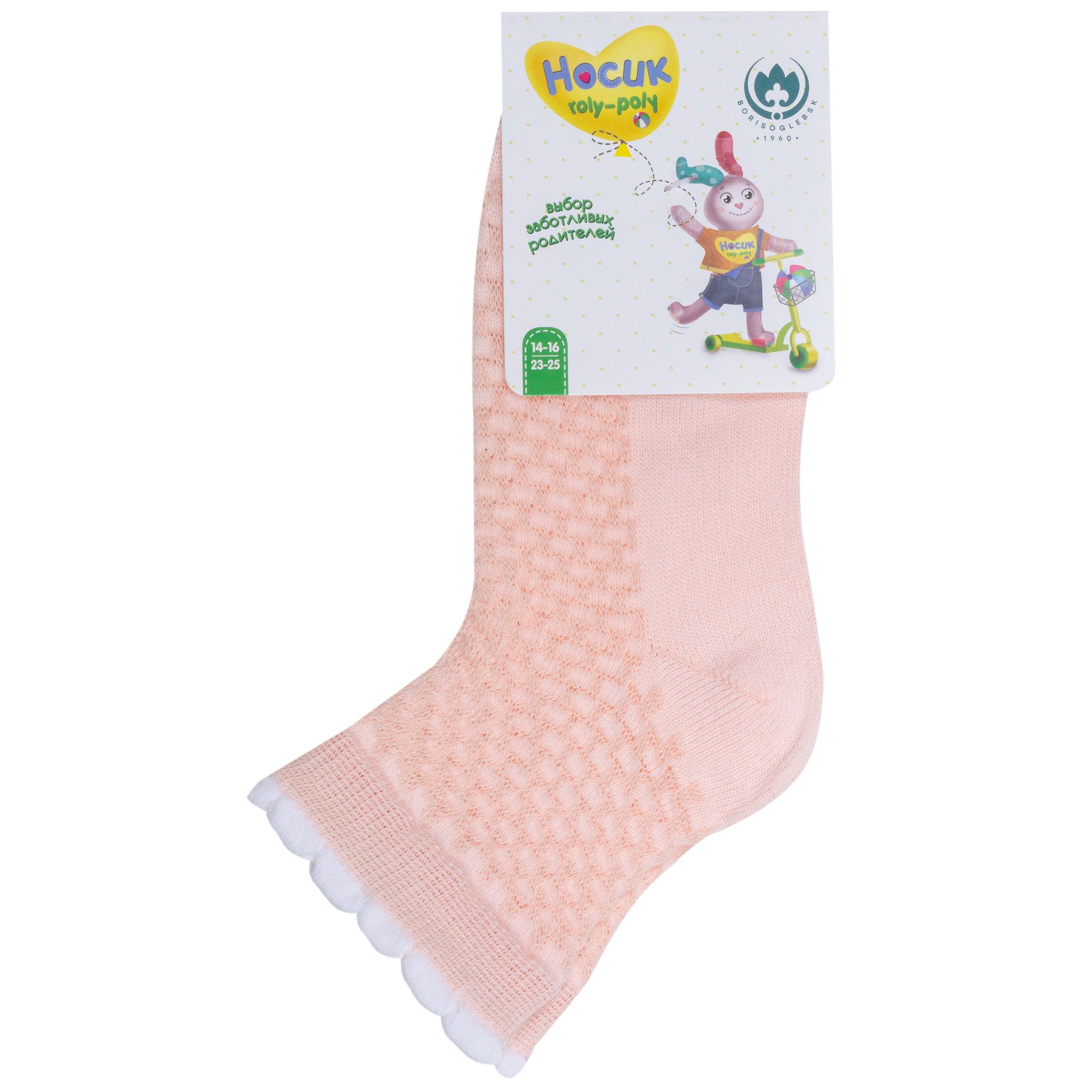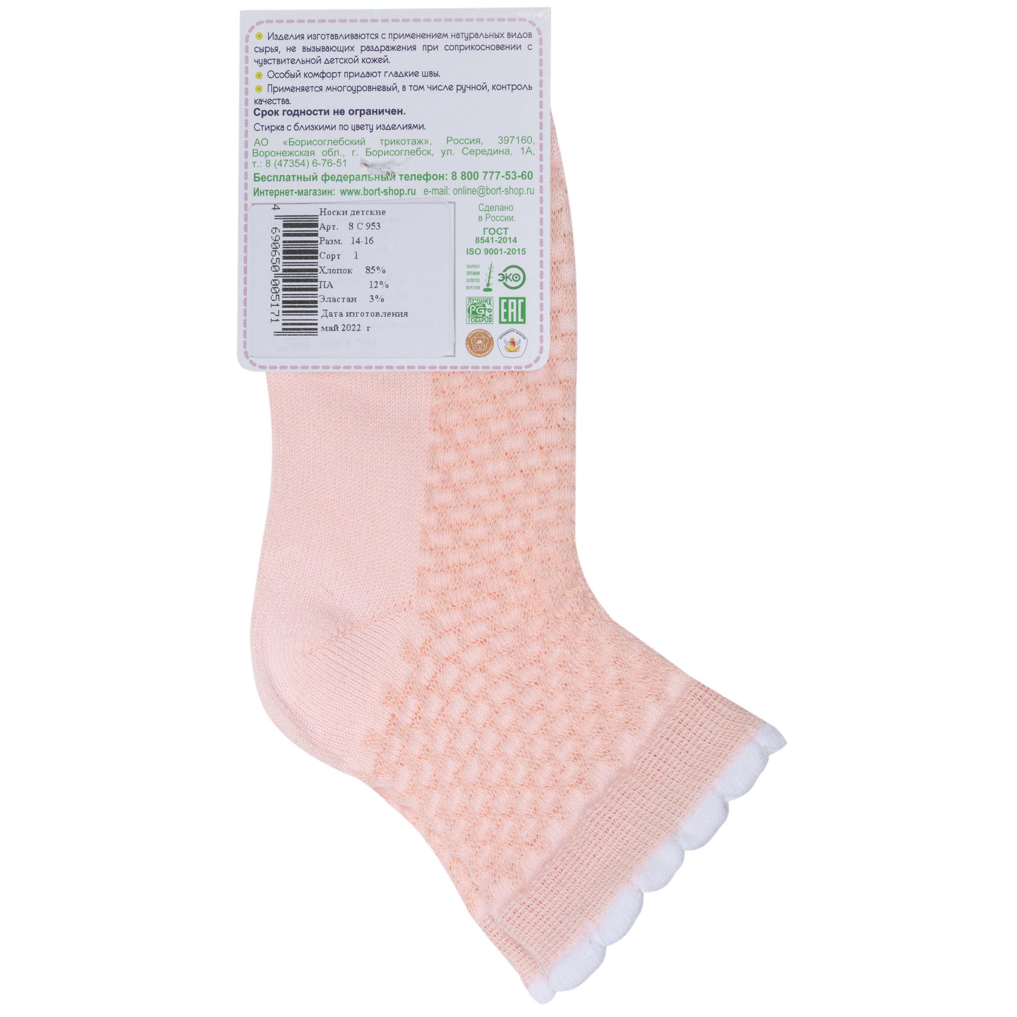 Летние укороченные детские носки, цвет розовый, в сеточку, классические, шов обычный (не бесшовные), принт (рисунок): с узором, состав: 85% хлопок, 12% полиамид, 3% эластан, арт. 8С953. Производитель «АО Борисоглебский трикотаж, Воронежская обл, Россия» под брендом «Борисоглебский трикотаж».