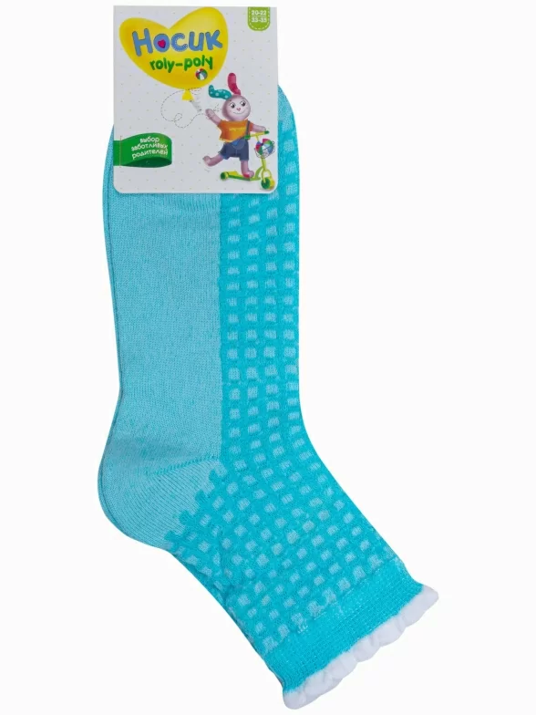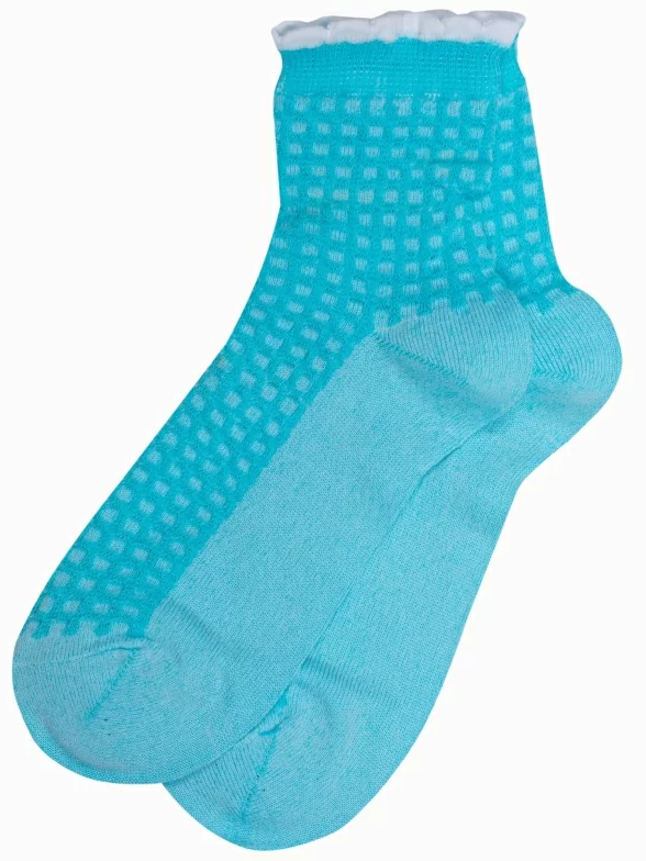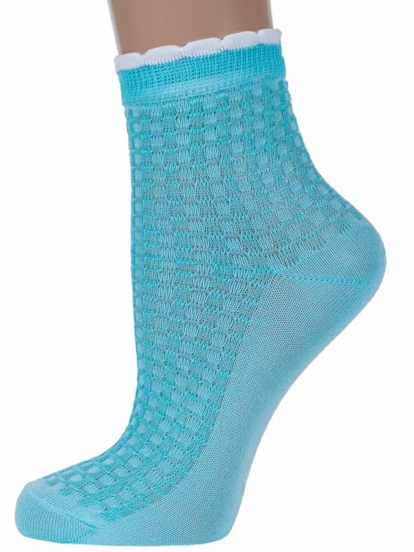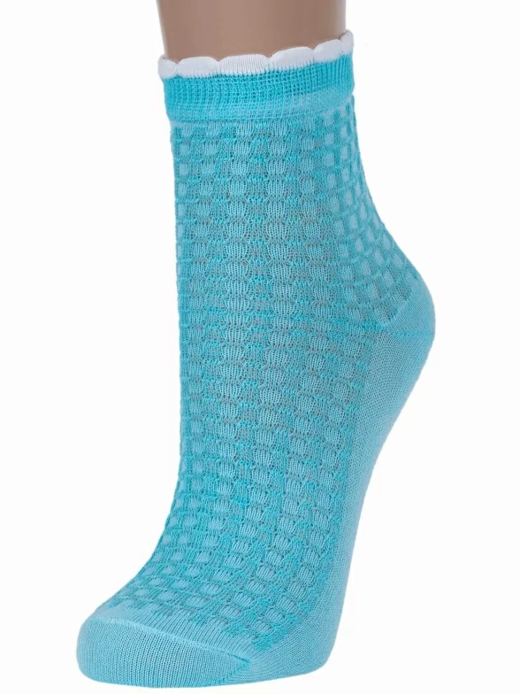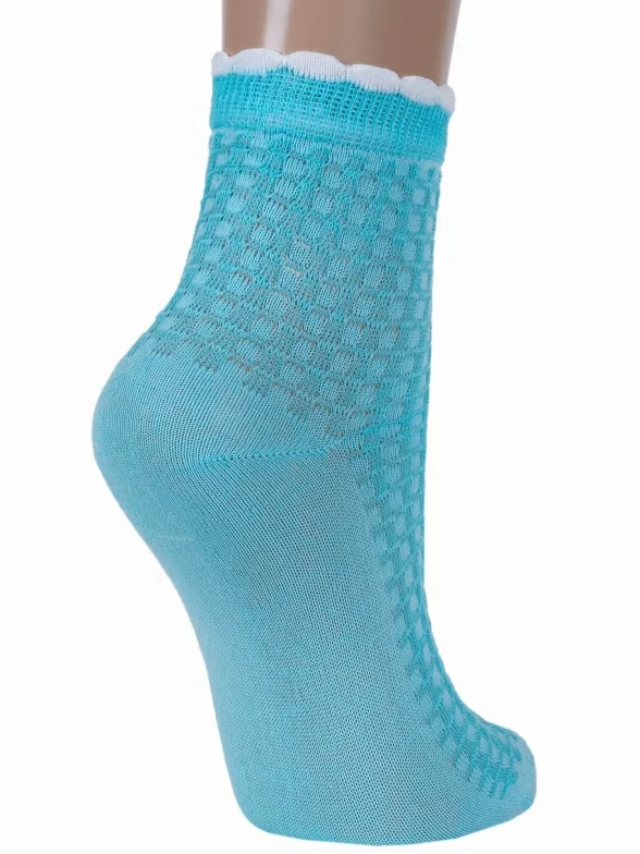 Летние укороченные детские носки, цвет бирюзовый, в сеточку, классические, шов обычный (не бесшовные), принт (рисунок): с узором, состав: 85% хлопок, 12% полиамид, 3% эластан, арт. 8С953. Производитель «АО Борисоглебский трикотаж, Воронежская обл, Россия» под брендом «Борисоглебский трикотаж».