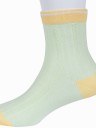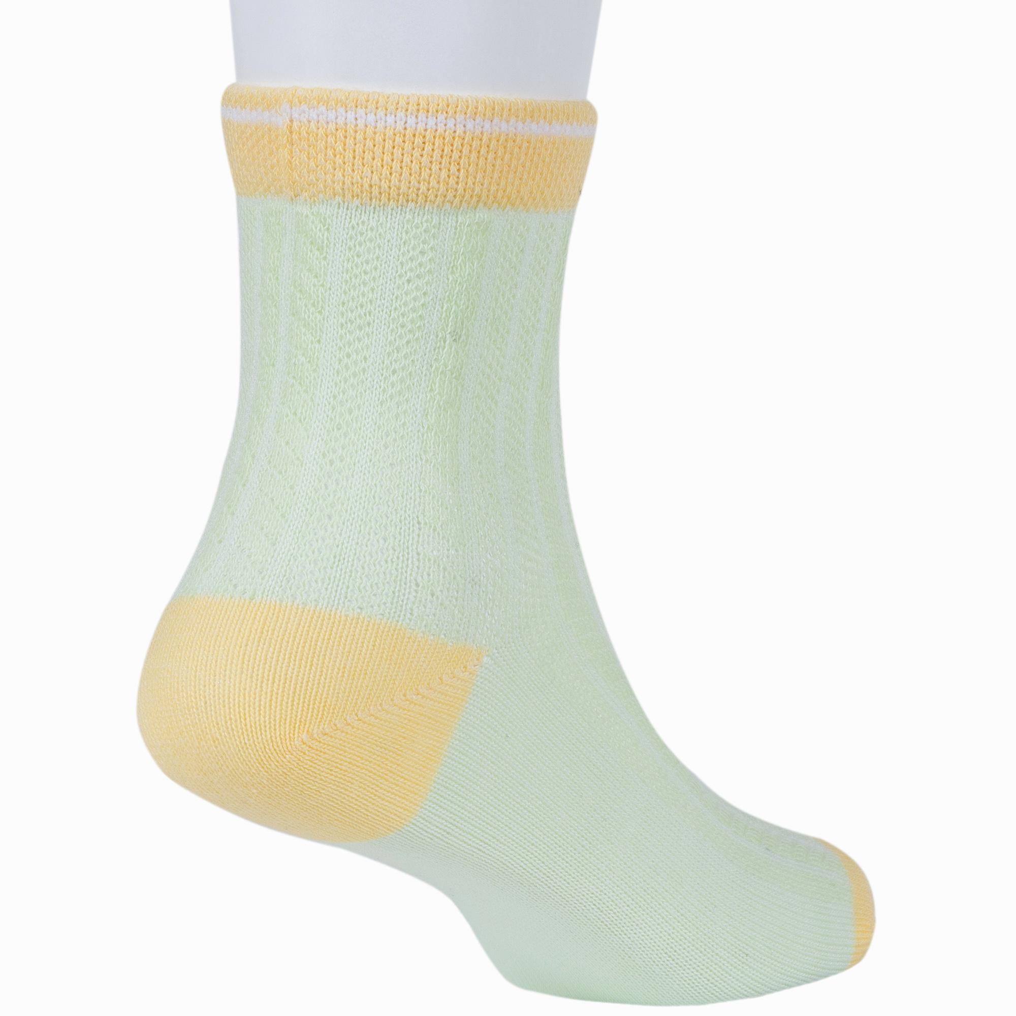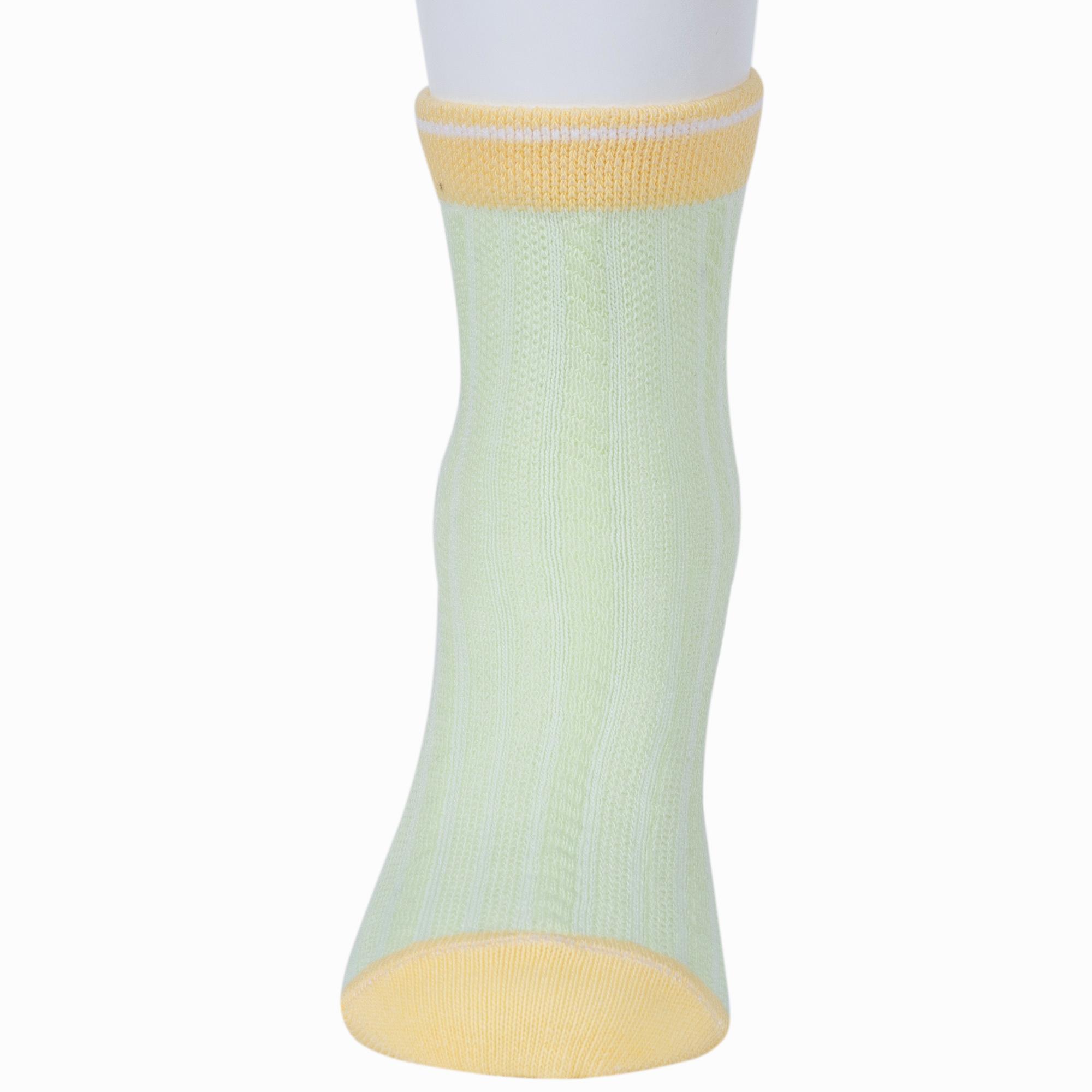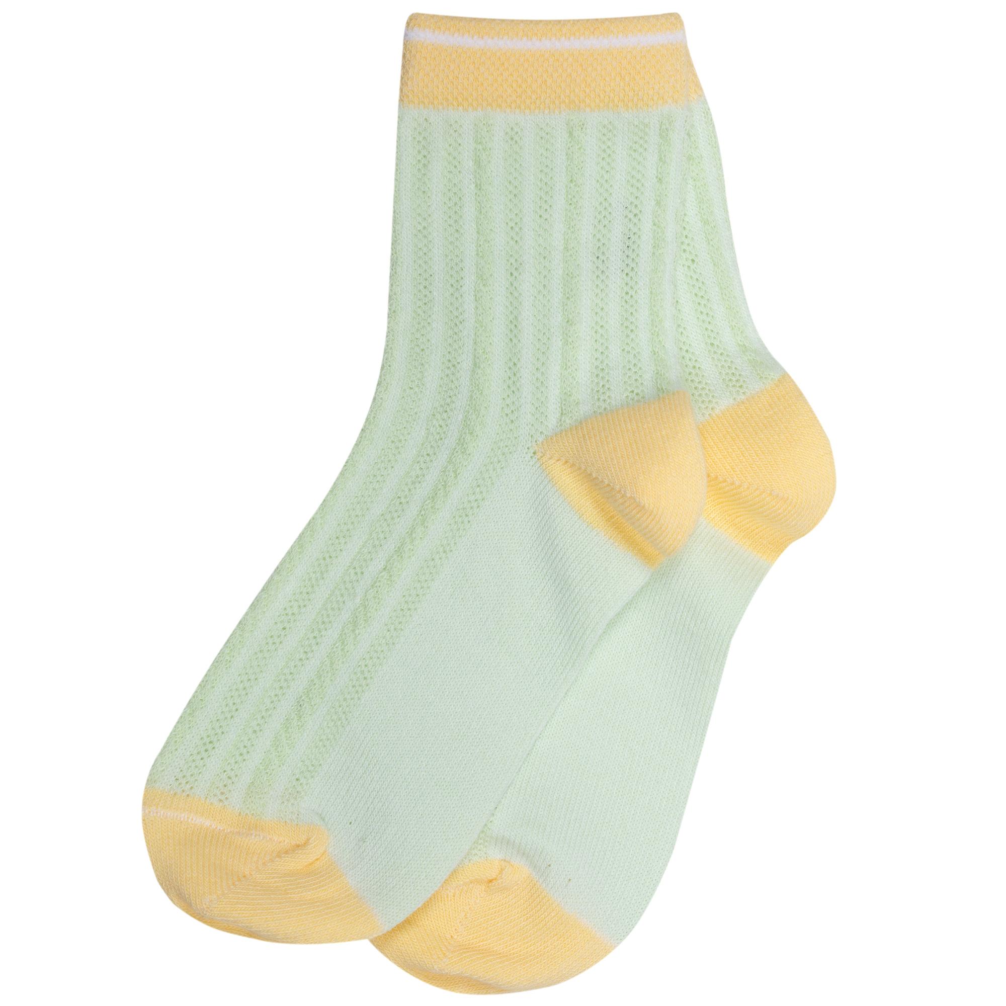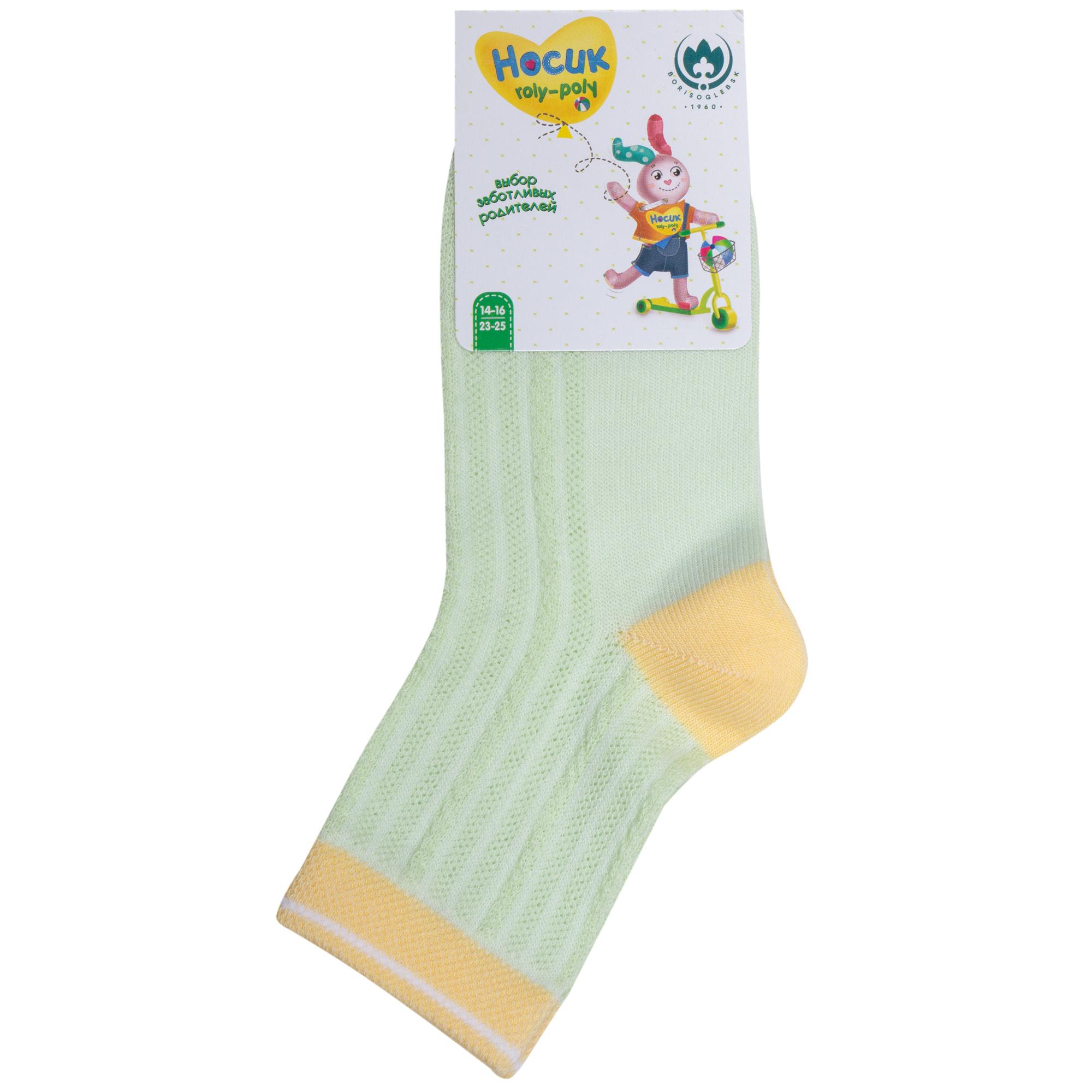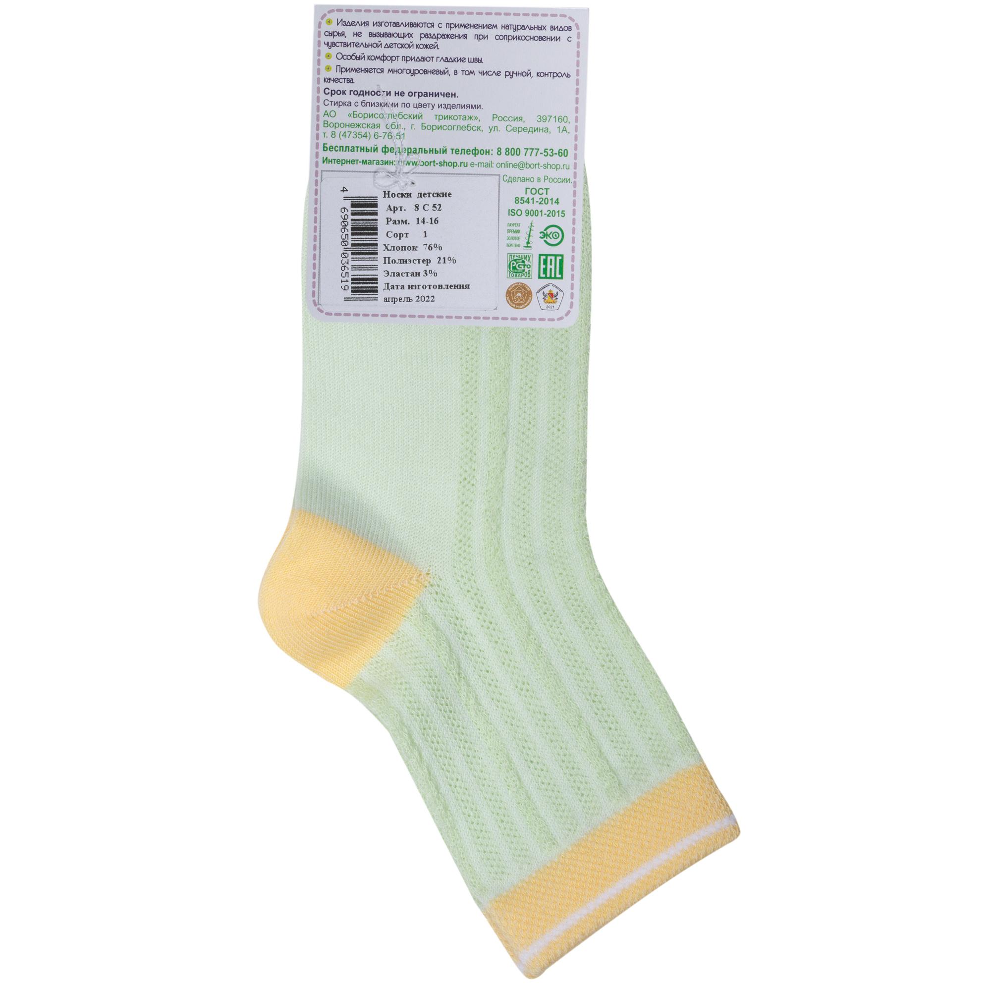 Летние укороченные детские носки, цвет салатовый, в сеточку, классические, шов обычный (не бесшовные), принт (рисунок): контрастные пятка / мысок / резинка, с узором, состав: 76% хлопок, 21% полиэстер, 3% эластан, арт. 8С52. Производитель «АО Борисоглебский трикотаж, Воронежская обл, Россия» под брендом «Борисоглебский трикотаж».