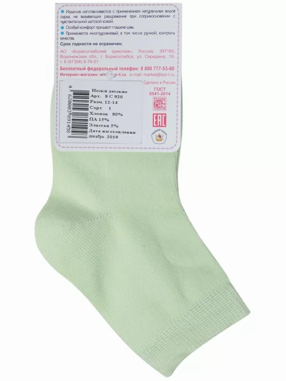 Круглогодичные укороченные детские носки, цвет салатовый, классические, шов обычный (не бесшовные), принт (рисунок): однотонный, без рисунков/узоров, состав: 80% хлопок, 15% полиамид, 5% эластан, арт. 8С920. Производитель «АО Борисоглебский трикотаж, Воронежская обл, Россия» под брендом «Борисоглебский трикотаж».