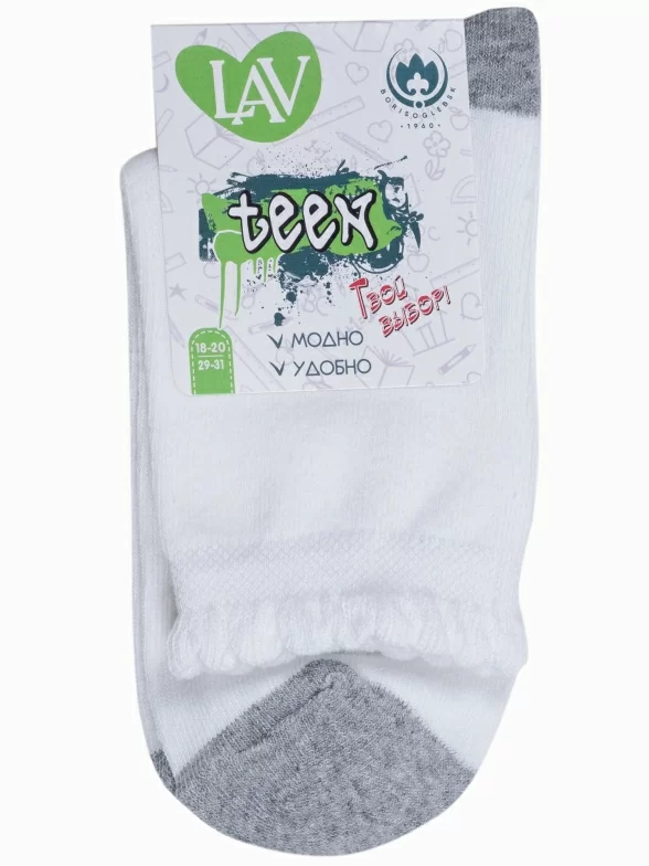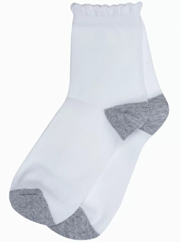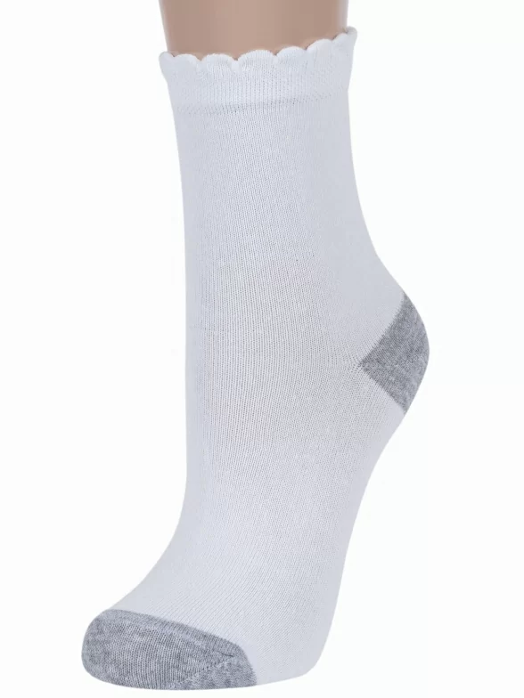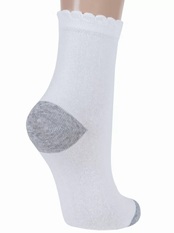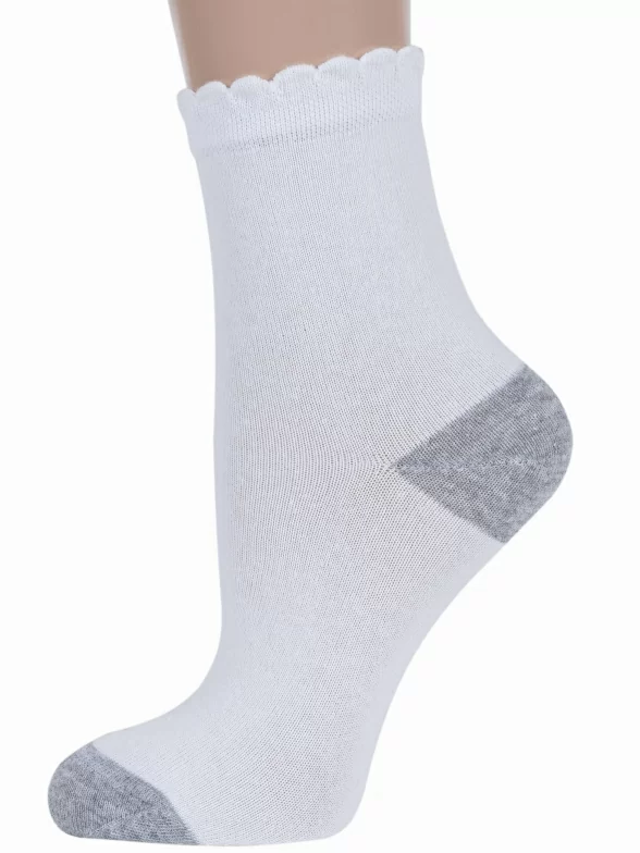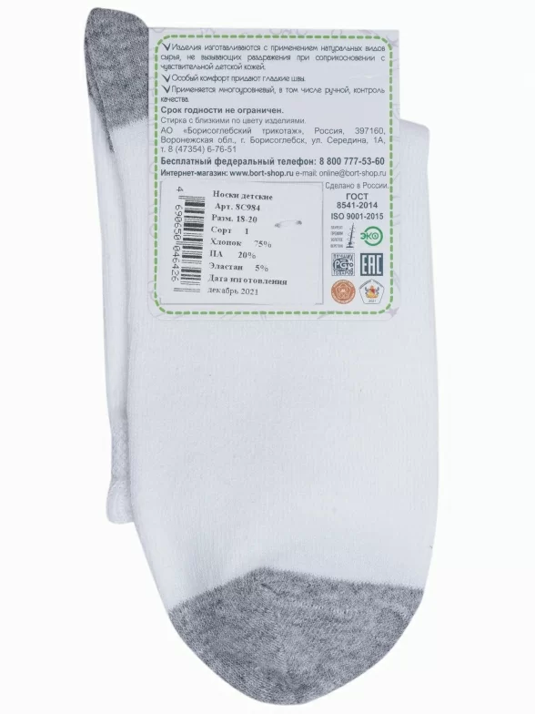 Круглогодичные укороченные детские носки, цвет белый, классические, шов обычный (не бесшовные), принт (рисунок): контрастные пятка / мысок / резинка, состав: 75% хлопок, 20% полиамид, 5% эластан, арт. 8С984. Производитель «АО Борисоглебский трикотаж, Воронежская обл, Россия» под брендом «Борисоглебский трикотаж».