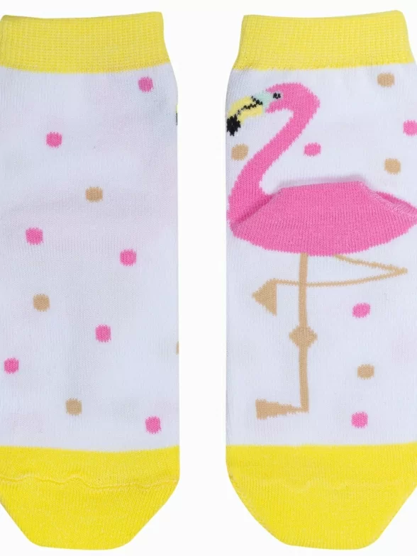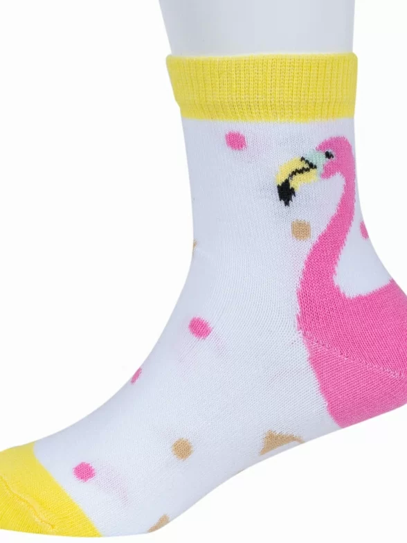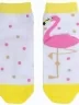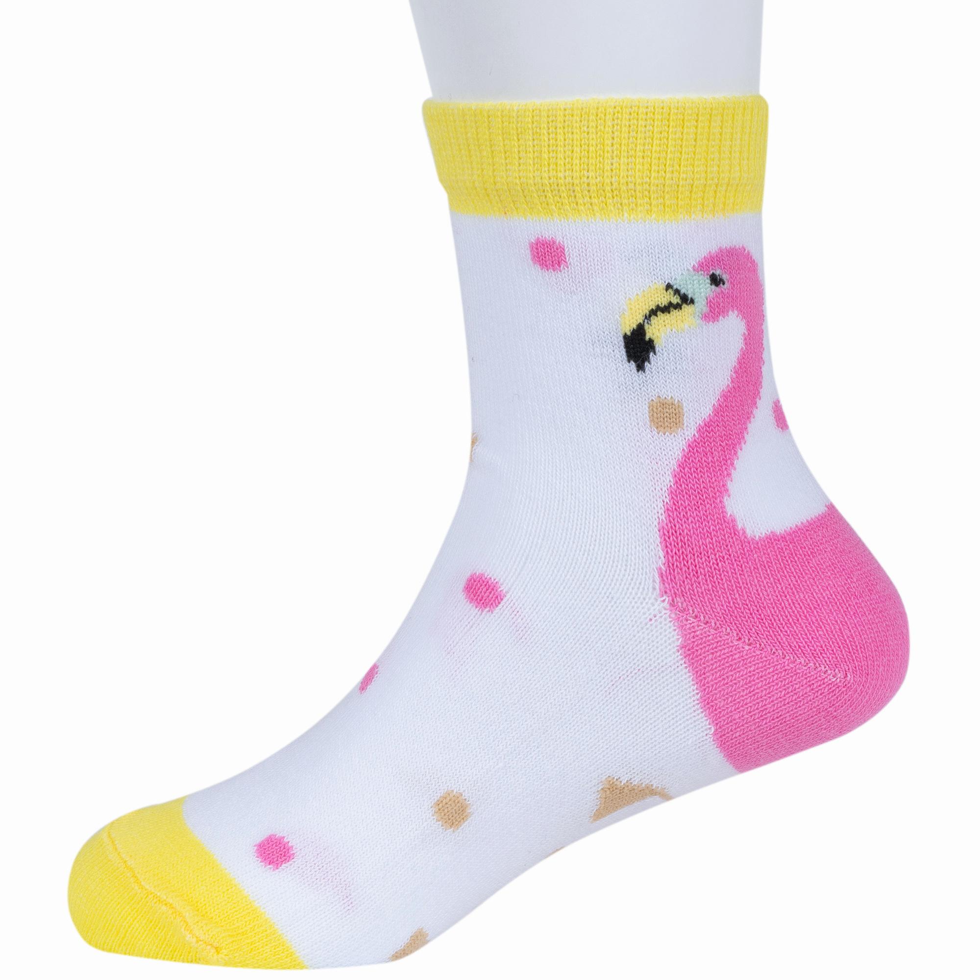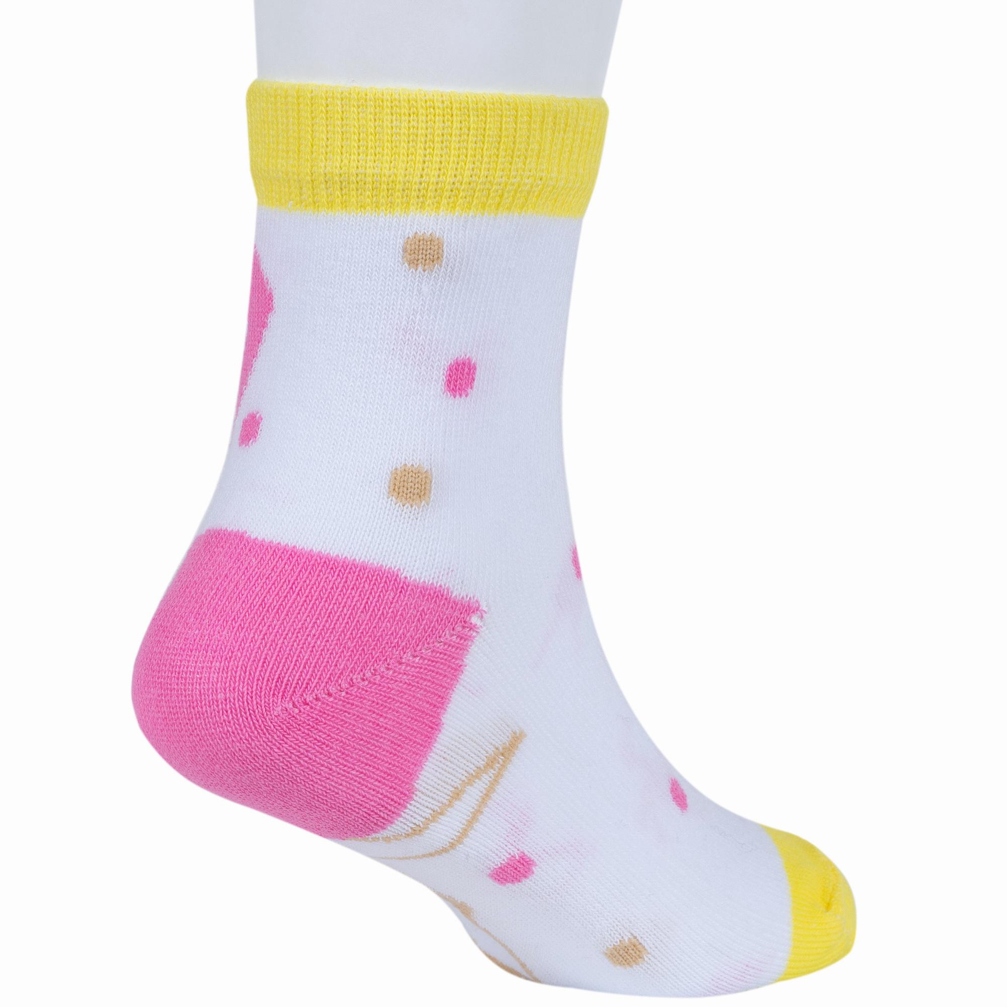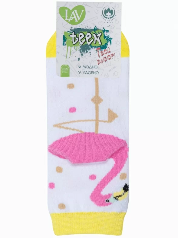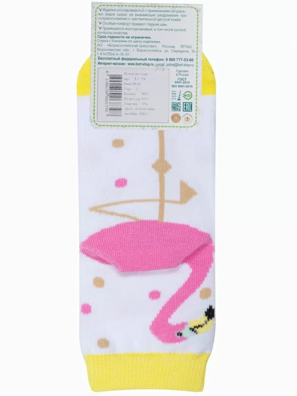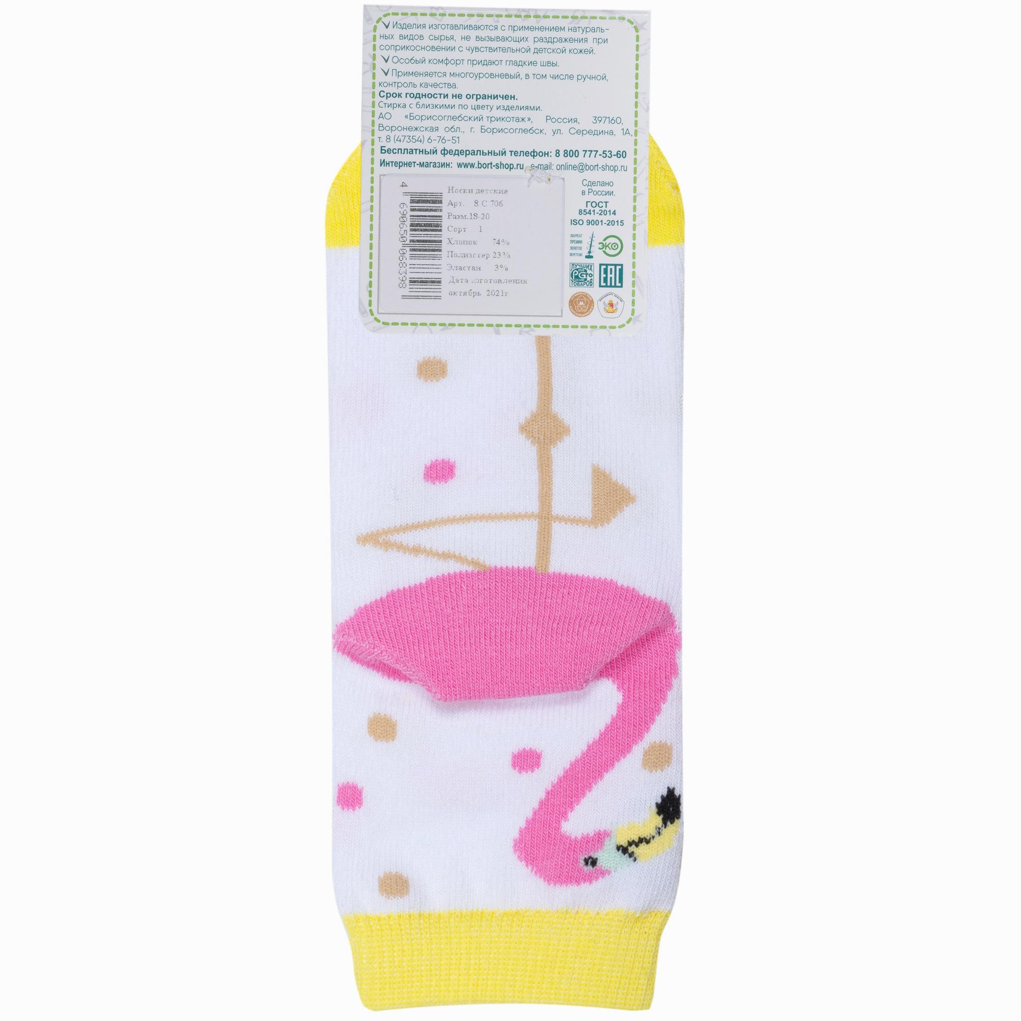 Круглогодичные укороченные детские носки, цвет многоцветные (мультиколор)-белый, повседневные, шов обычный (не бесшовные), принт (рисунок): животные, с узором, состав: 74% хлопок, 23% полиэстер, 3% эластан, арт. 8С706. Производитель «АО Борисоглебский трикотаж, Воронежская обл, Россия» под брендом «Борисоглебский трикотаж».