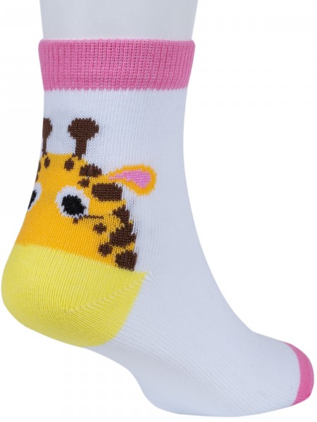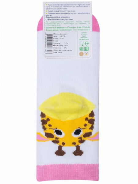 Круглогодичные укороченные детские носки, цвет многоцветные (мультиколор)-белый, повседневные, шов обычный (не бесшовные), принт (рисунок): животные, с узором, состав: 71% хлопок, 26% полиэстер, 3% эластан, арт. 8С709. Производитель «АО Борисоглебский трикотаж, Воронежская обл, Россия» под брендом «Борисоглебский трикотаж».
