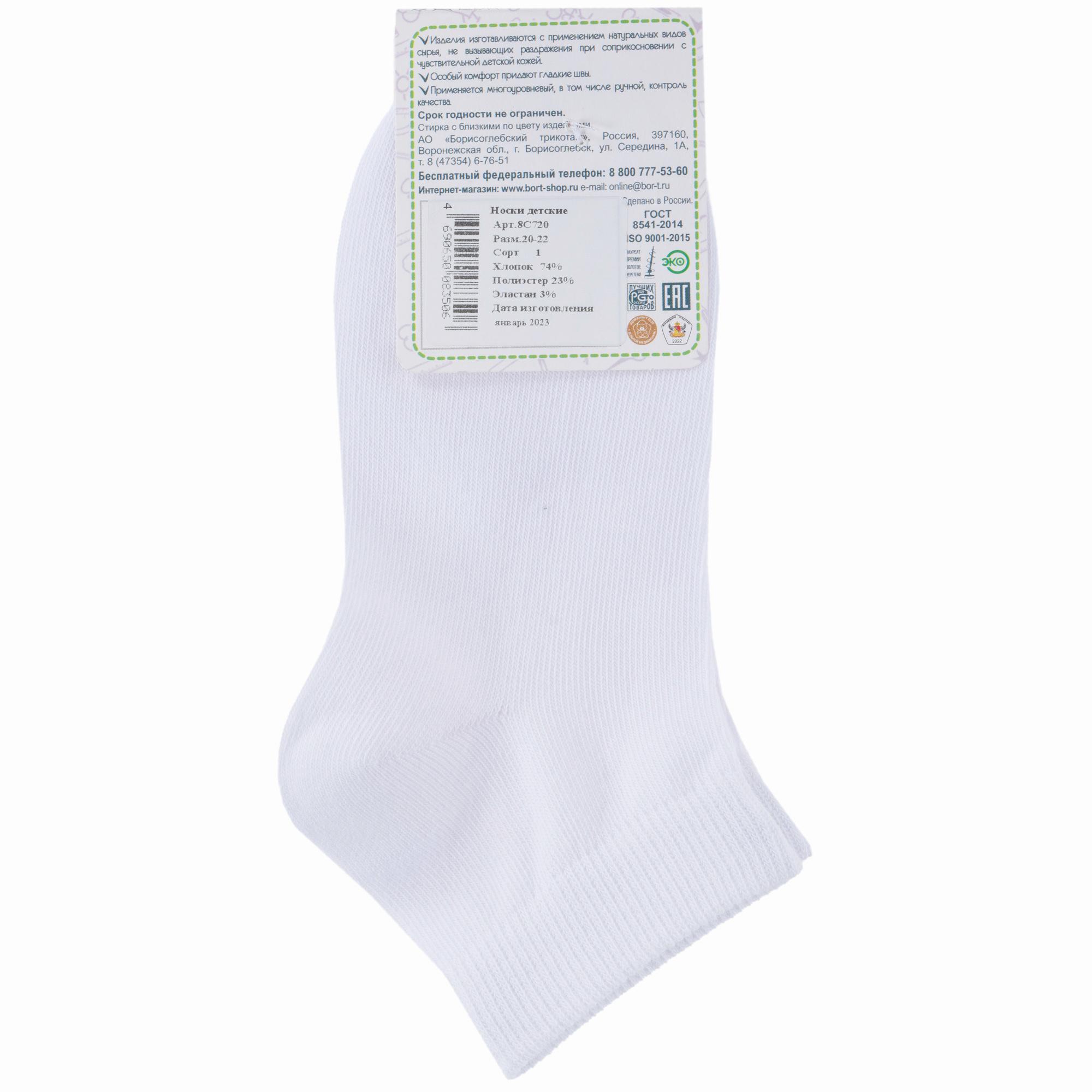 Круглогодичные короткие детские носки, цвет белый, классические, шов обычный (не бесшовные), принт (рисунок): без рисунков/узоров, однотонный, состав: 74% хлопок, 23% полиэстер, 3% эластан, арт. 8С720. Производитель «АО Борисоглебский трикотаж, Воронежская обл, Россия» под брендом «Борисоглебский трикотаж».