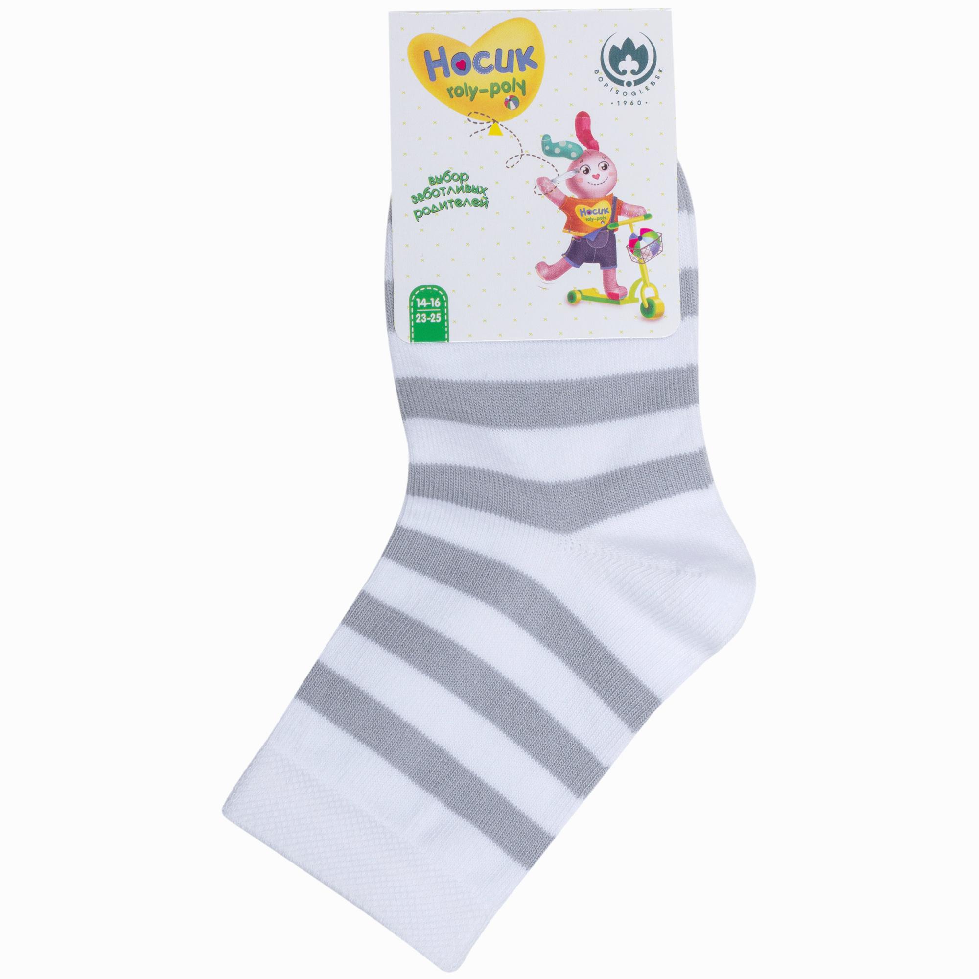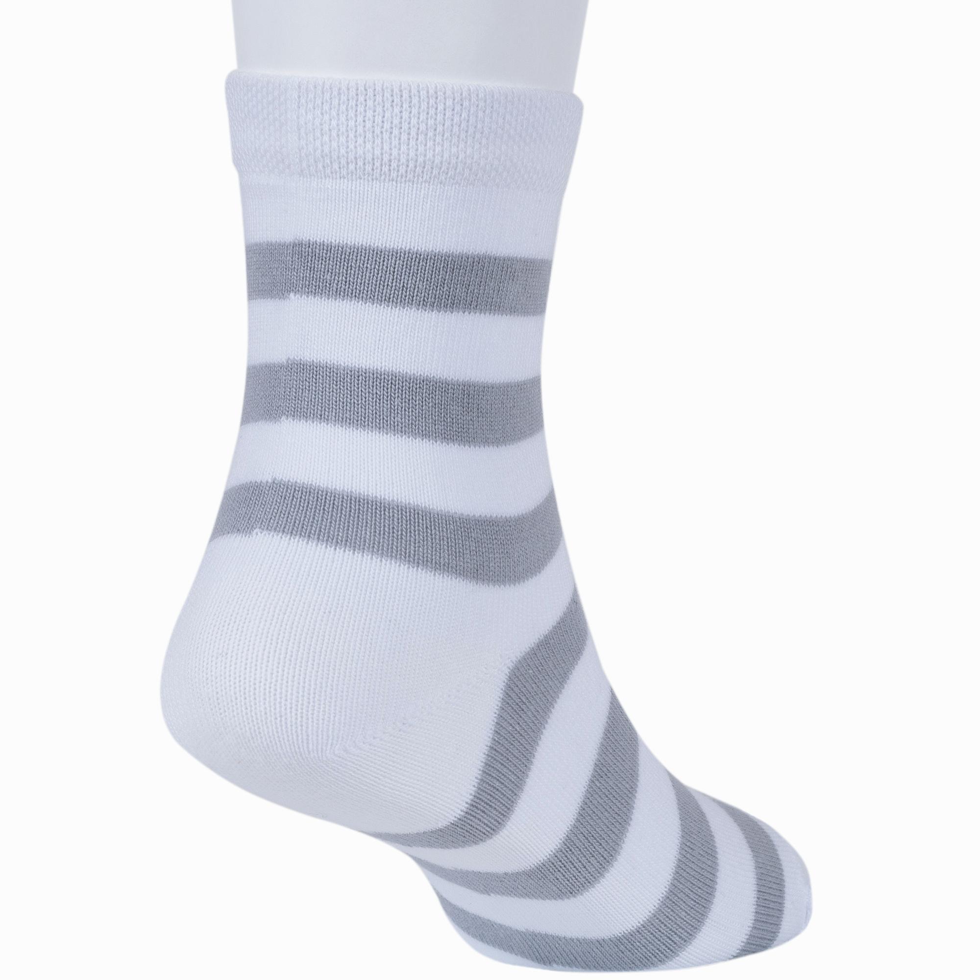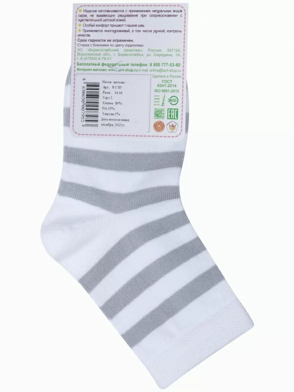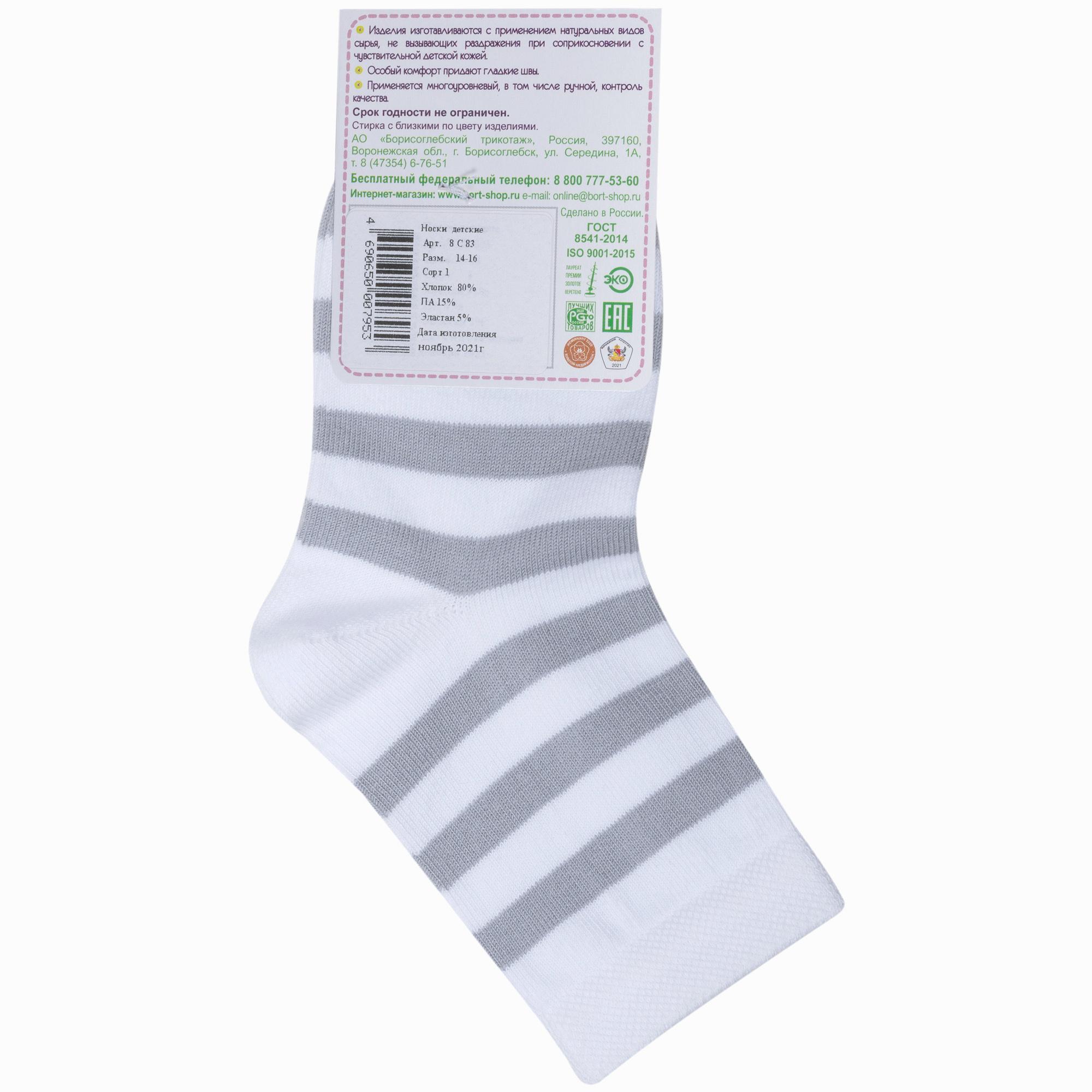 Круглогодичные укороченные детские носки, цвет белый, классические, шов обычный (не бесшовные), принт (рисунок): полоски, с узором, состав: 80% хлопок, 15% полиамид, 5% эластан, арт. 8С83. Производитель «АО Борисоглебский трикотаж, Воронежская обл, Россия» под брендом «Борисоглебский трикотаж».