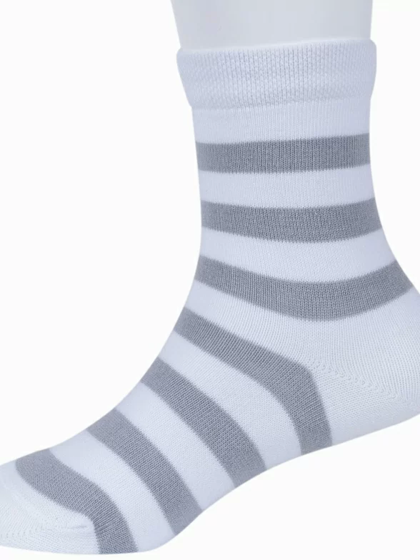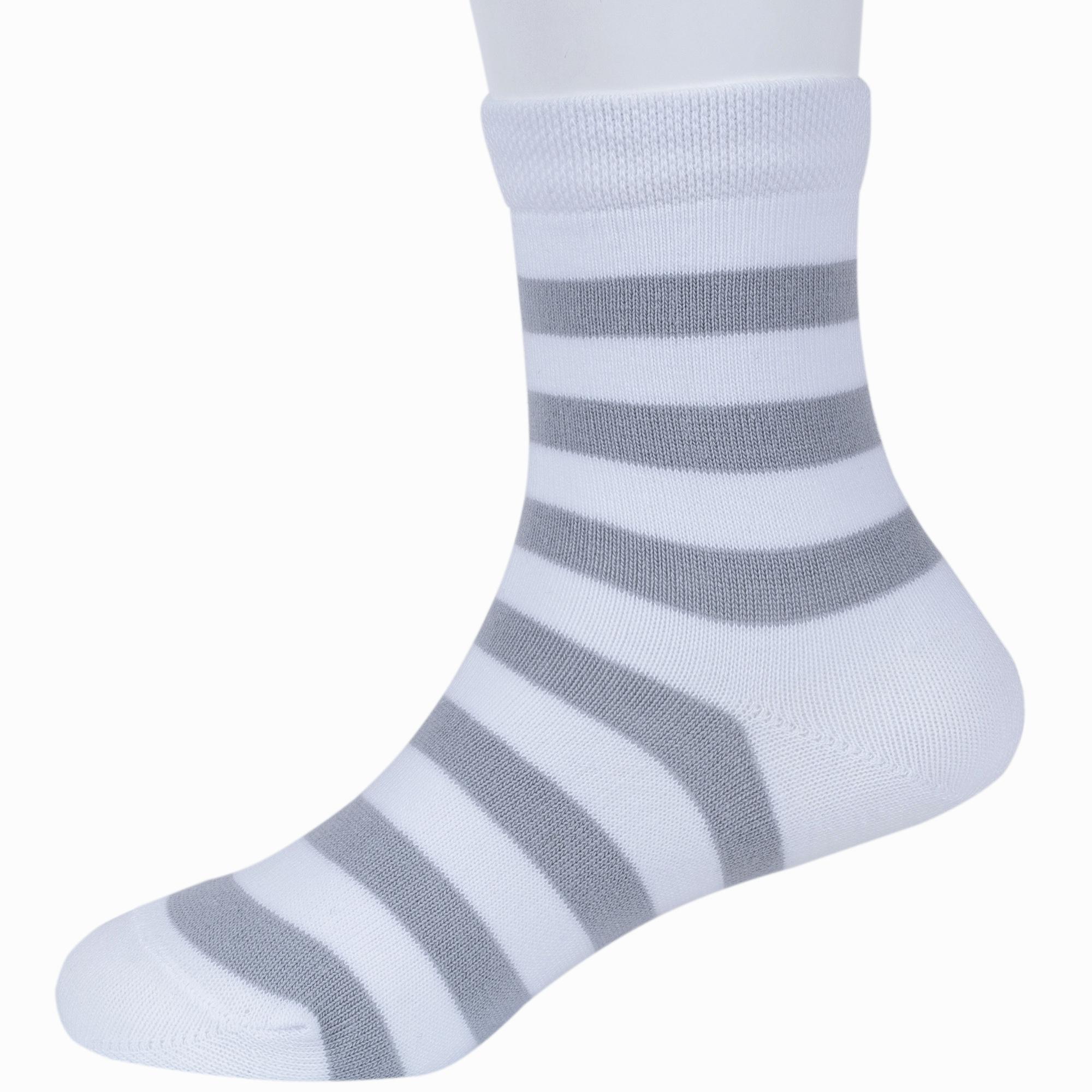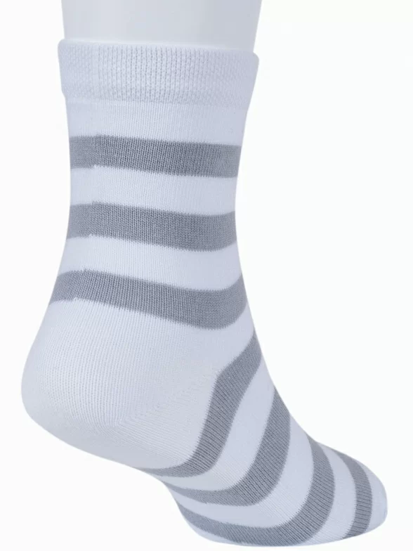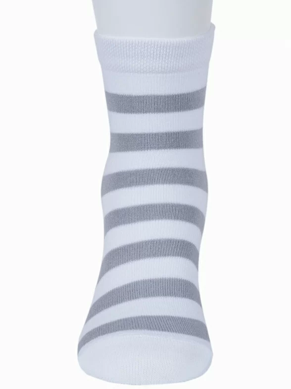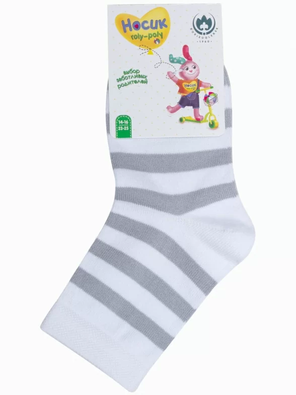 Круглогодичные укороченные детские носки, цвет белый, классические, шов обычный (не бесшовные), принт (рисунок): полоски, с узором, состав: 80% хлопок, 15% полиамид, 5% эластан, арт. 8С83. Производитель «АО Борисоглебский трикотаж, Воронежская обл, Россия» под брендом «Борисоглебский трикотаж».