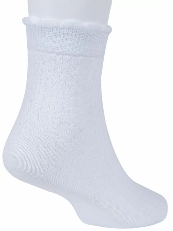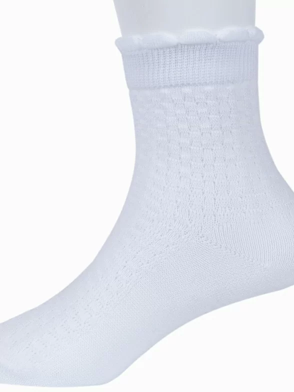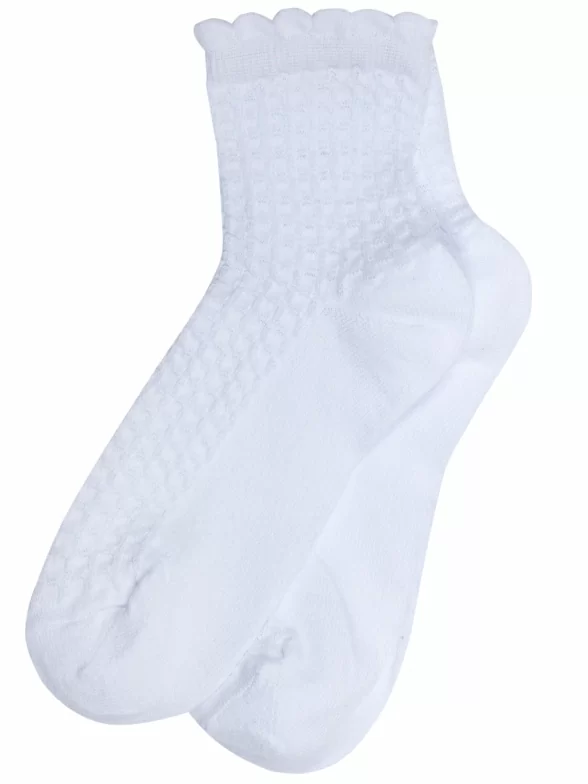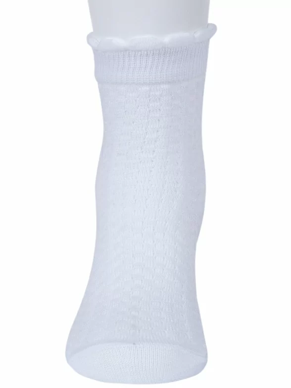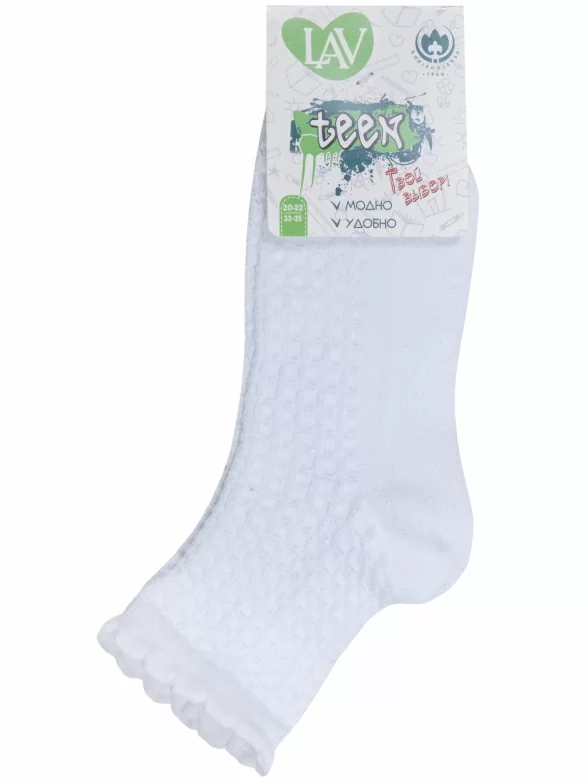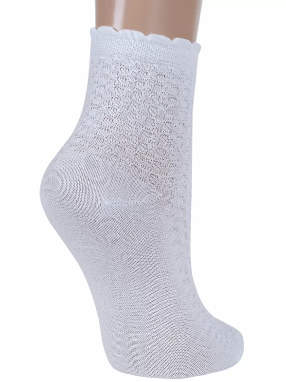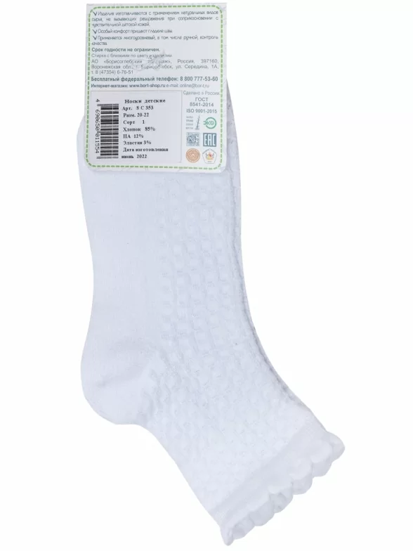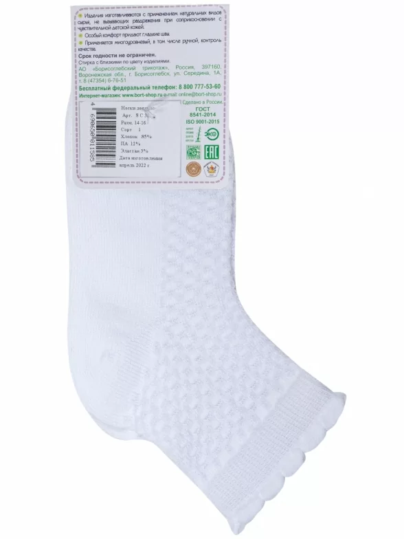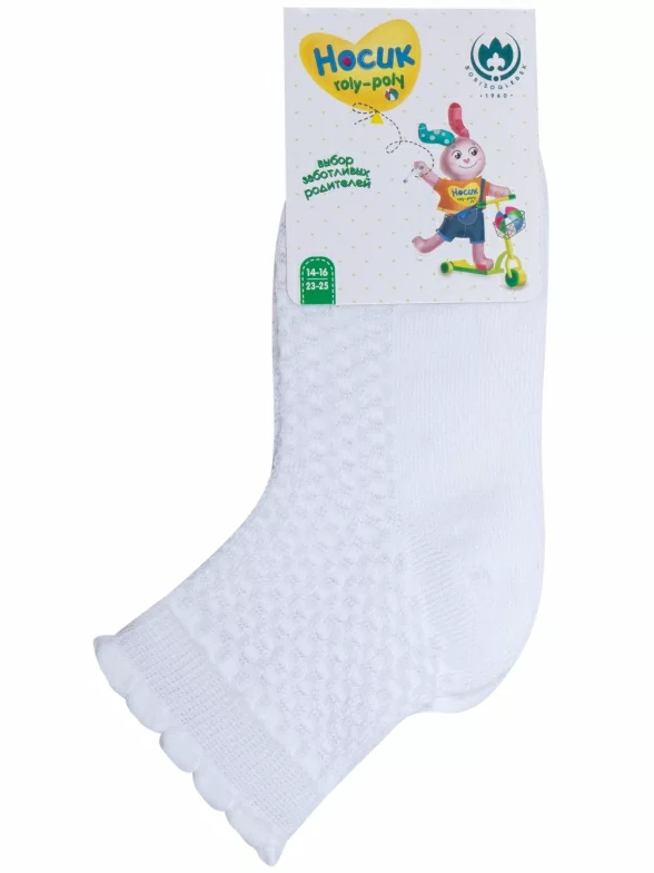 Летние укороченные детские носки, цвет белый, в сеточку, классические, шов обычный (не бесшовные), принт (рисунок): с узором, состав: 85% хлопок, 12% полиамид, 3% эластан, арт. 8С353. Производитель «АО Борисоглебский трикотаж, Воронежская обл, Россия» под брендом «Борисоглебский трикотаж».