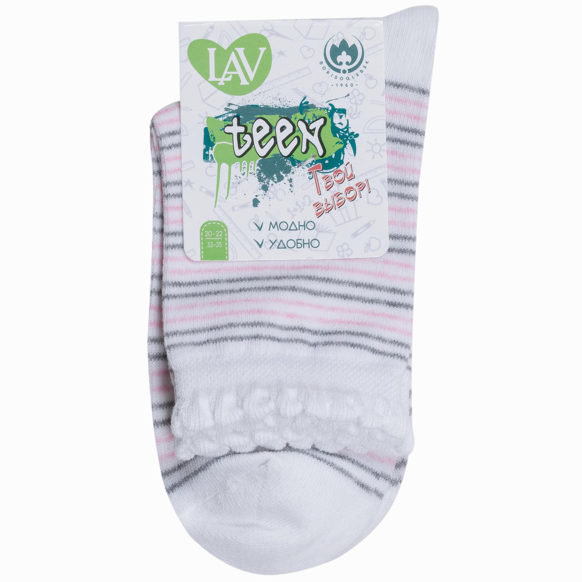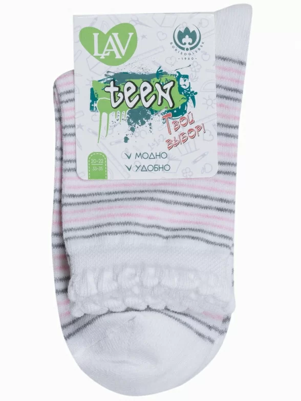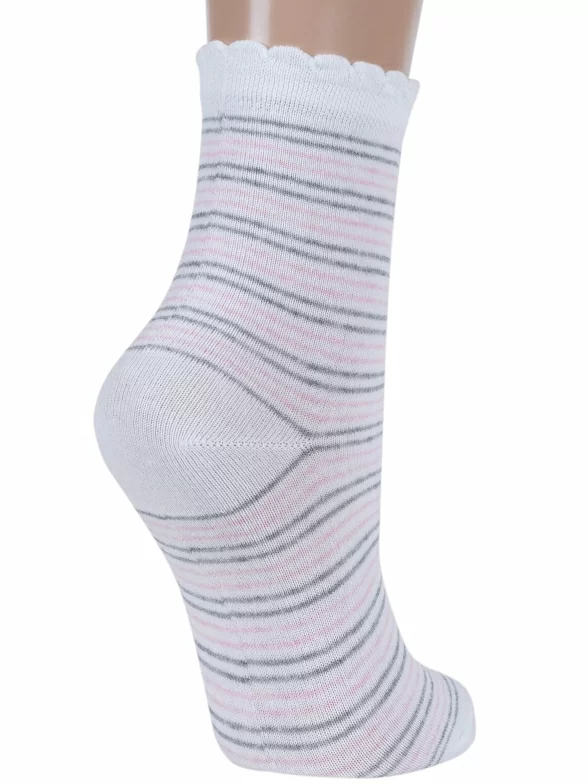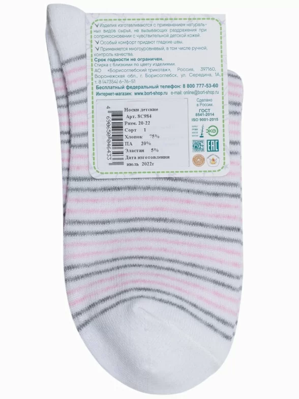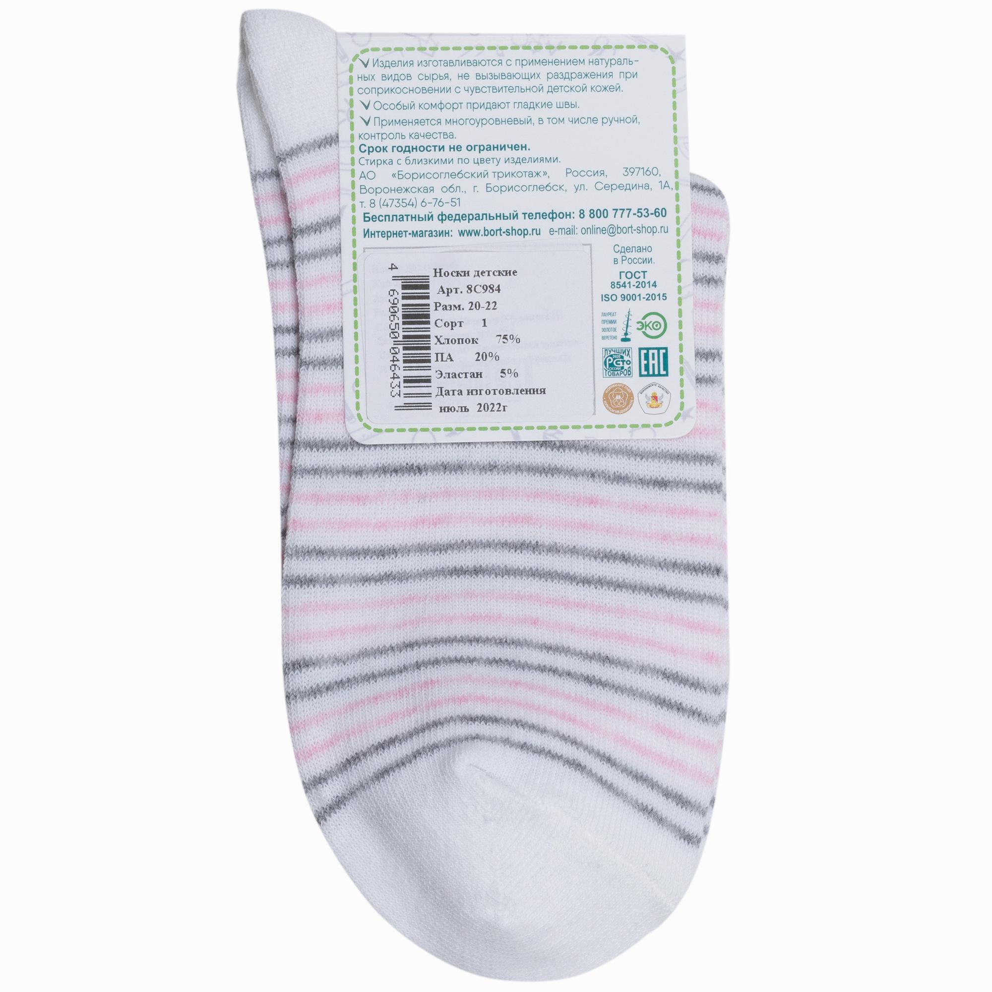 Круглогодичные укороченные детские носки, цвет белый, классические, шов обычный (не бесшовные), принт (рисунок): полоски, с узором, состав: 75% хлопок, 20% полиамид, 5% эластан, арт. 8С984. Производитель «АО Борисоглебский трикотаж, Воронежская обл, Россия» под брендом «Борисоглебский трикотаж».